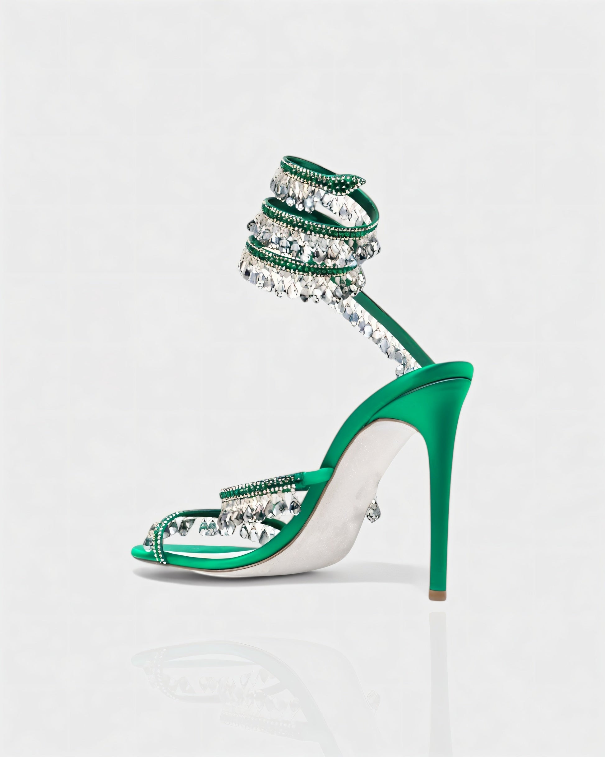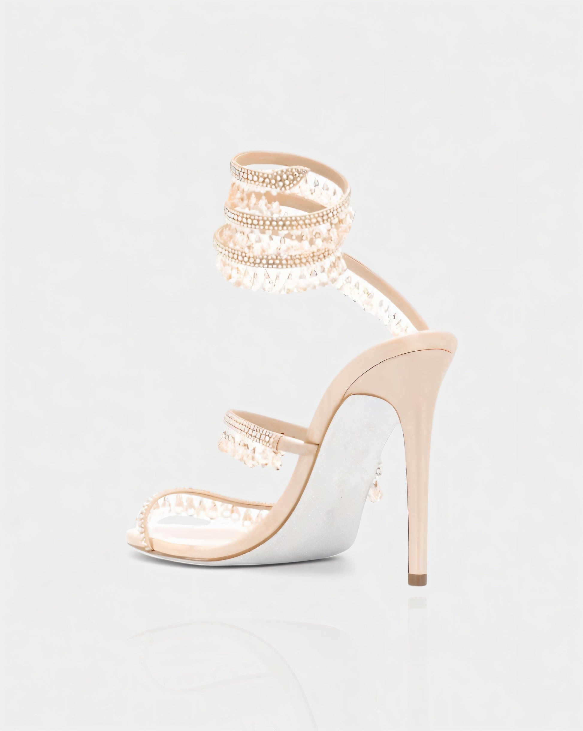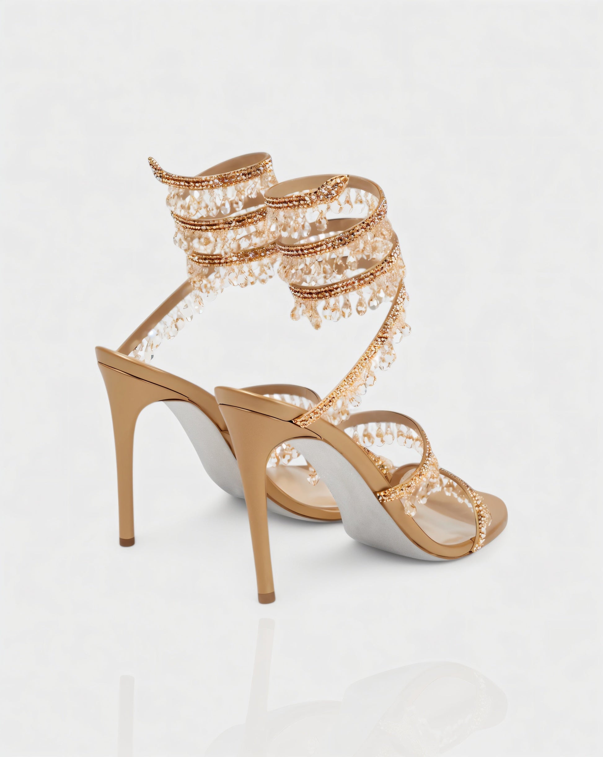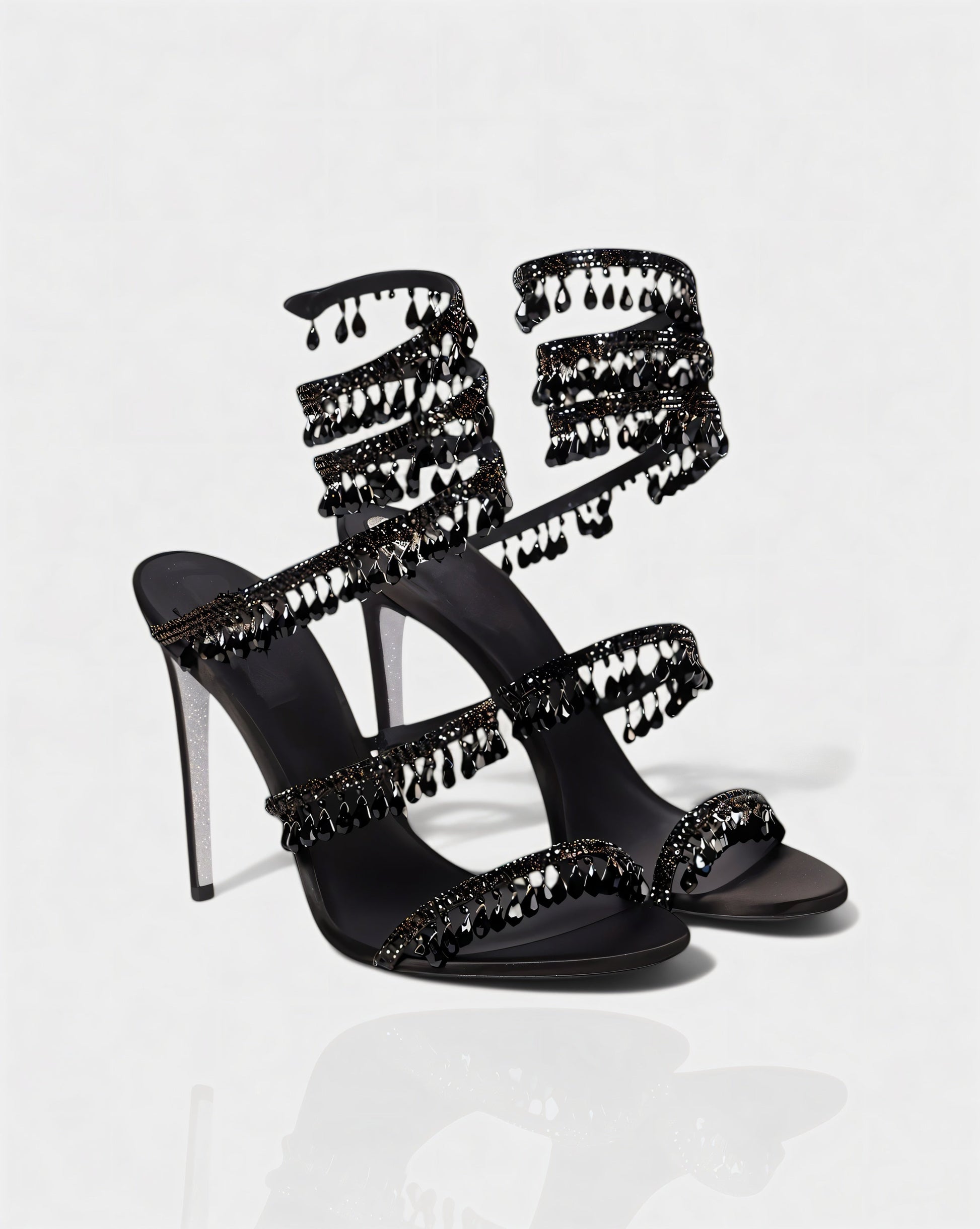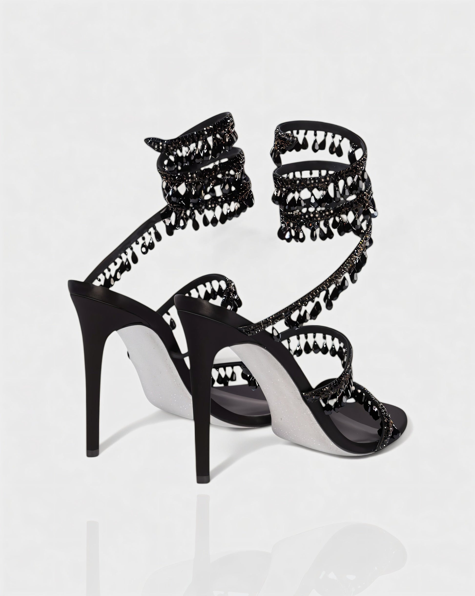 The Alyra Heels are a show-stopping design made to dazzle. Featuring multiple wraparound straps embellished with sparkling crystals and dangling gem details, they bring striking movement and shine with every step. Set on a sleek stiletto heel, this pair perfectly balances bold glamour with elegant sophistication.