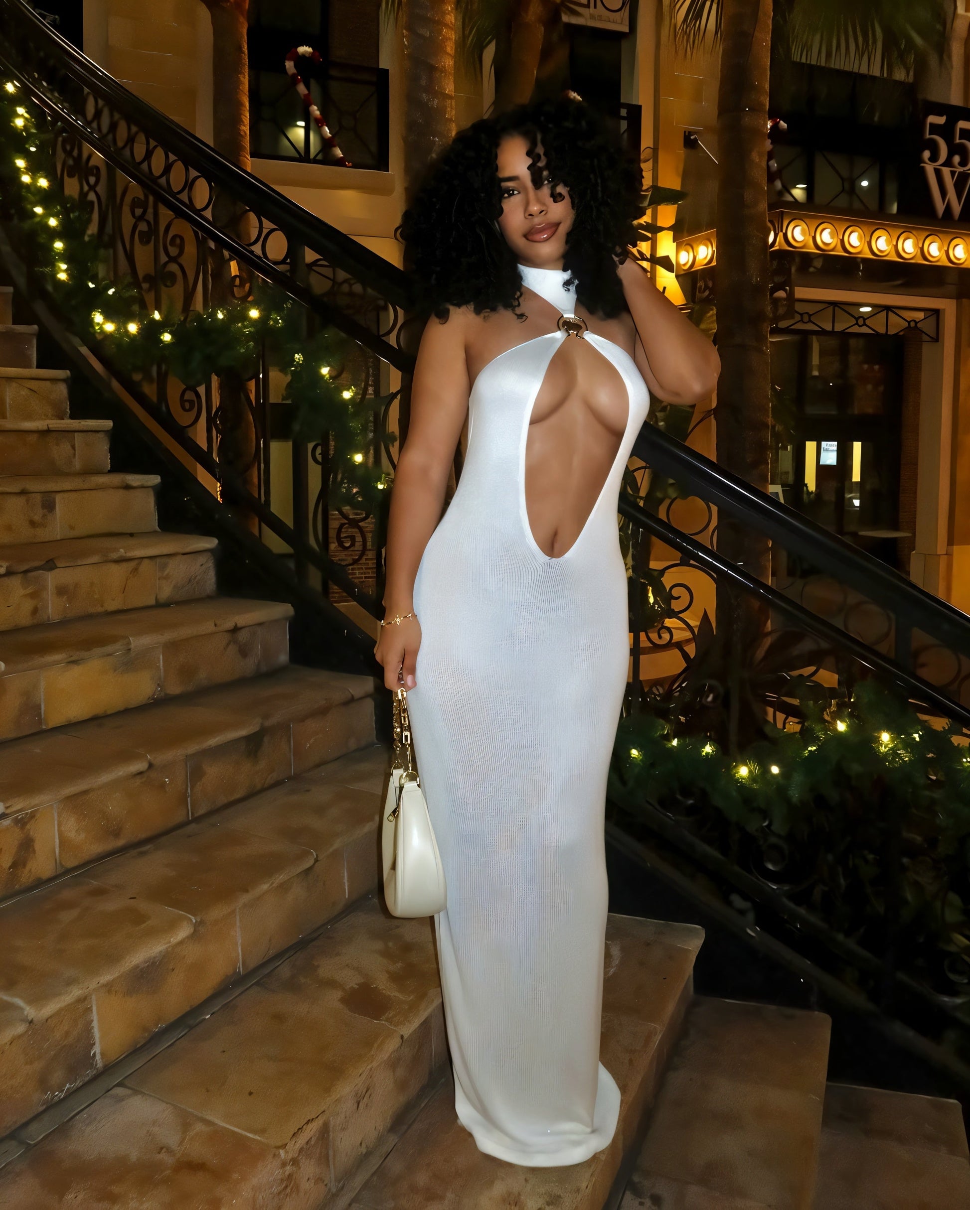 Designed with a striking halter neckline that ties at the neck, this piece features a deep plunge front that’s framed with a luxe gold-tone ring, creating an eye-catching focal point. The soft, stretchy fabric hugs every curve effortlessly, while the floor-length cut elongates your figure.