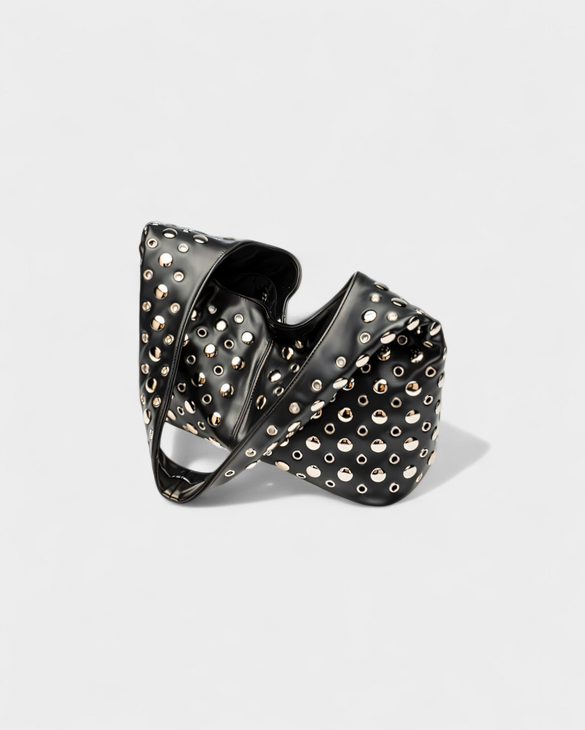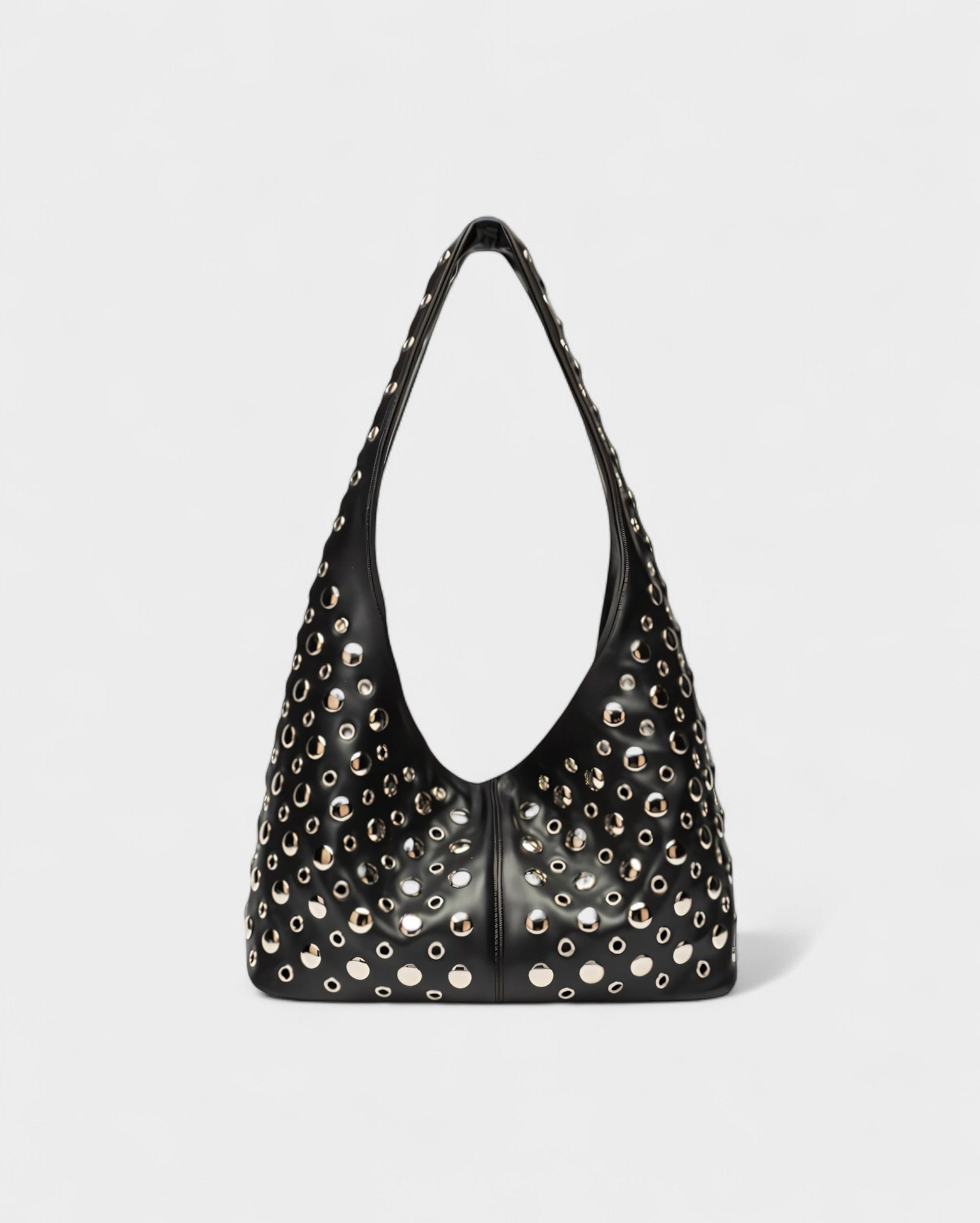 The Arla bag is a bold shoulder piece designed with a slouchy silhouette and a single wide strap for an effortless carry. Its exterior is covered in metallic grommet studs of varying sizes, giving it a striking, edgy finish. Spacious and practical while maintaining its statement appeal, this bag perfectly balances functionality with standout design.