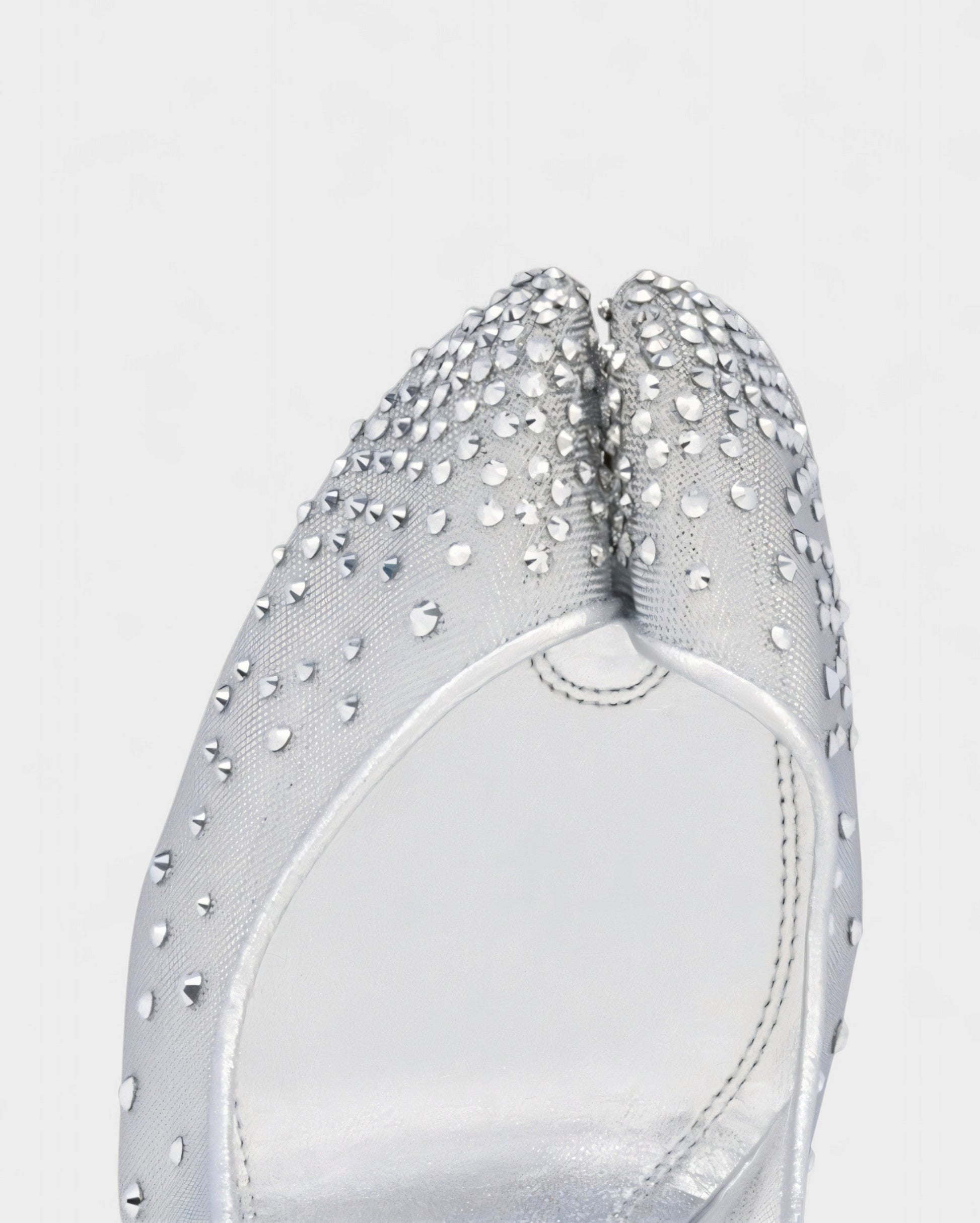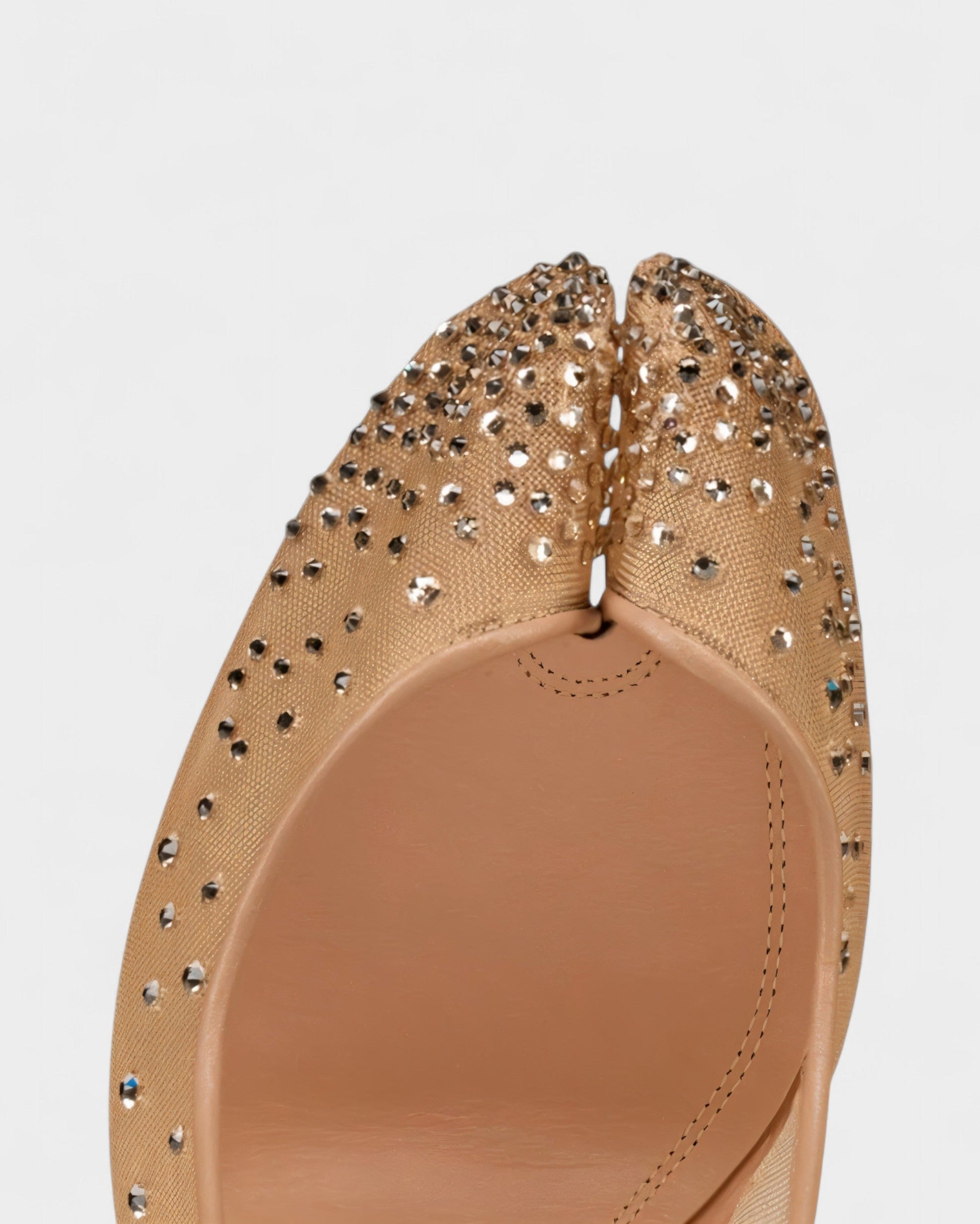 These elegant black heels feature a unique split-toe design embellished with shimmering crystals that taper toward the heel. Crafted from sheer black mesh with glossy accents, they balance modern edge and refined glamour. The stiletto heel elongates the leg, while the iconic red sole adds a bold, luxurious finish.