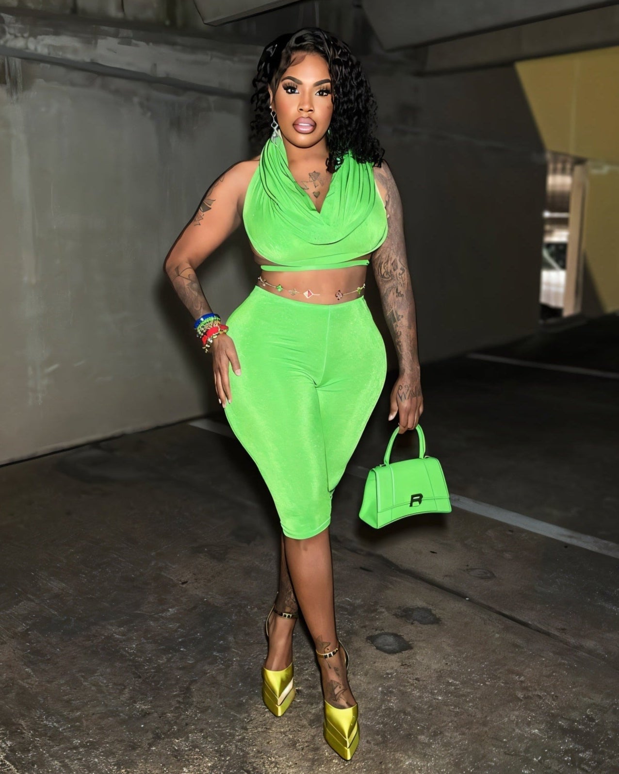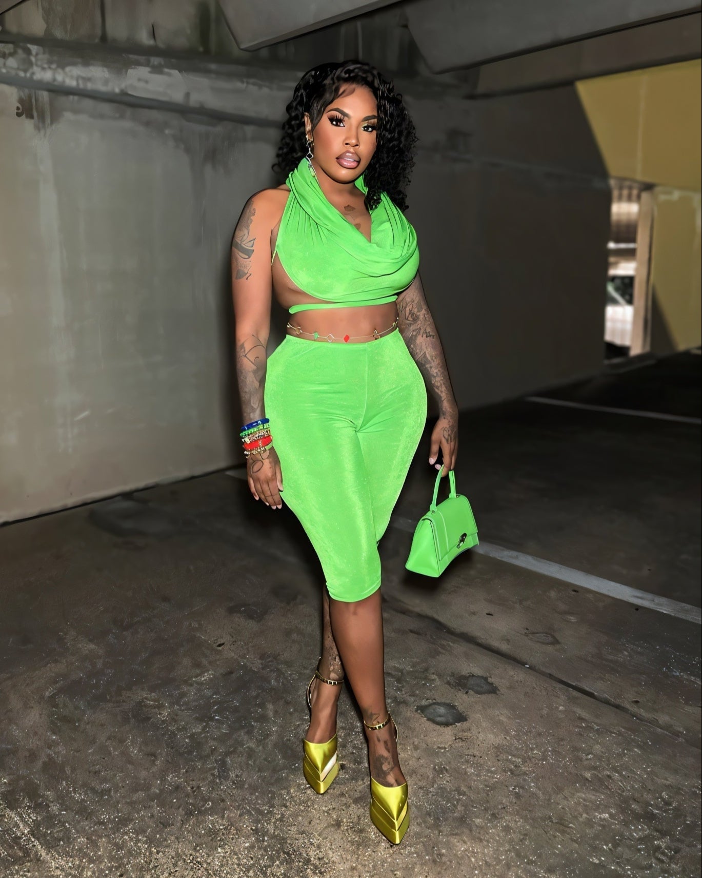 The Azalea Set takes streetwear to a new level with a bold neon hue, a draped cowl hooded top, and curve-contouring capri pants. The cropped top brings drama with an oversized hood and criss-cross wrap ties that snatch the waist. The high-waisted capris sculpt the body with a sleek, second-skin fit that moves with you.