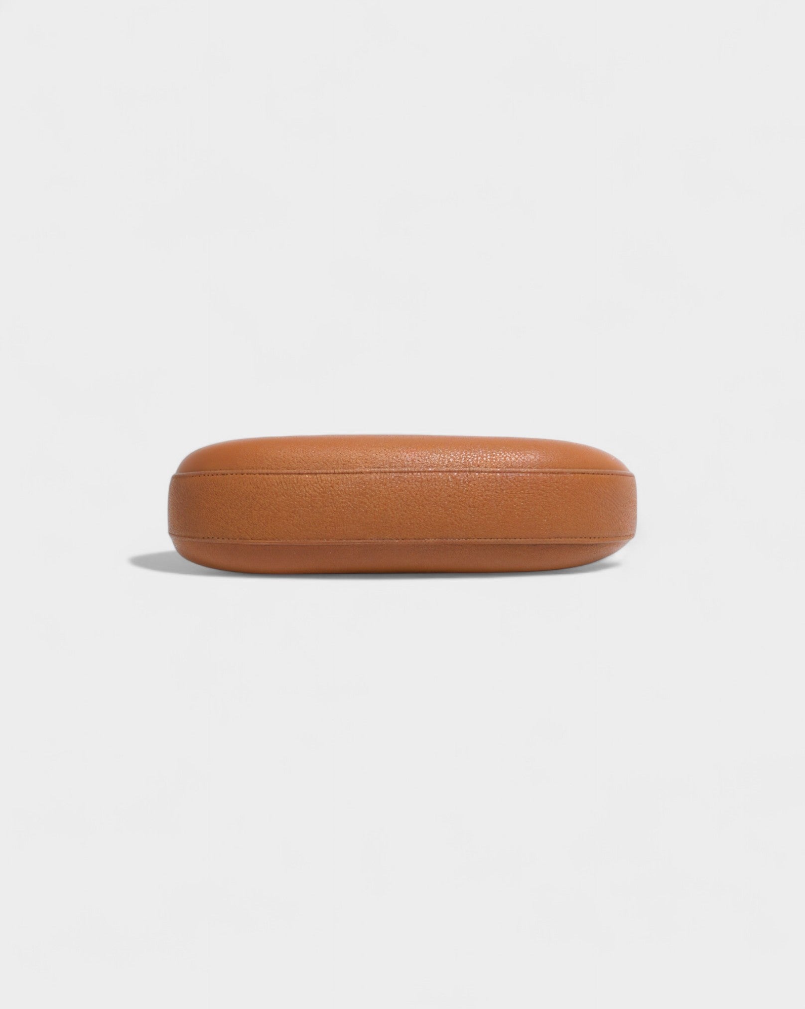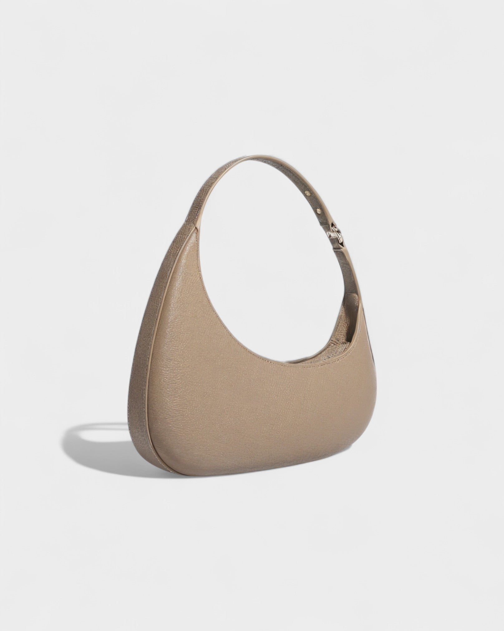 The Belvia Bag is the definition of sleek minimalism. Crafted in smooth leather, its curved crescent silhouette sits neatly under the arm with a fixed strap. A secure zip-top opens to a lined interior with slip pockets, making it as functional as it is refined.