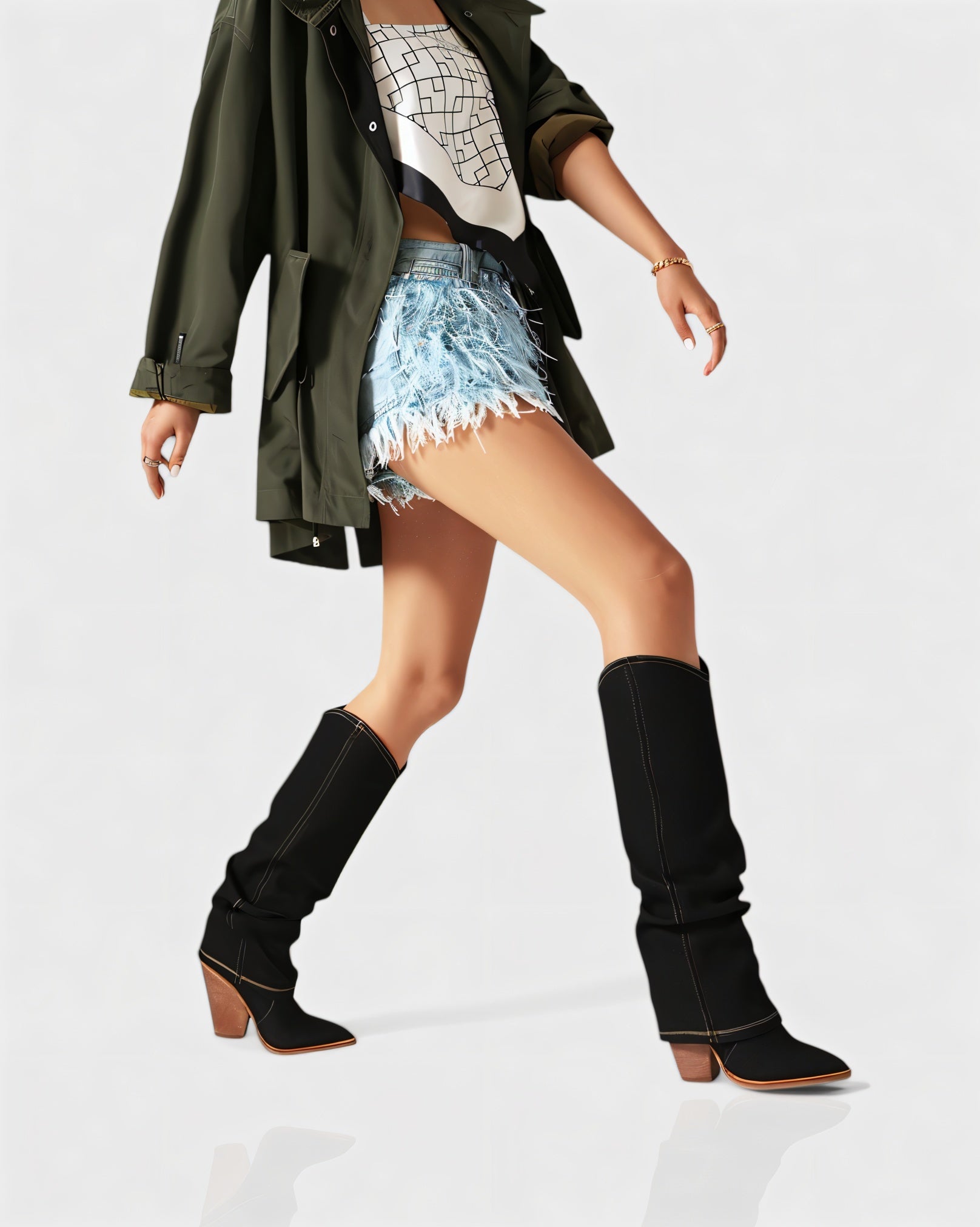 Rethink western in the Betty cowboy boots. Featuring a classic slouchy calf fit and a sleek pointed toe, these boots are crafted from a soft denim fabric for a modern twist. The stacked wood-look heel adds a rustic touch, making them the perfect blend of country and cool.