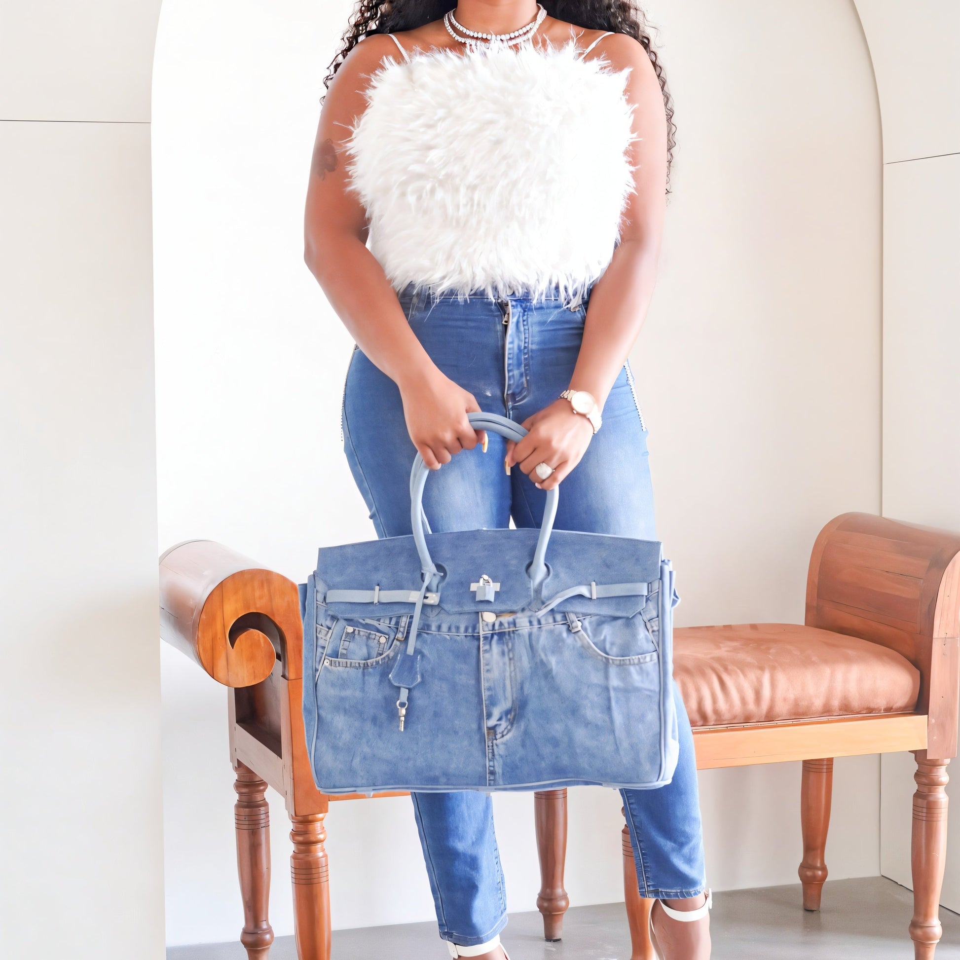 The Birke bag redefines classic structure with a denim-inspired twist. Designed with bold top handles, front belt detailing, and functional metal accents, it features playful stitched pockets and seam lines that mimic your favorite pair of jeans.