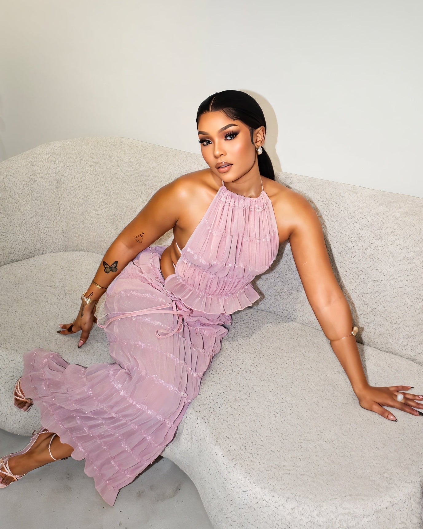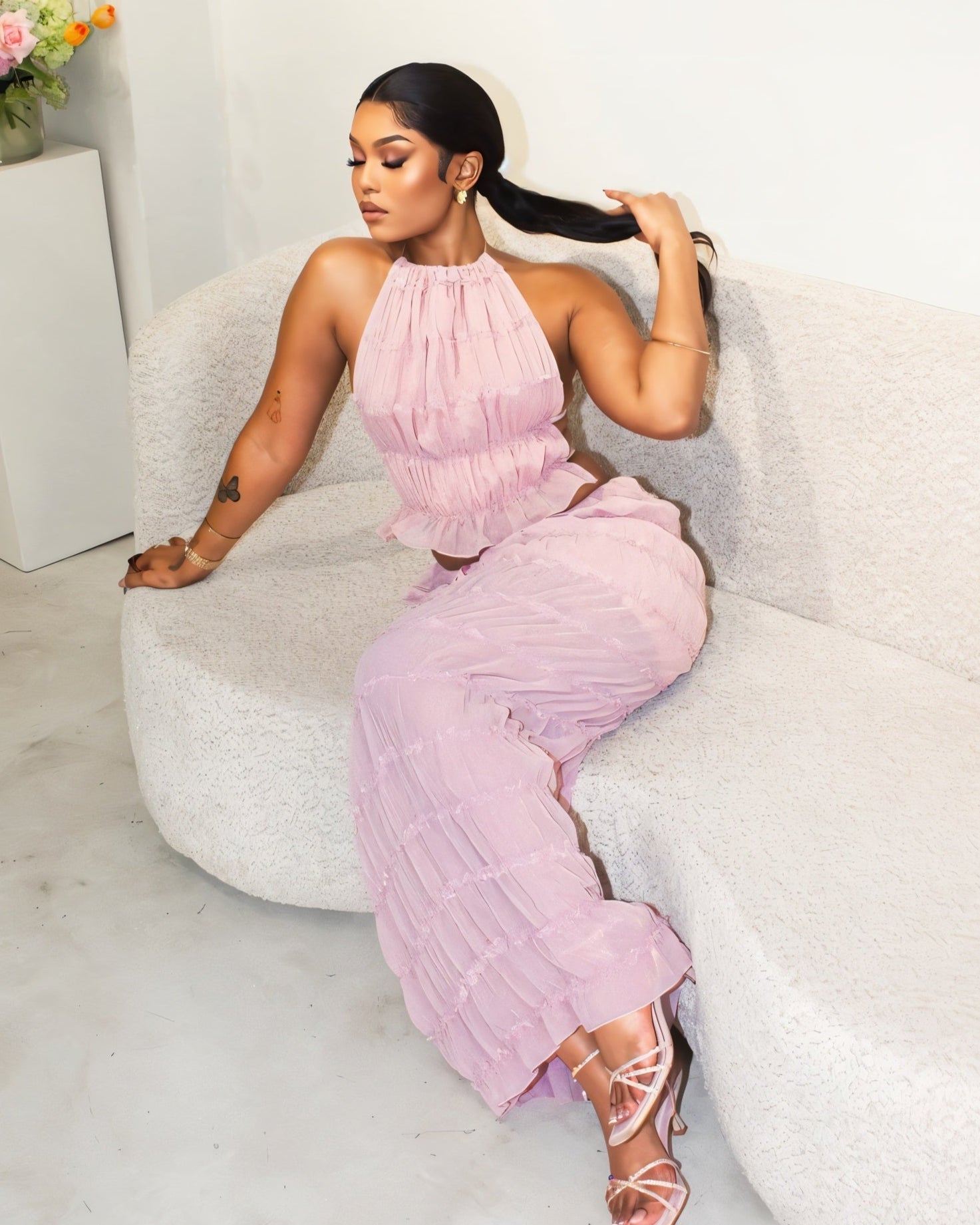 Soft, sheer, and made to stun. This Christine dreamy halter top ties at the neck and back, featuring flirty ruching that flows right into a matching body-skimming maxi skirt. Light pleats and tiered texture add movement, while the sheer fabric keeps it sultry.