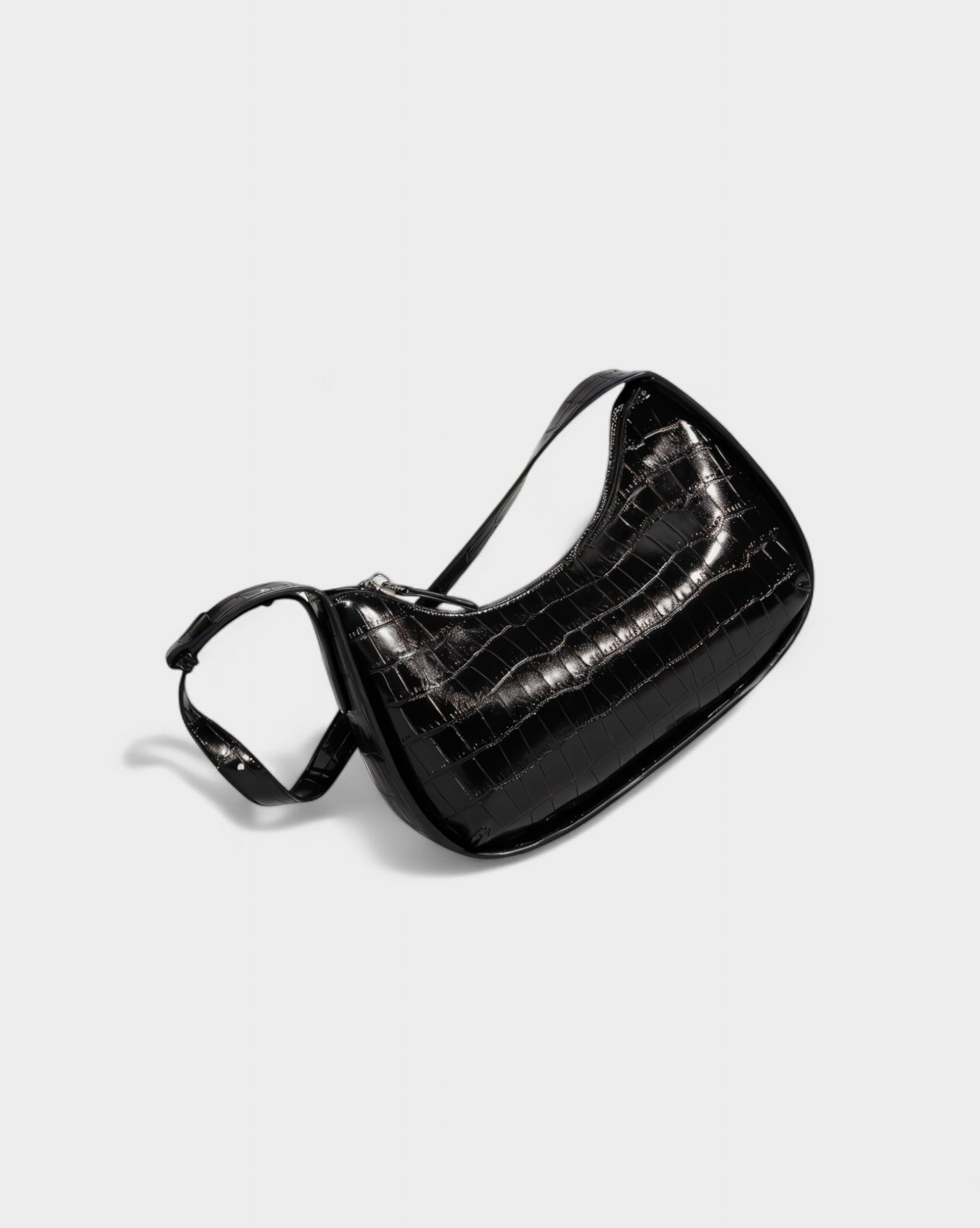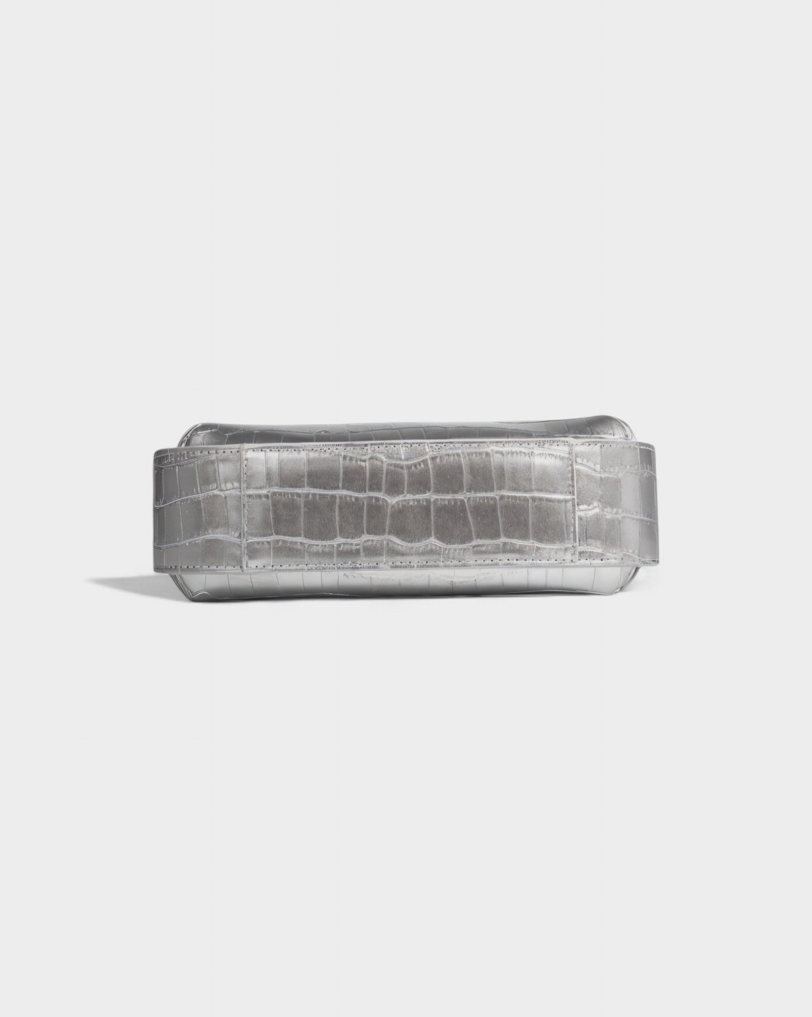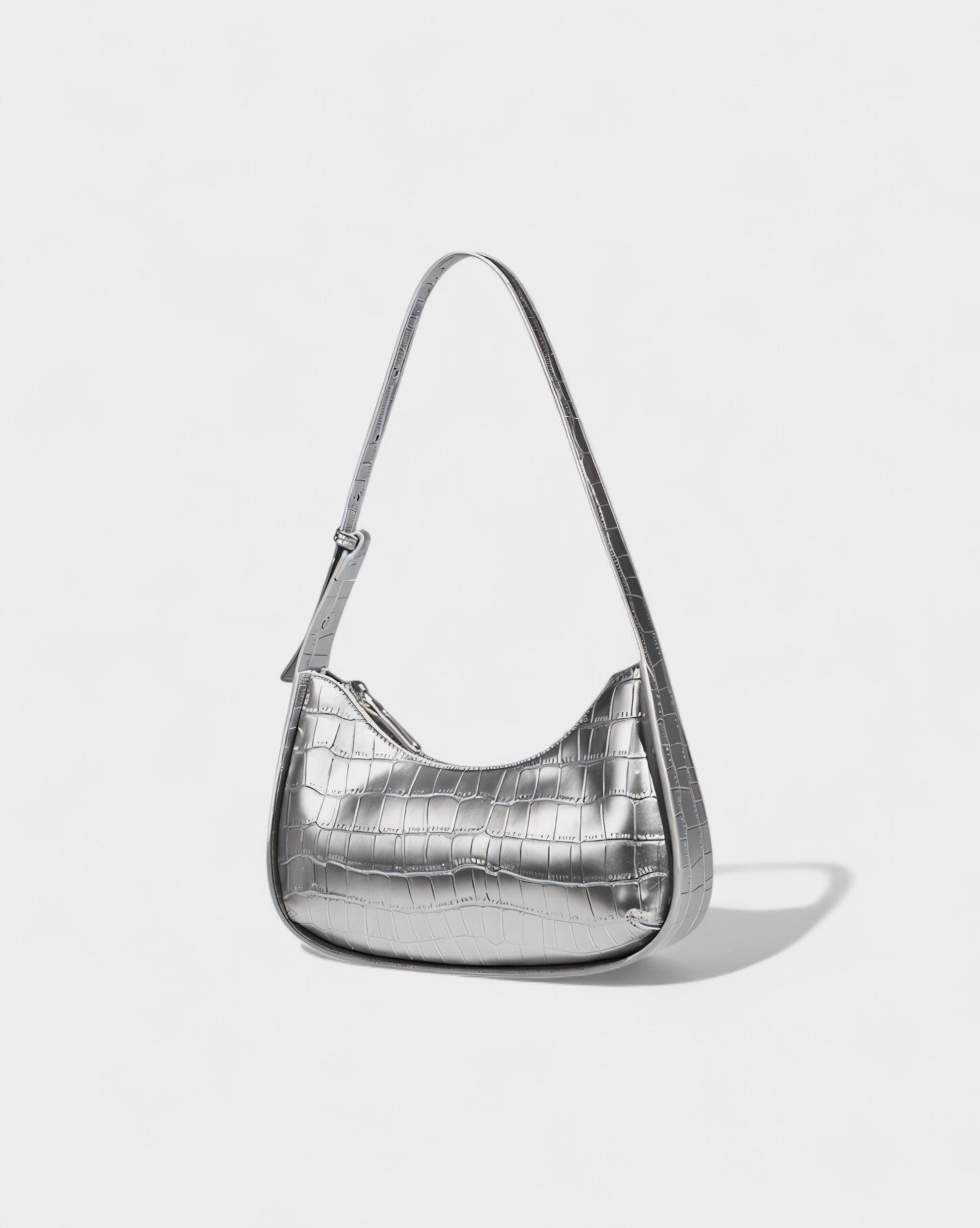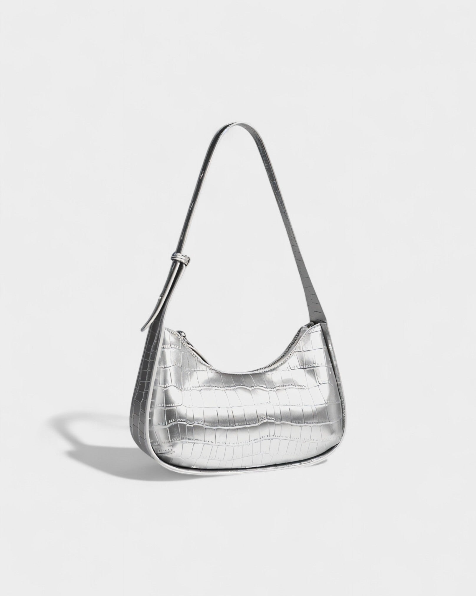 The Cianna Bag is sleek, modern, and unapologetically bold. Crafted with a metallic croc-embossed finish, it features a sculpted silhouette that tucks perfectly under the arm. The zip-top opens to a lined interior with a slip pocket, balancing high-shine style with practical function.