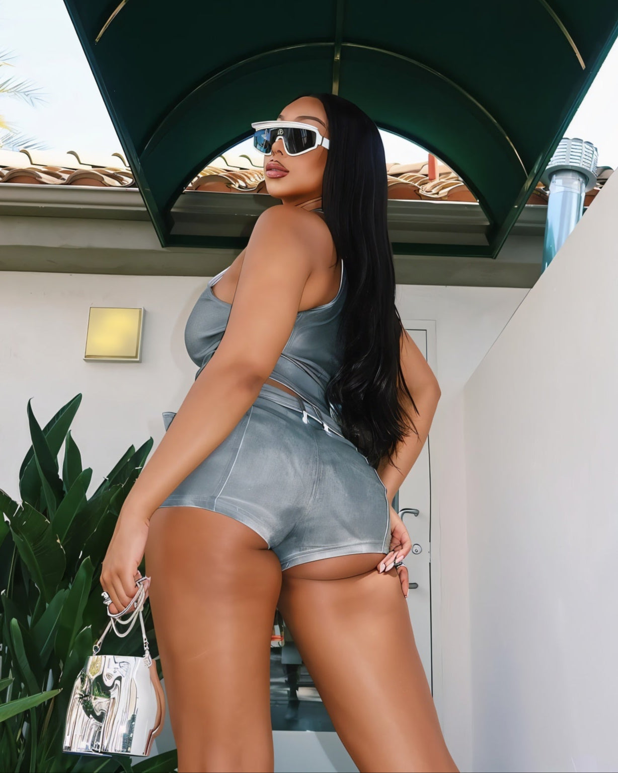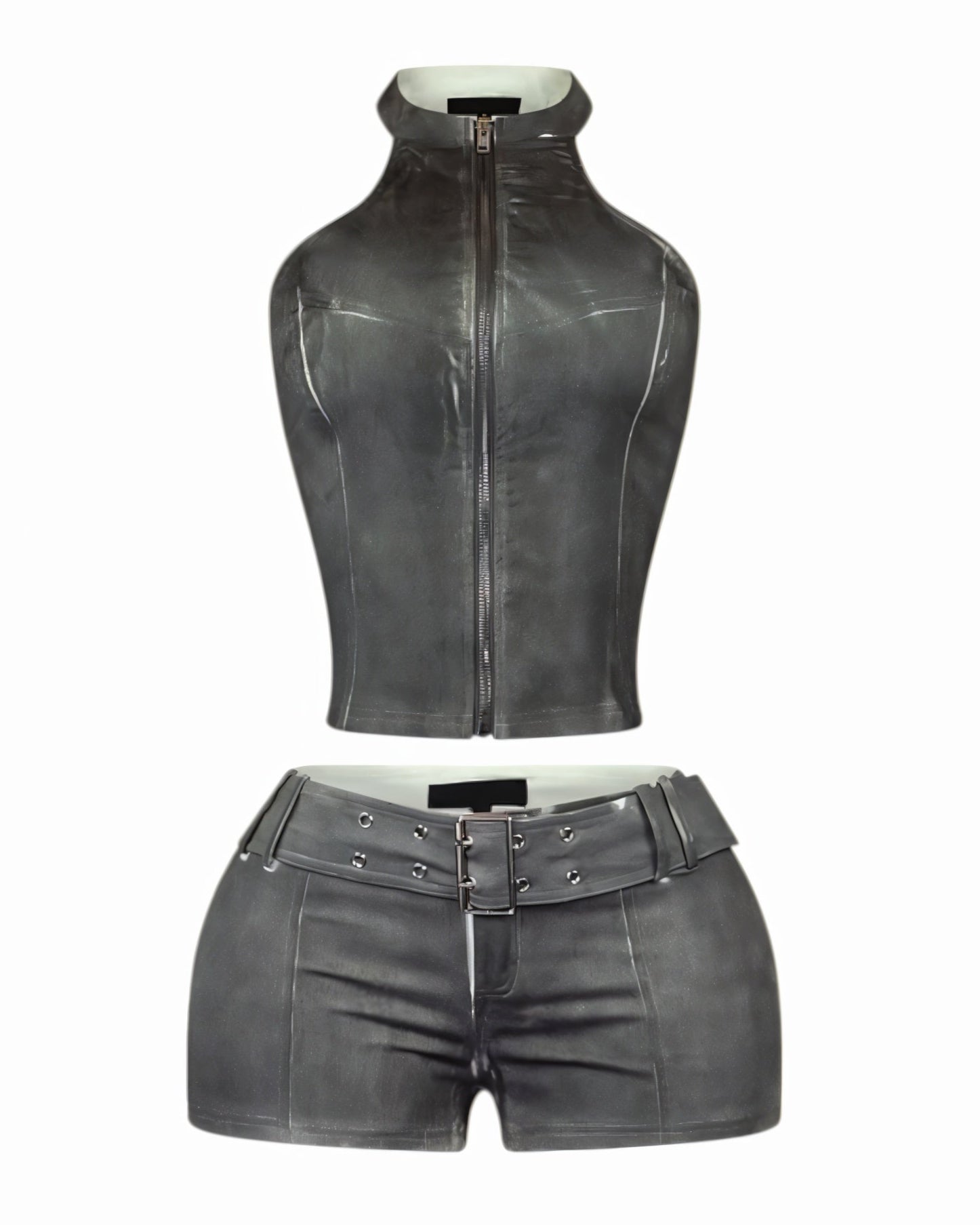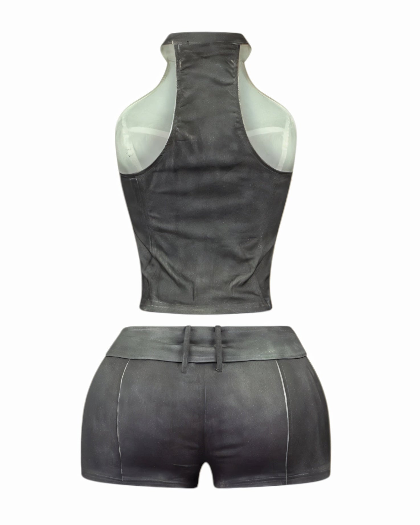 Designed in soft, structured denim, it features a halter-style crop top with front zipper closure and matching high-waisted belted shorts. With its tailored details and figure-flattering cut, this set delivers laid-back edge with a touch of polish.