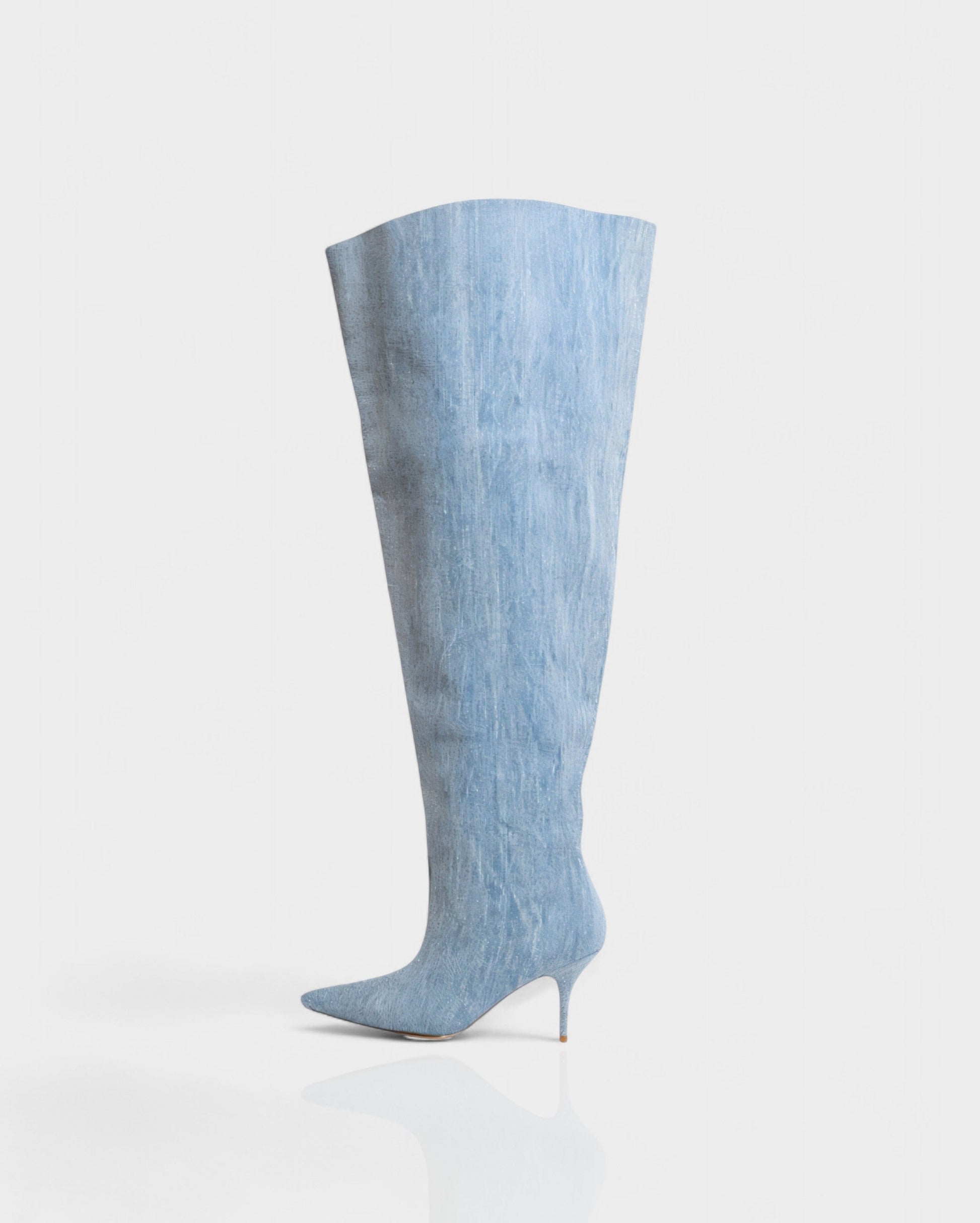 The Davira Boots take thigh-high drama to the next level with a bold denim twist. Designed with a sleek pointed toe and razor-sharp stiletto heel, they’re crafted to sculpt the leg while serving statement edge. Effortlessly mixing casual fabric with a high-glam silhouette, these boots demand attention.