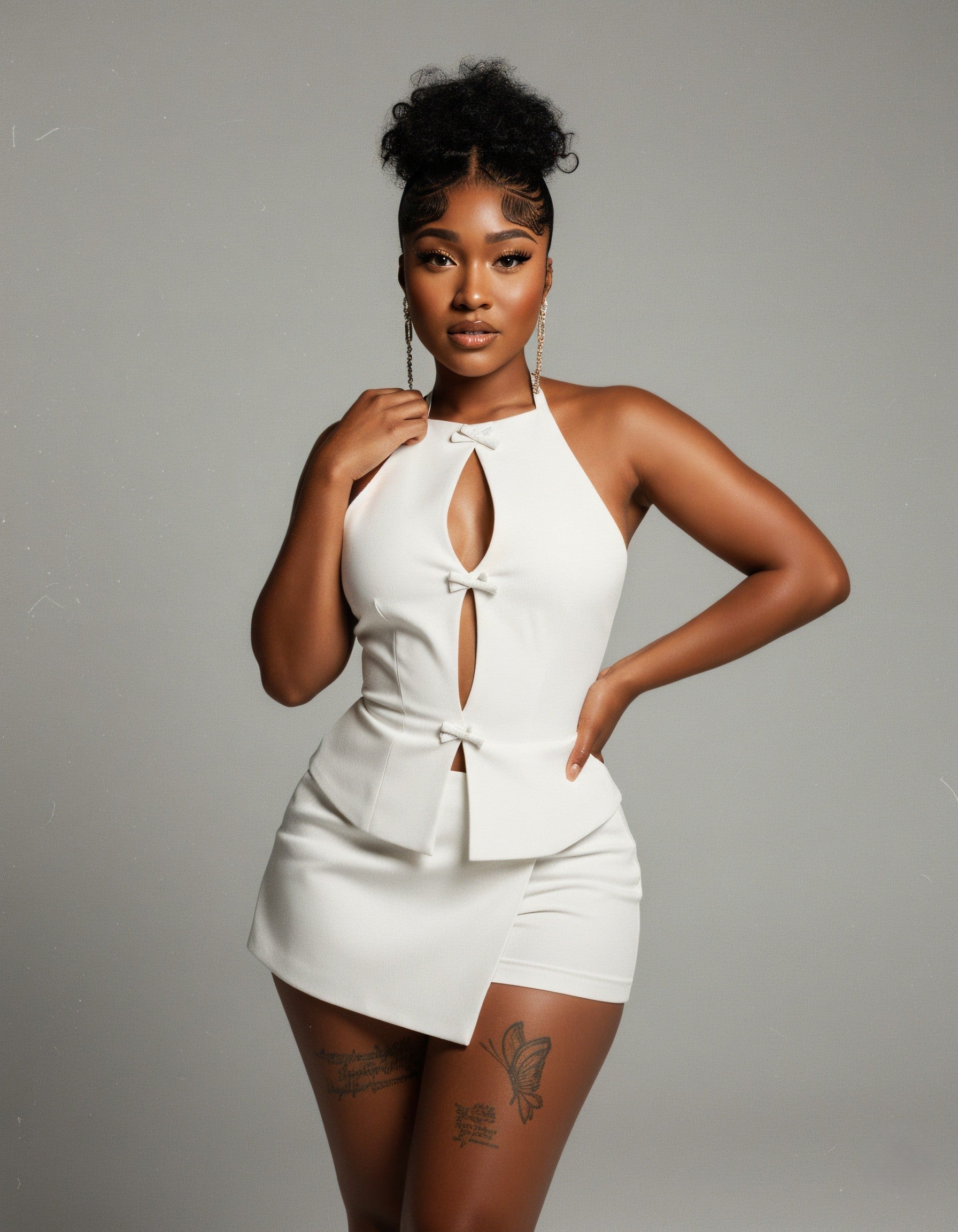 The Diana set is undeniably that girl. With its structured halter top featuring sleek keyhole cutouts and front tie details, paired with a sharp, pleated mini skirt - this look was made for after-dark power moves. Whether you're pulling up to dinner or turning heads at the function, this white-hot set gives elegance with edge.