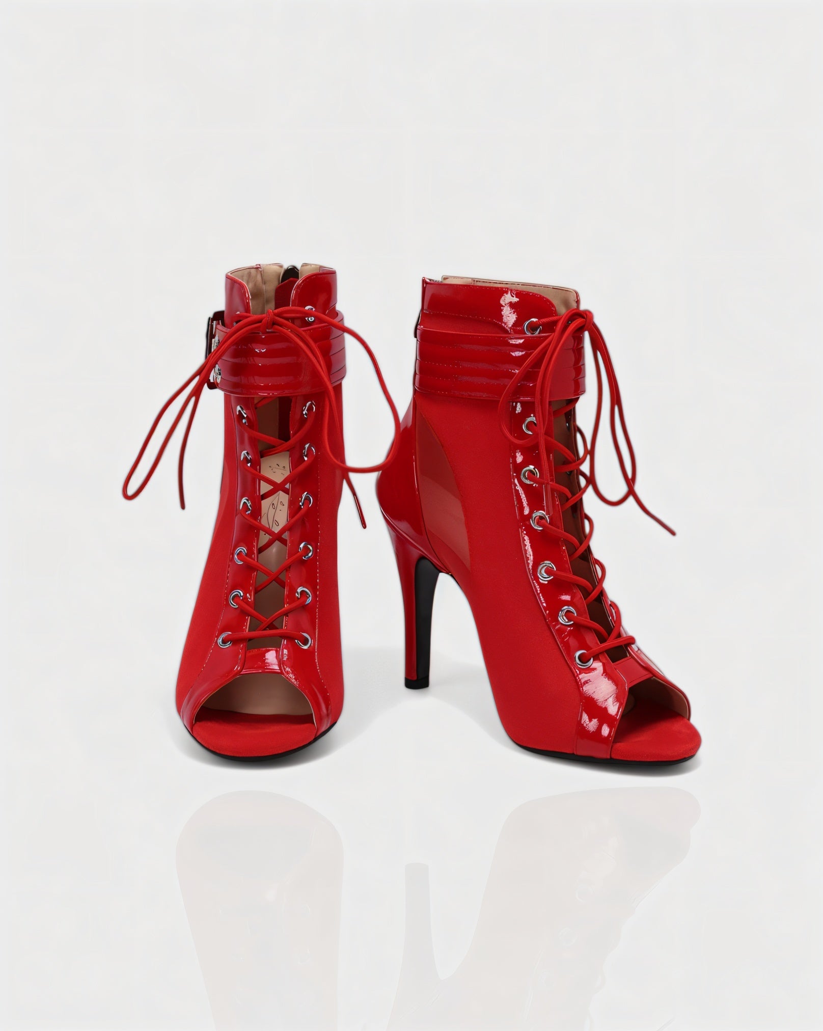 Own the night in the Elinda short boots. Designed with a bold lace-up front and metal eyelets, they showcase a daring peep-toe silhouette. Sheer mesh side panels offer a glimpse of skin, while the stiletto heel and adjustable ankle strap deliver the perfect mix of fit and edge.