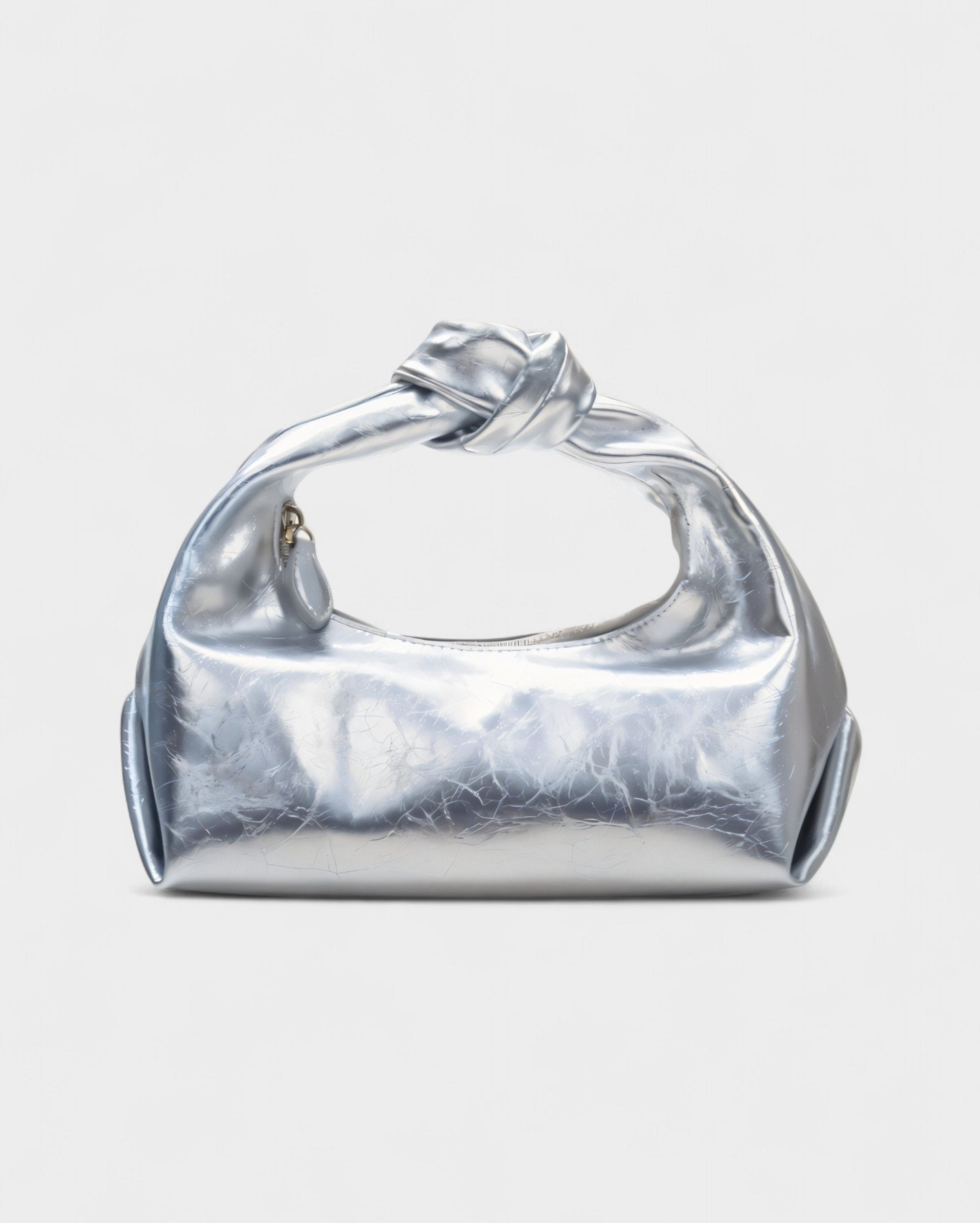 Minimal shape, major style. The Emella dumpling bag blends sculptural softness with a modern edge featuring a knotted handle and curved sides in a luxe crinkled or smooth faux leather finish. Whether metallic or matte, it brings effortless cool to any look.