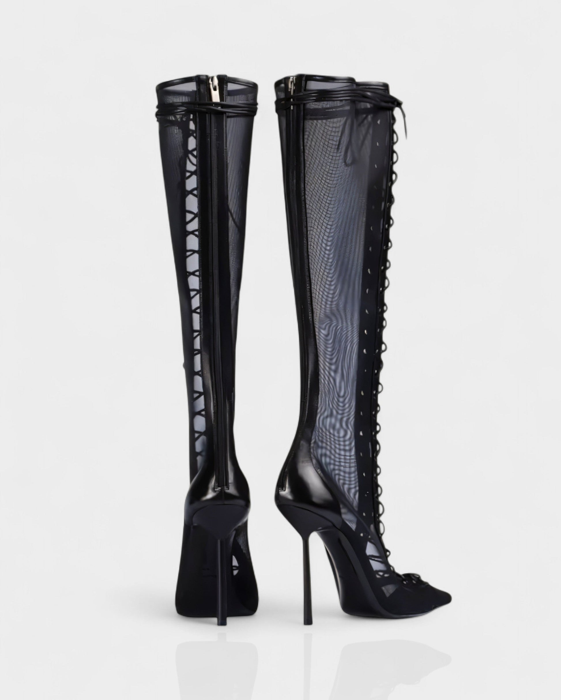 ESCAS Lace-Up Mesh Knee-High Stiletto Boots