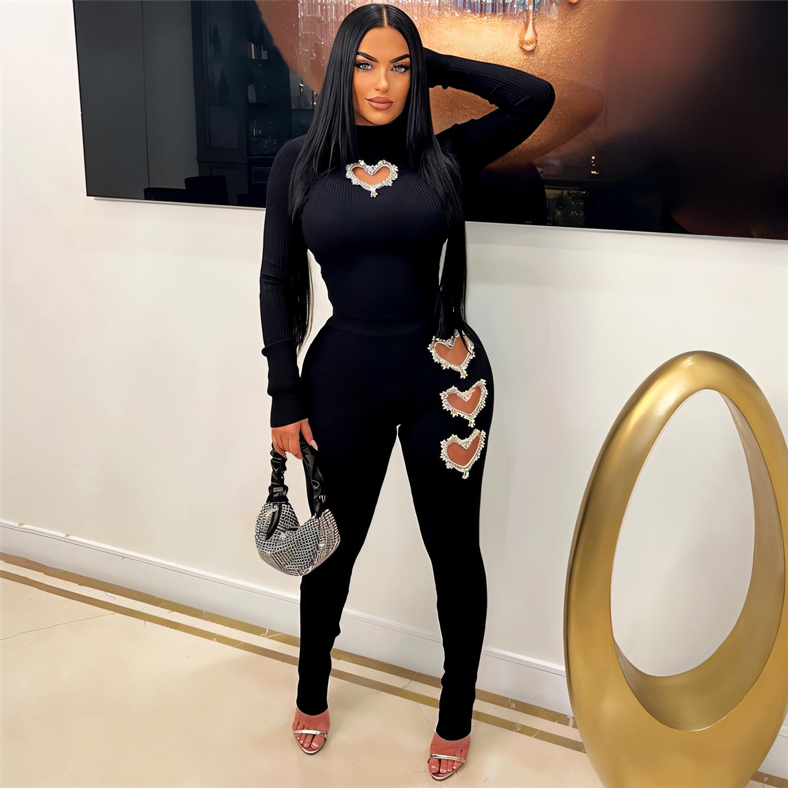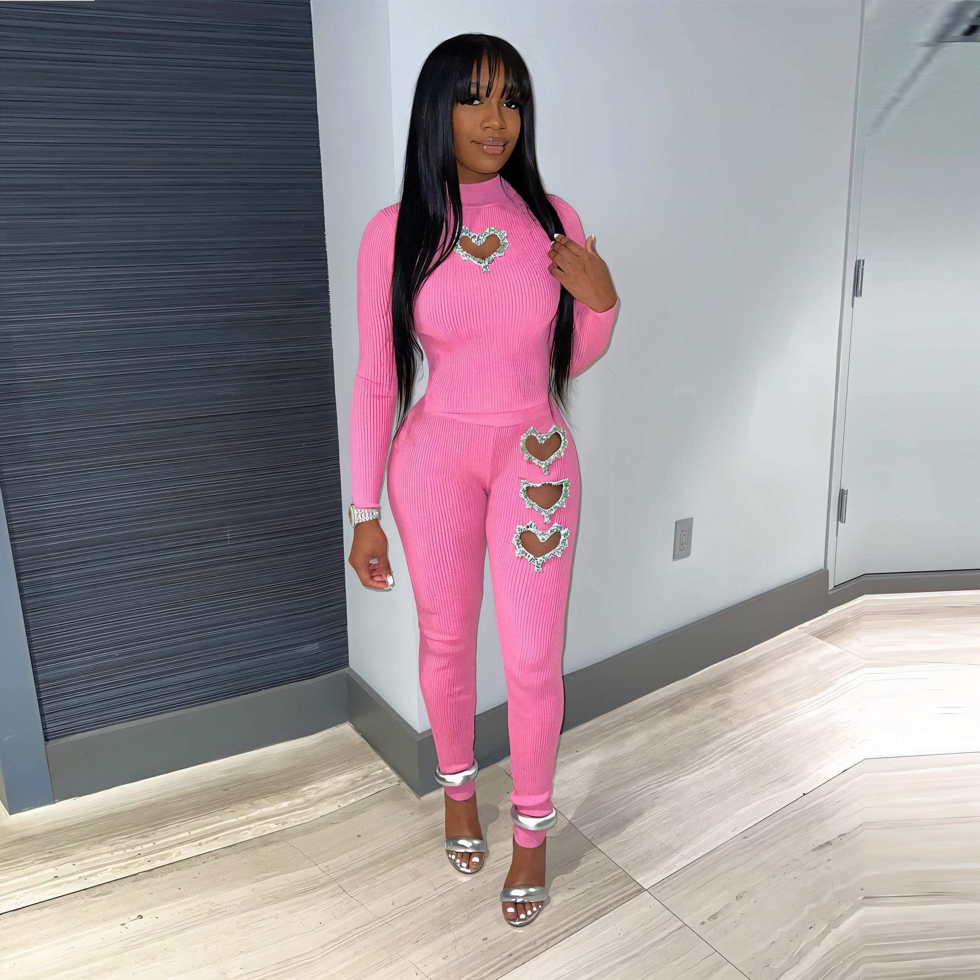 The ESME set features a sleek ribbed design with rhinestone heart cutouts that add a touch of love. Flattering fit and bold details make it perfect for standing out.