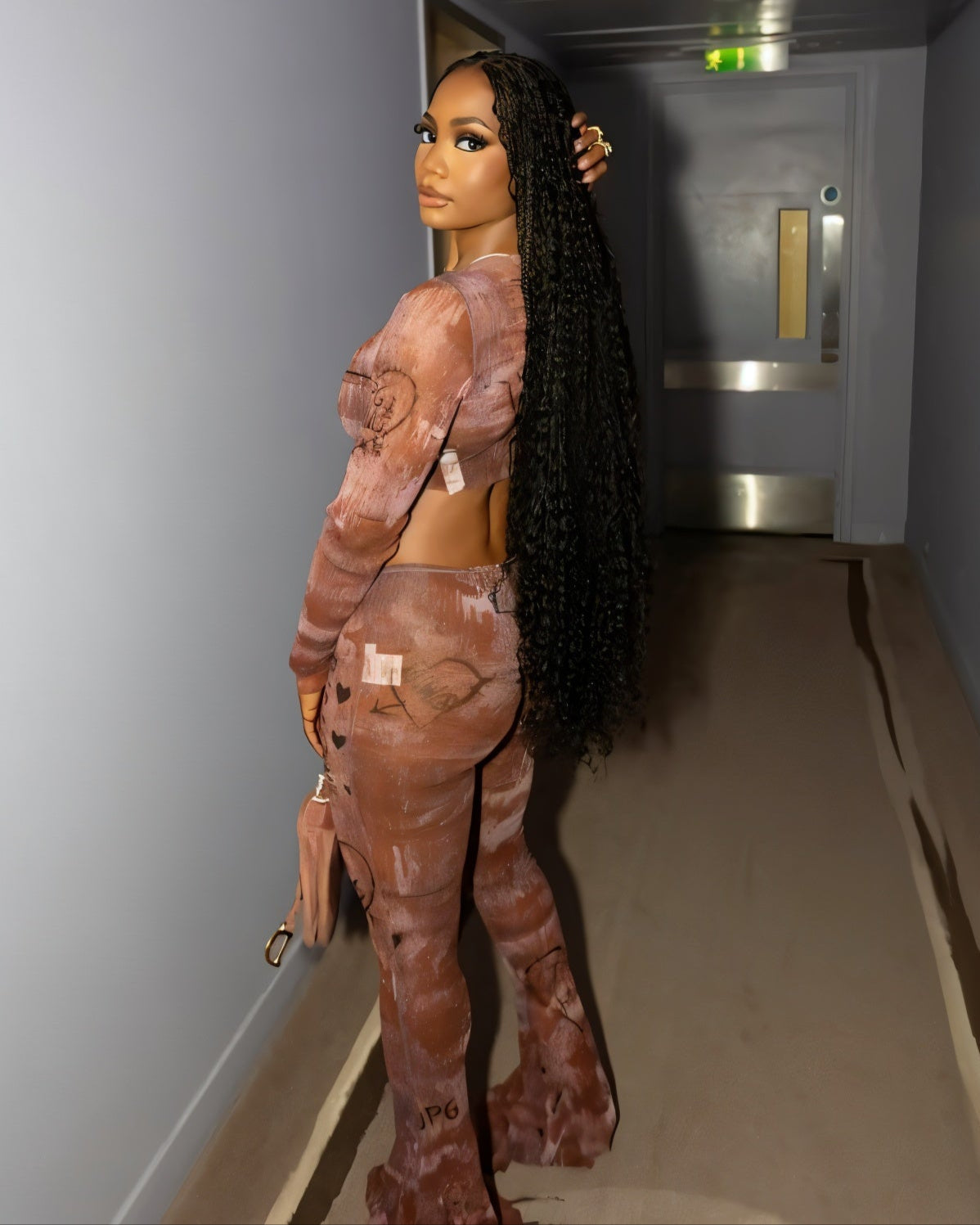 The Evarine set is a bold, street-style statement featuring a sheer long-sleeve crop top and matching flared pants. Adorned with edgy graffiti-style lettering and heart motifs, the fitted silhouette hugs your curves while the flared hems add movement.