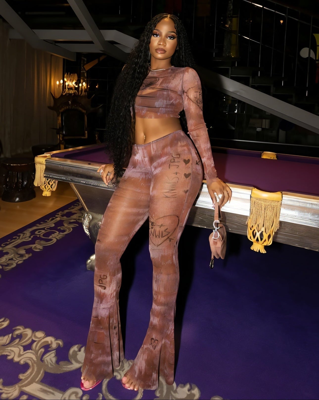EVARINE Graffiti Print Mesh Long Sleeve Top & Flare Pants Set