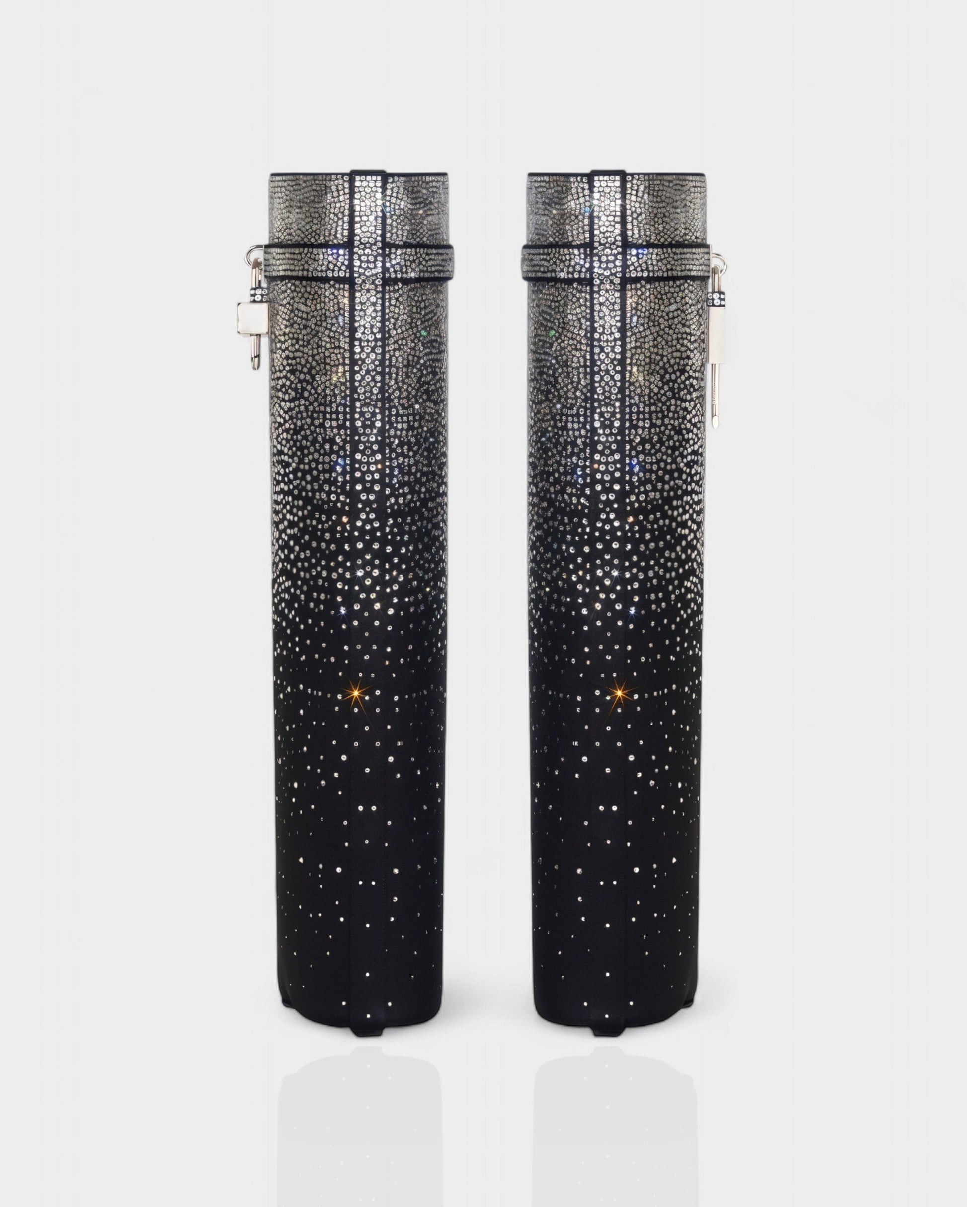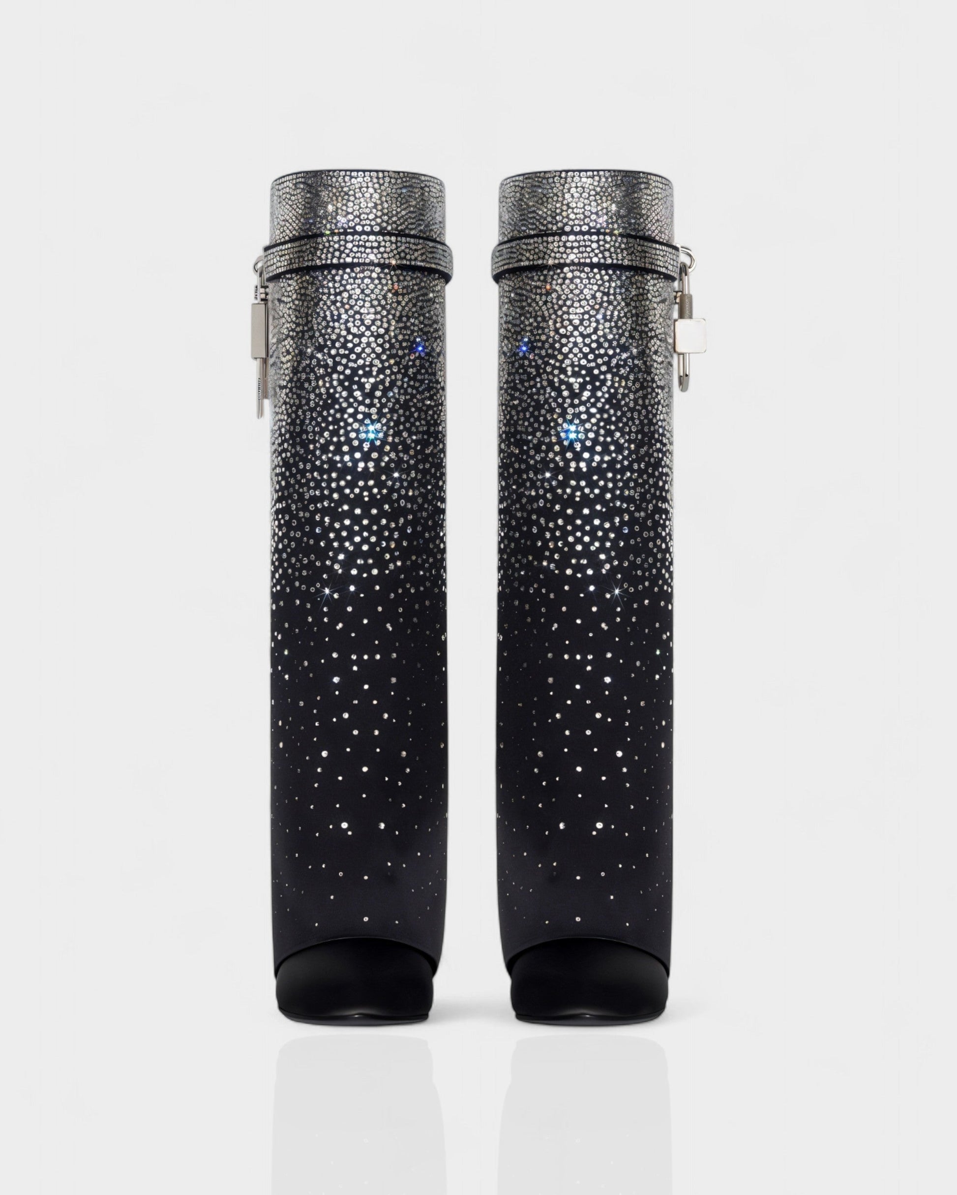 The Galora Boots are pure high-shine drama, built to steal every spotlight. Designed in a bold wedge silhouette, they’re drenched in allover crystal studs that catch the light from every angle. Finished with a sleek overlay panel and statement padlock hardware, they’re unapologetically luxe.
