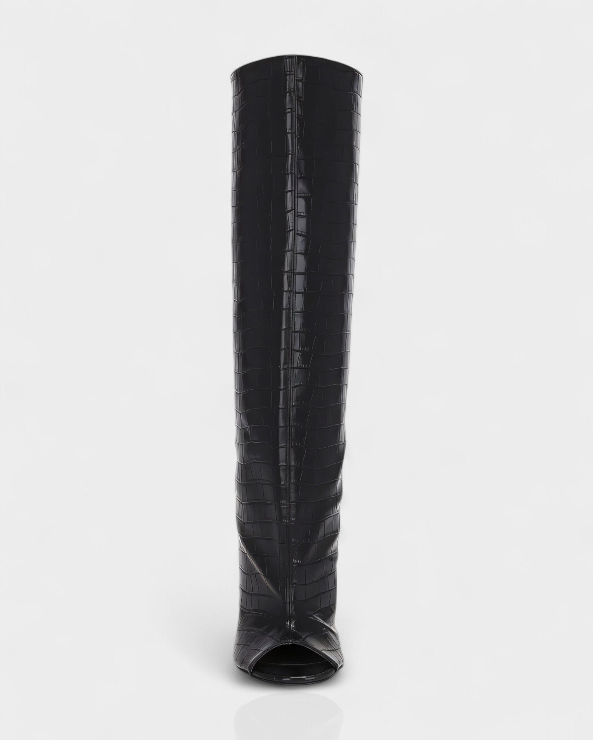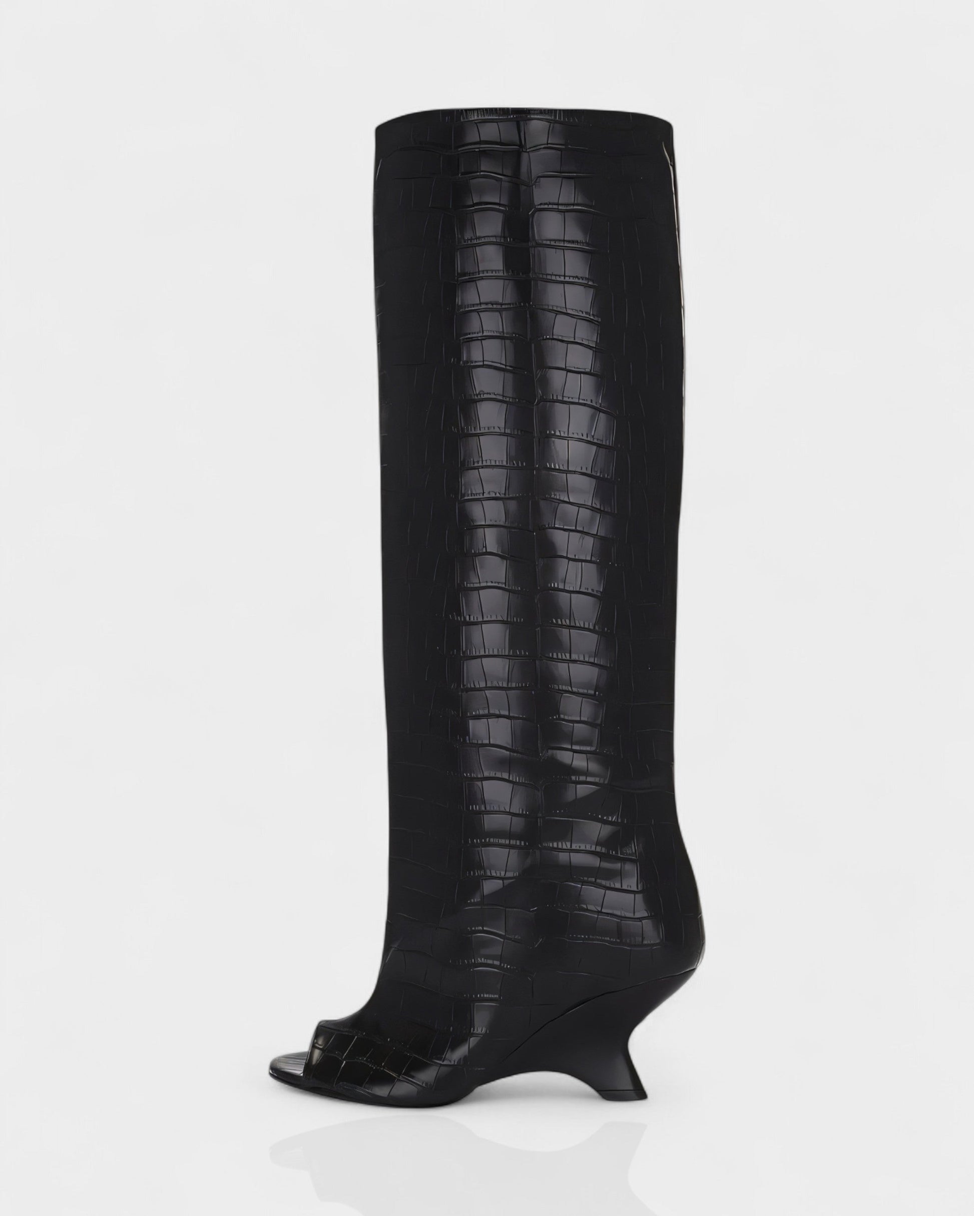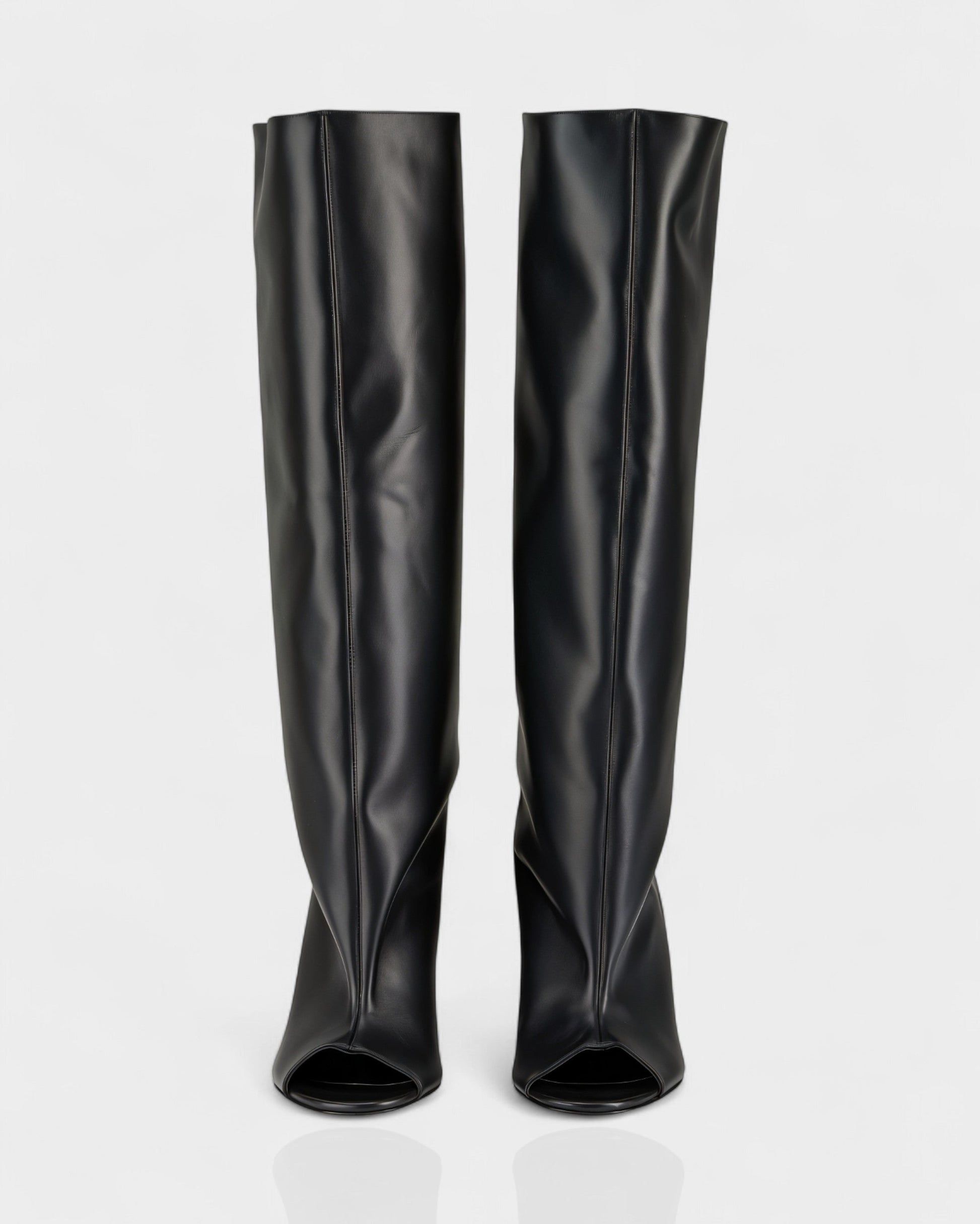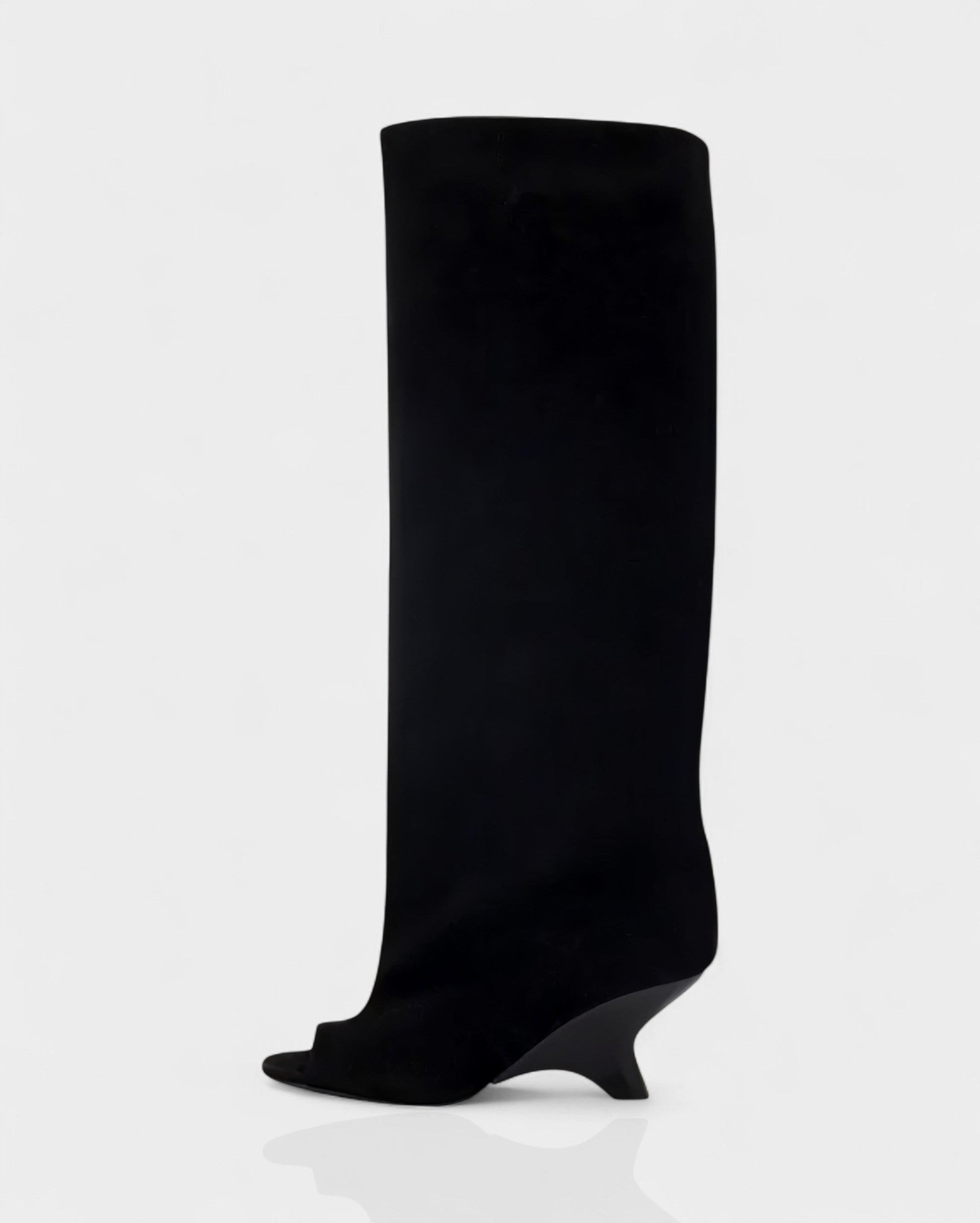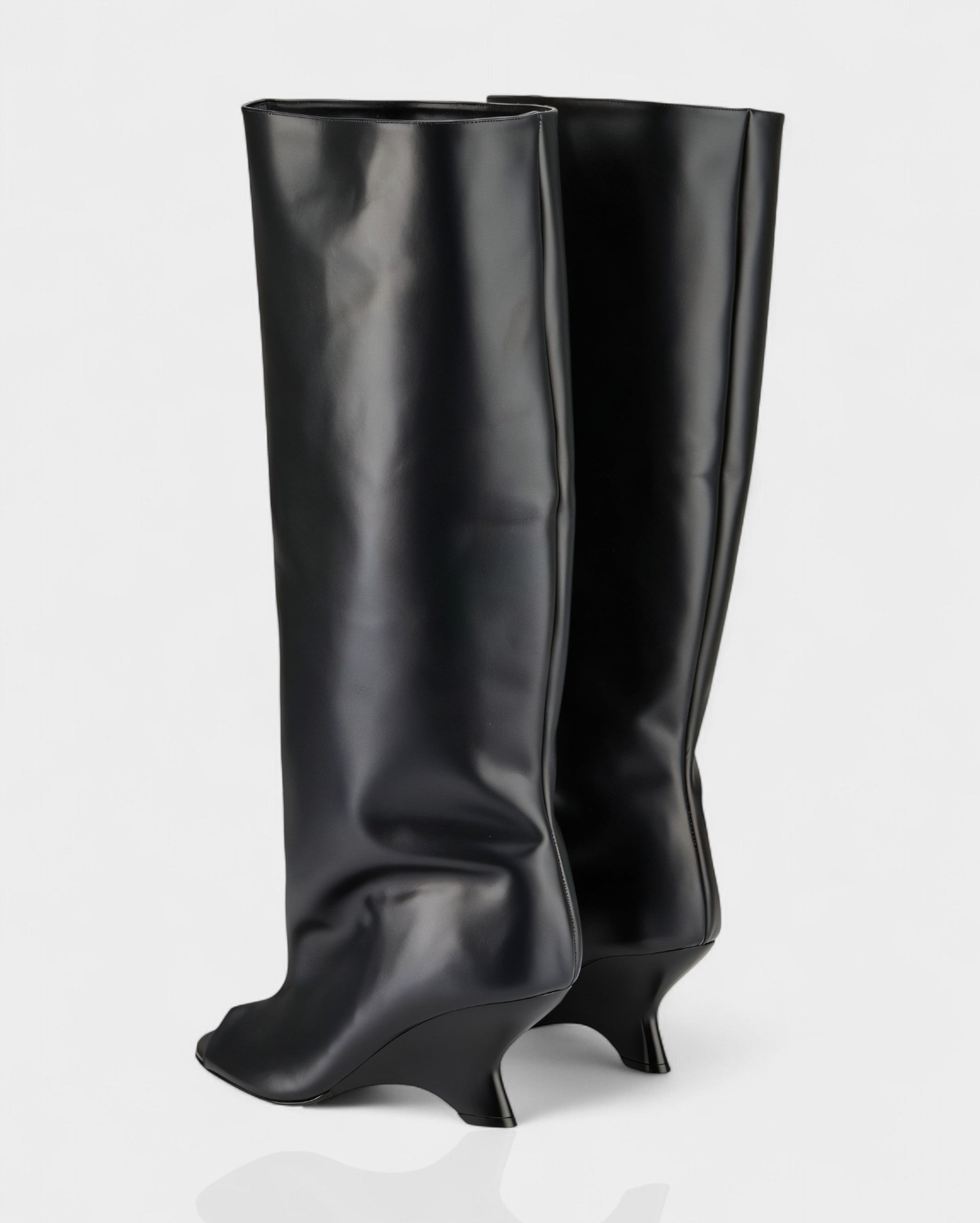 The Helira Boots deliver sleek drama with a bold twist. Designed in a smooth knee-high silhouette, they feature a daring peep toe and a sculpted wedge heel that gives edge while keeping it wearable. A statement piece that blends modern minimalism with sultry detail.