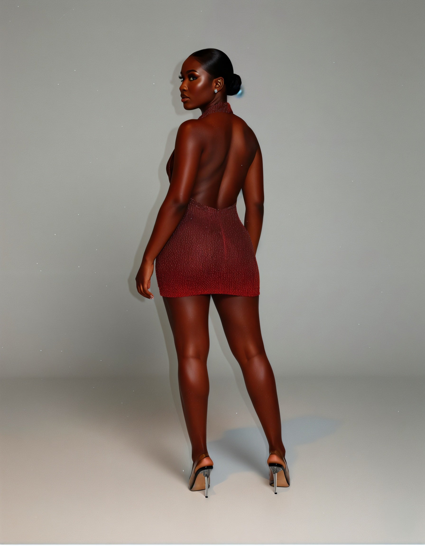She’s giving shimmer, sculpt, and serious heat. The Imogen mini hugs every curve with a bodycon fit and plunging cowl neckline. Glitter ombré and rhinestone detailing fade from soft to bold, catching light with every step. Finished with a halter tie and stretch ruching for that perfect snatched shape.