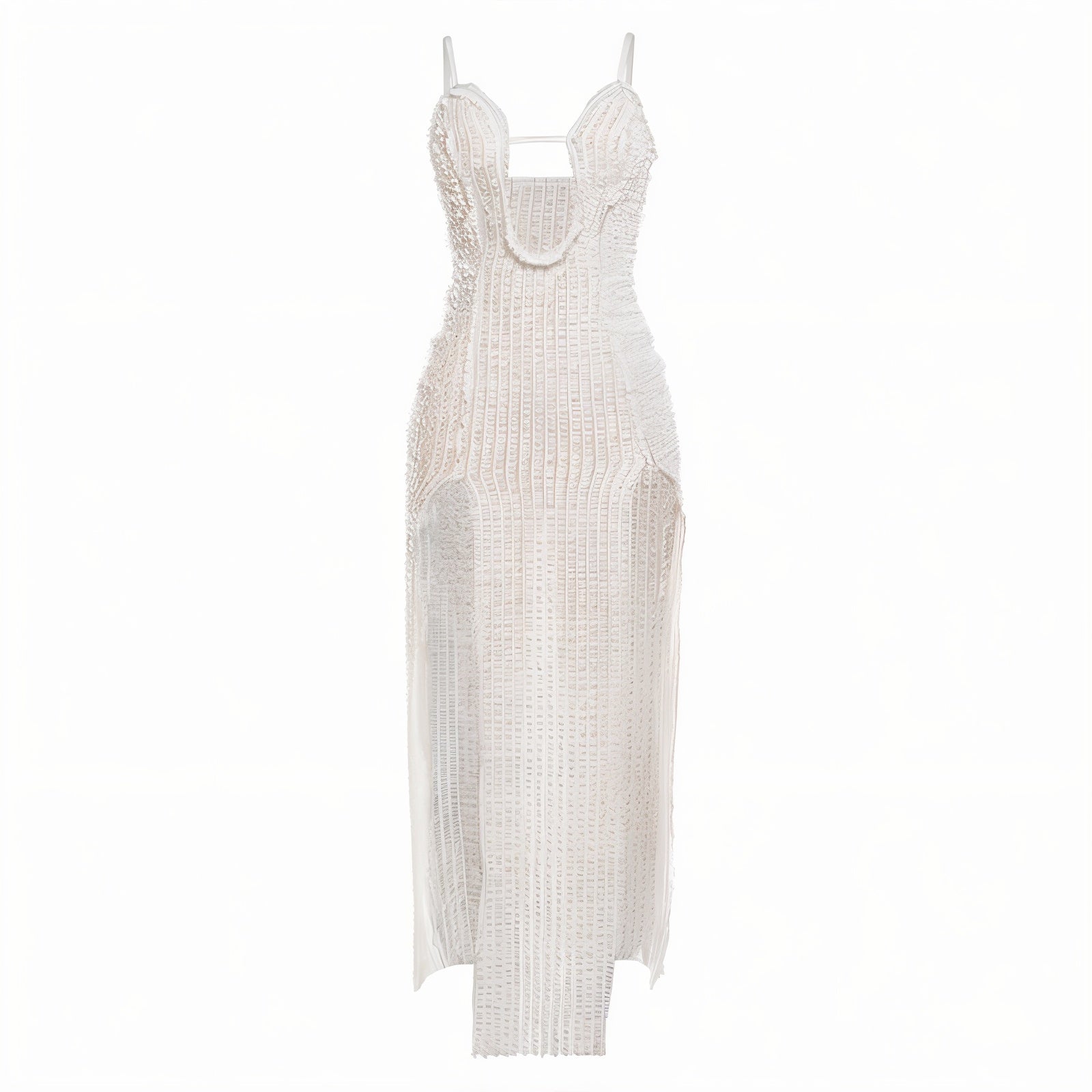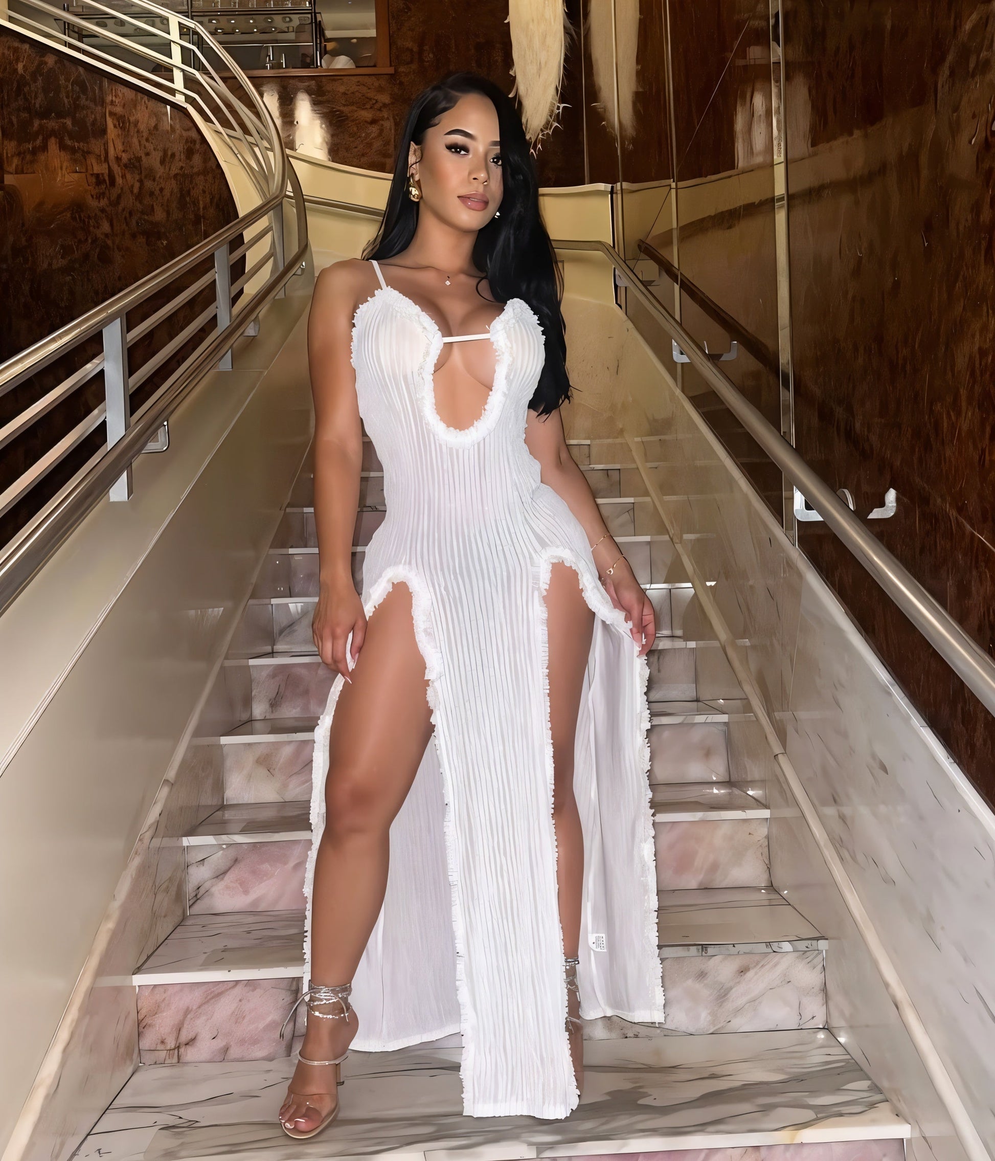 Slip into elegance with the ISLA Maxi Dress. Featuring a daring plunging neckline, thigh-high slits, and a curve-hugging pleated design, this dress is your ultimate look for turning heads and owning the night. Perfect for luxe dinners, exclusive events, or wherever you want to slay.