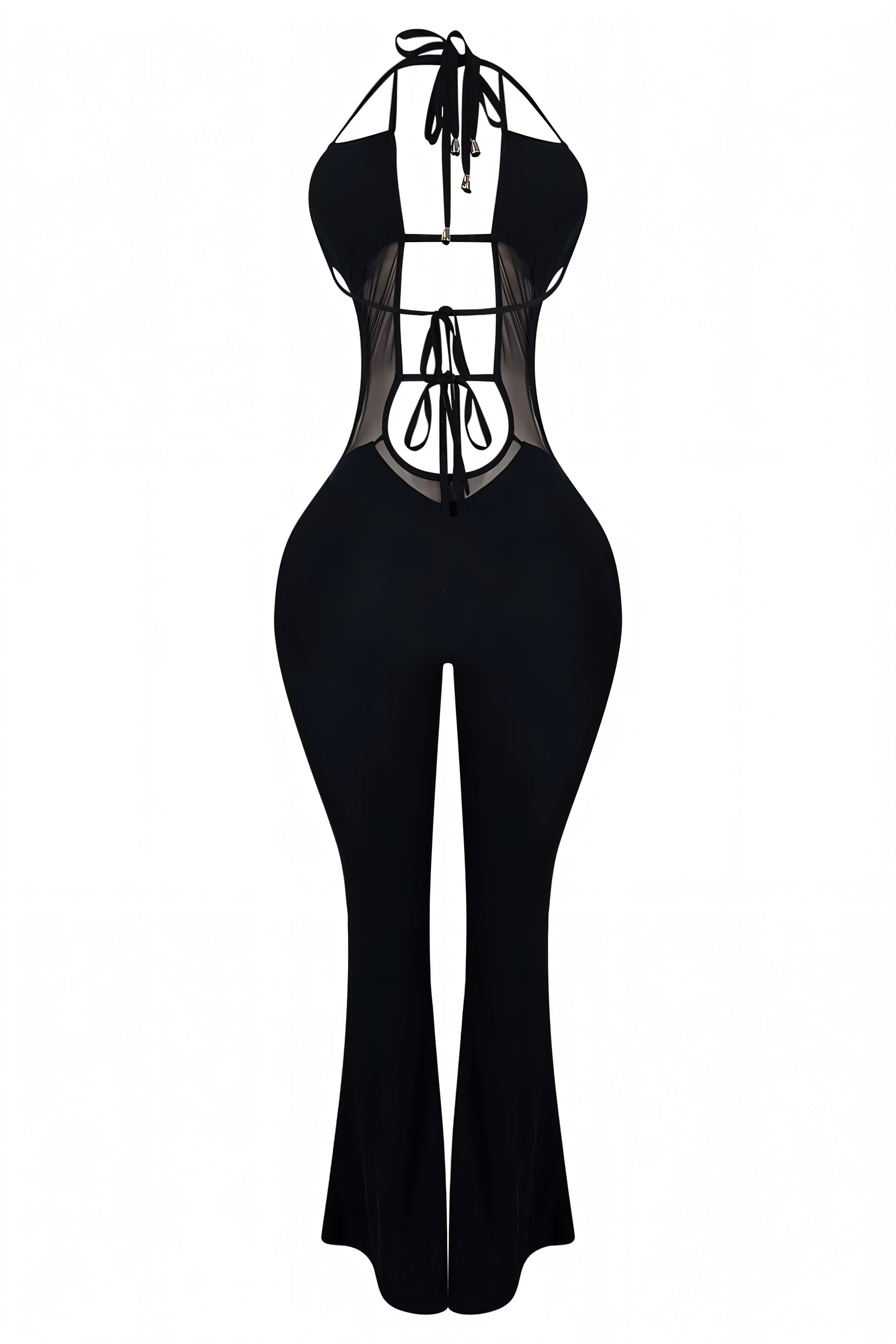 The Naomi is a showstopper—sexy mesh panels, an adjustable halter neckline, and a daring tie-front detail. With flared legs for that dramatic finish, this jumpsuit is all about making you look snatched.