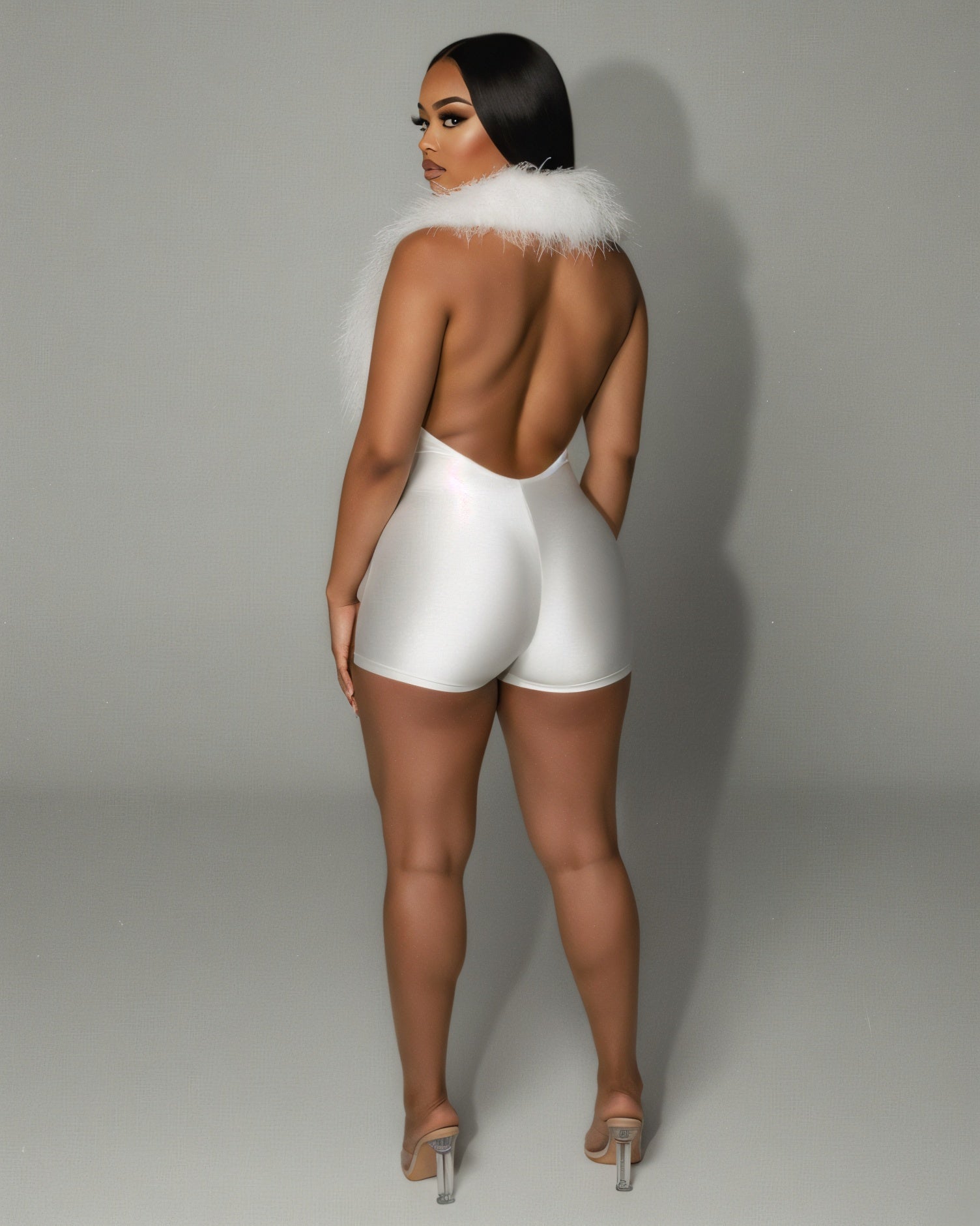 The Lanny Romper brings bold luxury with a sleek, sculpted edge. Designed with a plunging neckline framed in plush faux feathers and a daring open back, it hugs your curves in smooth satin that moves like a second skin.