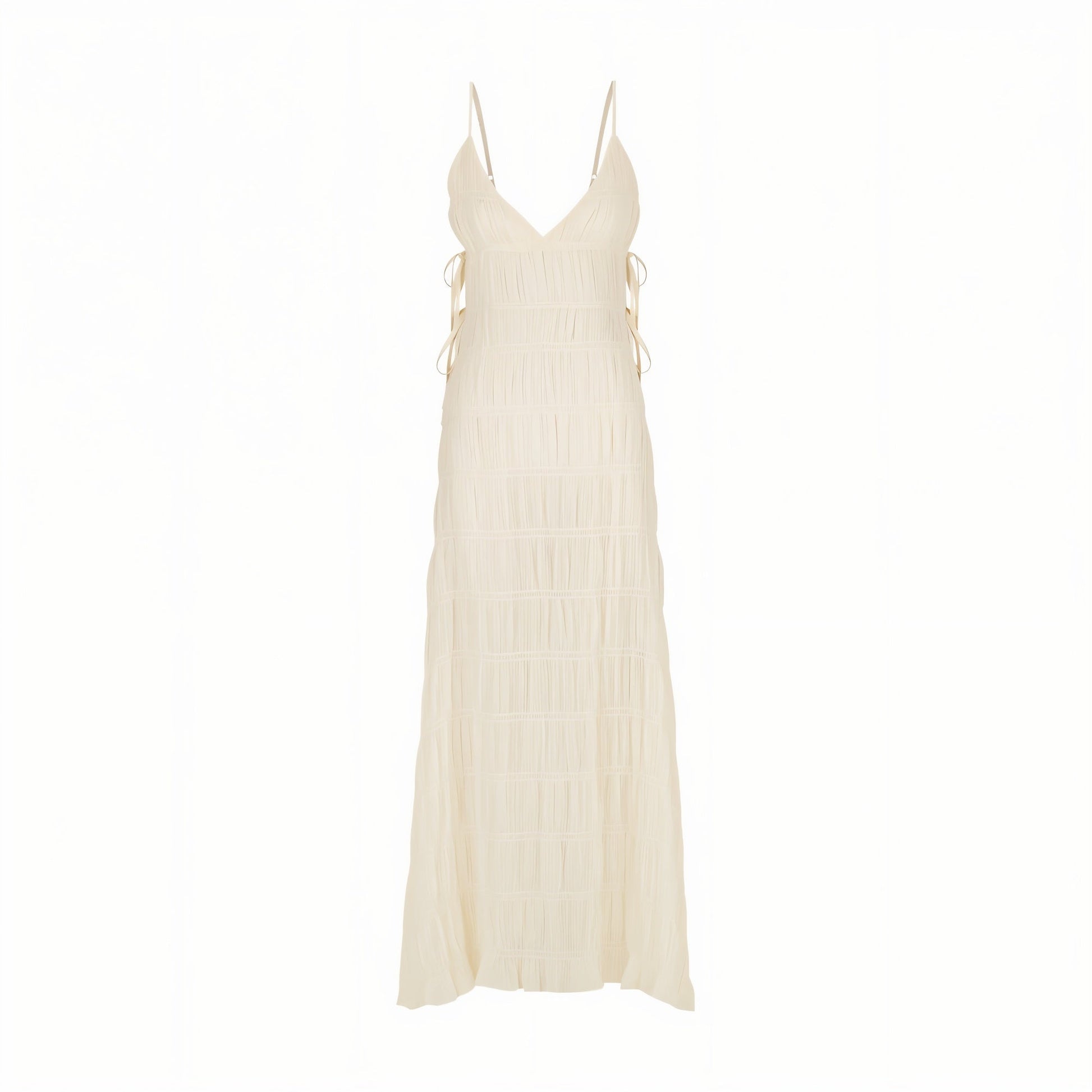 The Leona dress is an elegant, pleated maxi designed with a soft, textured finish that flows effortlessly. It features fixed, delicate shoulder straps and a flattering V neckline. Side tie detailing at the waist allows for subtle adjustability. Fully lined for confident coverage, this piece blends structure with graceful movement.