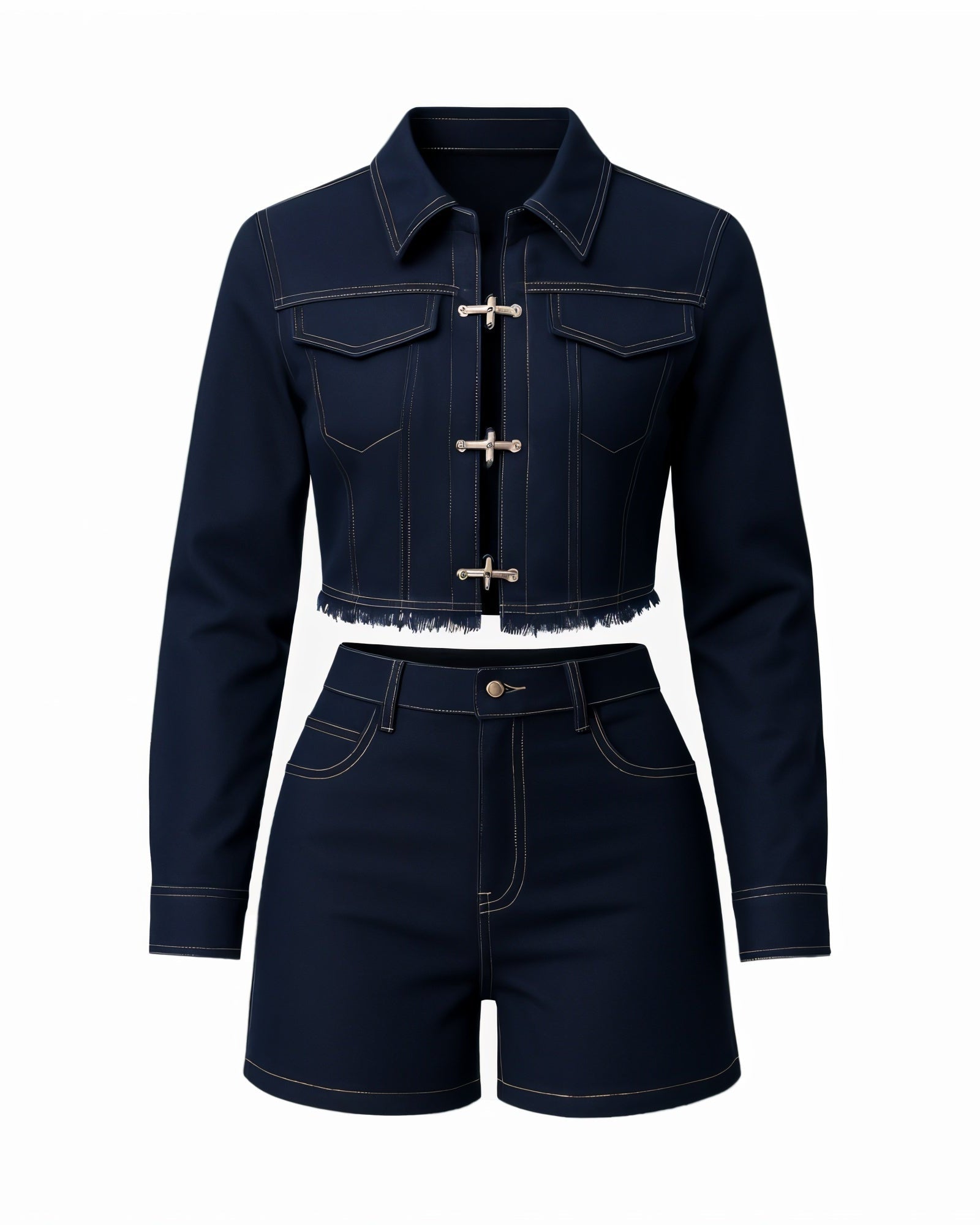 This denim set offers a chic and edgy take on casual wear, featuring a cropped jacket with unique buckle closures and distressed detailing. Paired with high-waisted shorts that boast a flattering fit and stylish frayed hems, this duo creates a cohesive and fashion-forward look.