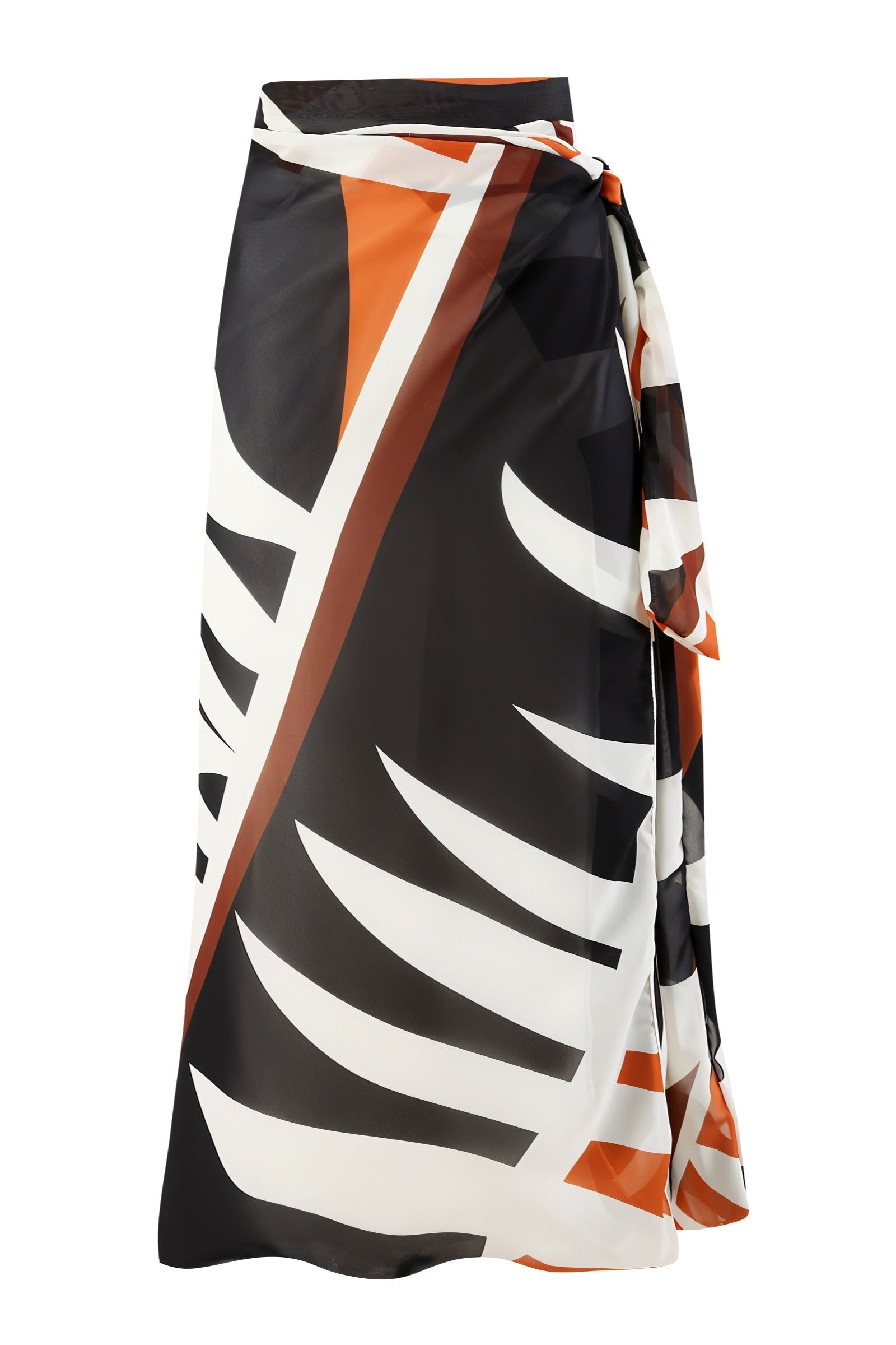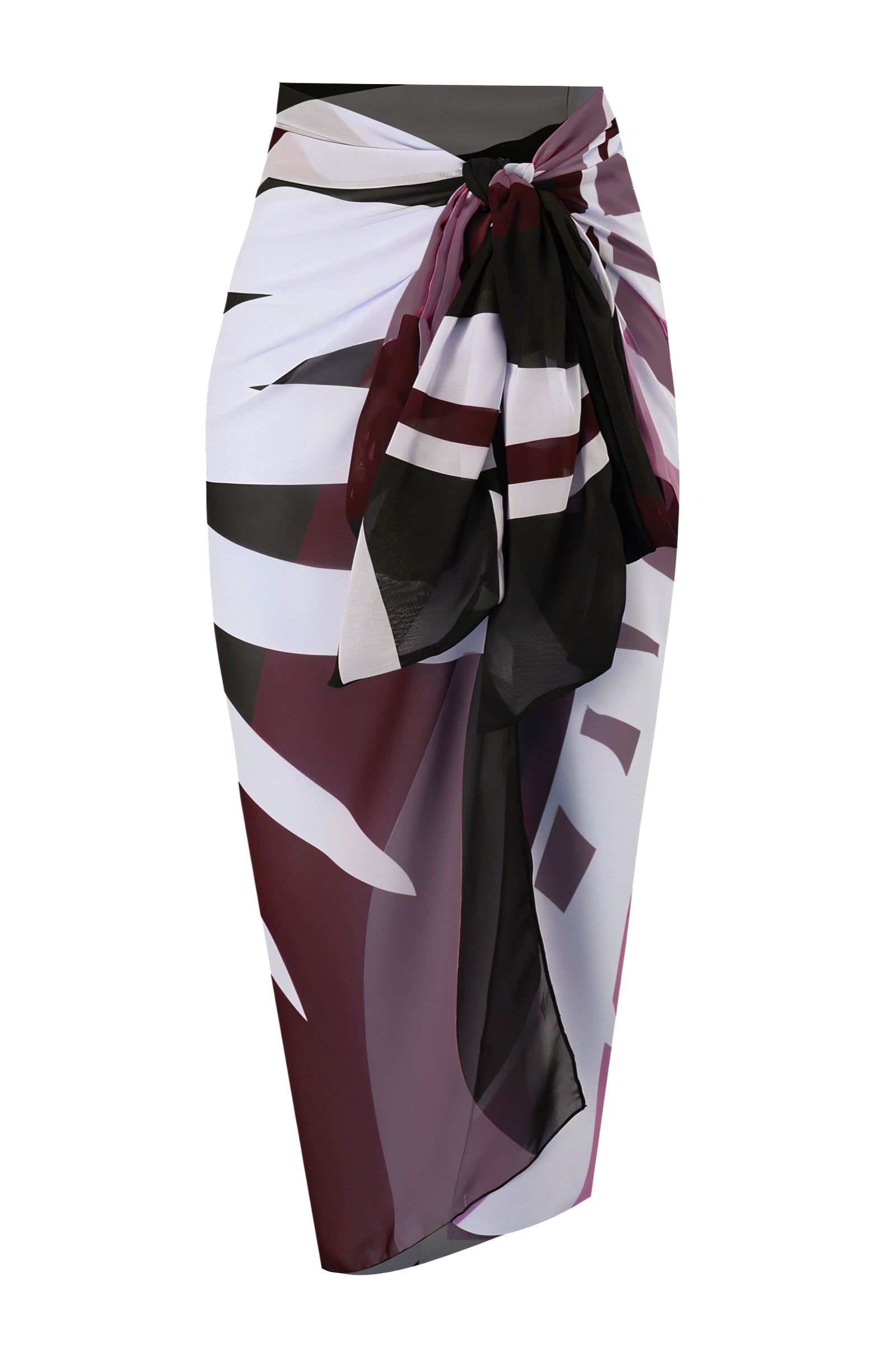 This set includes a textured one-piece swimsuit featuring a ruched front and bead embellishments at the center, paired with delicate crossover straps. The matching tie maxi skirt adds movement and coverage with its breezy silhouette and bold print design. Ideal for vacation lounging or poolside styling.