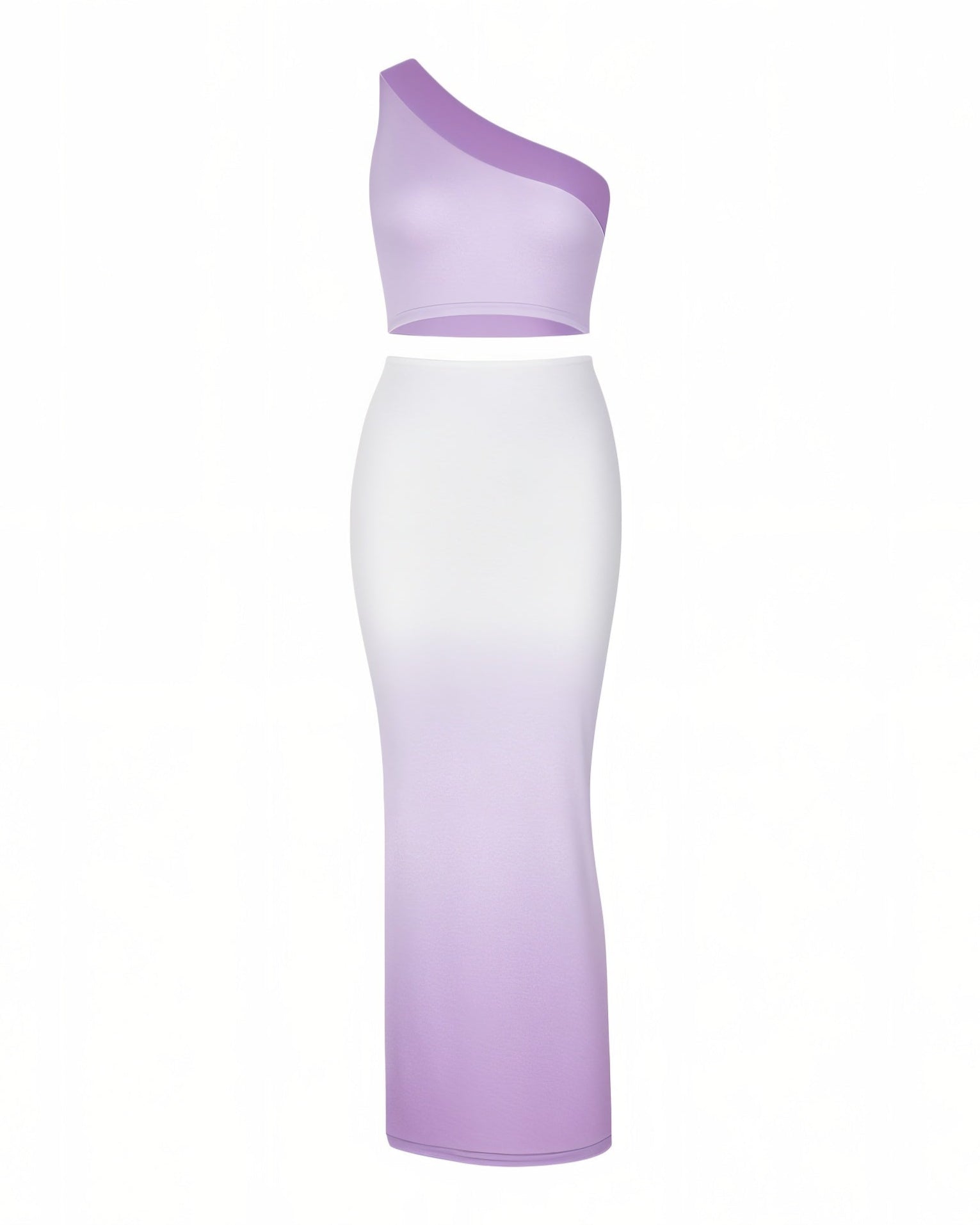 This captivating two-piece set features a chic asymmetrical cropped top paired with a flowing maxi skirt, both in complementary tones. Designed to highlight your silhouette, it's perfect for making a stylish statement.