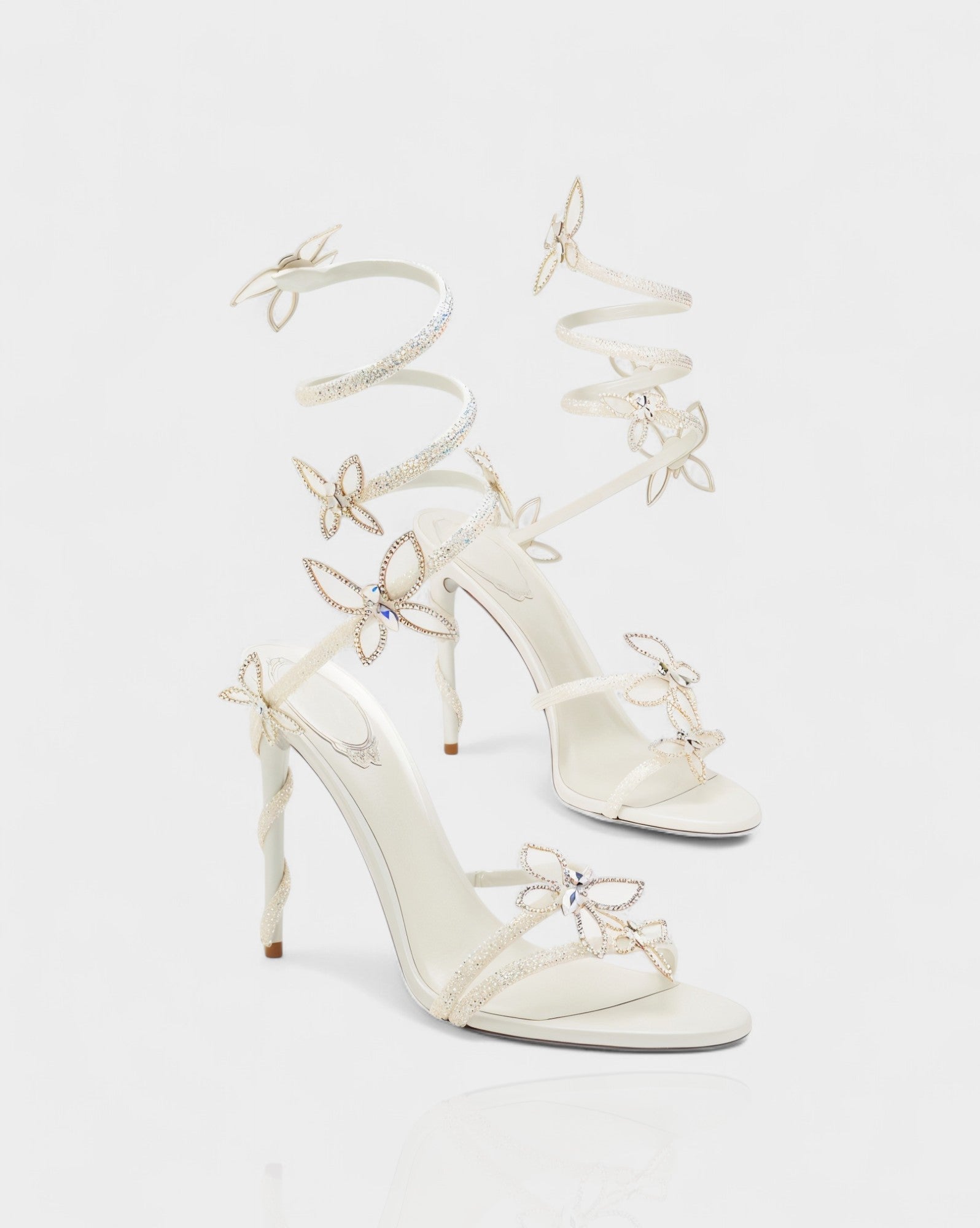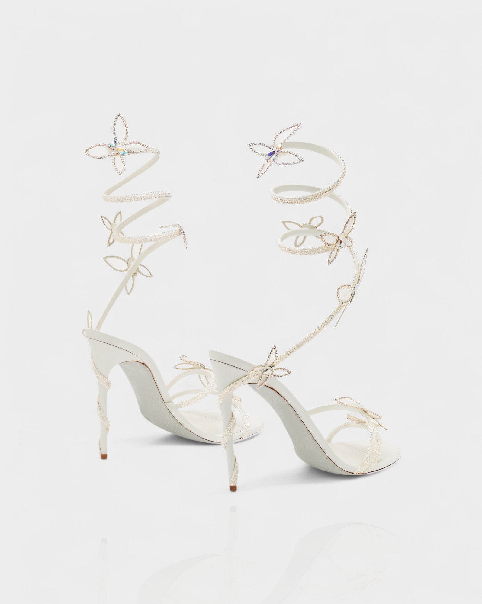 Delicate yet daring, the Lyna High Heel are pure fantasy for the bold. Adorned with crystal butterfly accents that climb the foot and wrap into a spiraled ankle strap, these heels bring sculptural drama with every step. Finished with a sleek stiletto.