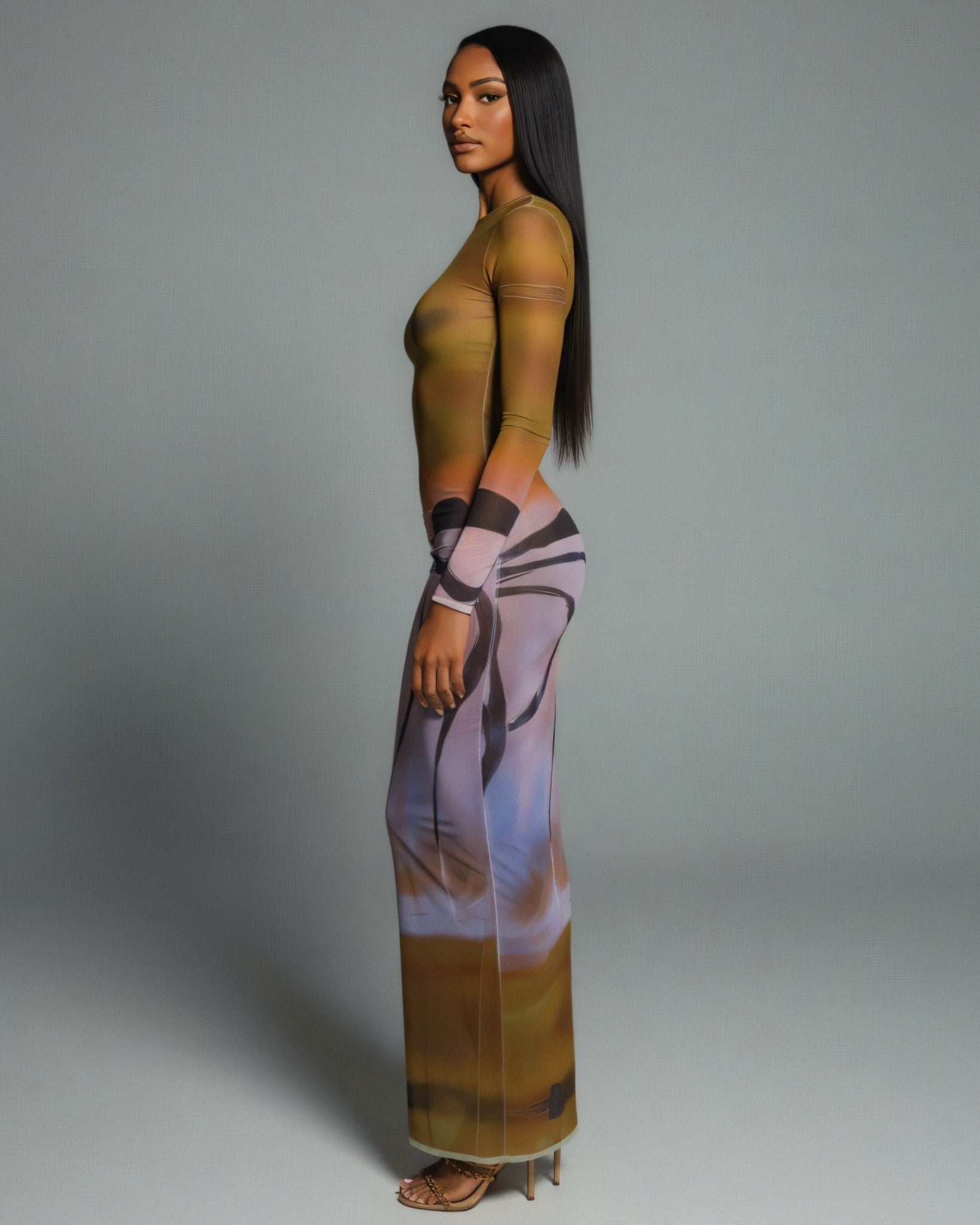 Embrace the artistry of style with the Macy Maxi Dress, a mesmerizing piece featuring an abstract print. This long-sleeve dress is crafted from sheer mesh fabric, designed to create a flattering silhouette that flows beautifully, making it an effortlessly chic statement piece.