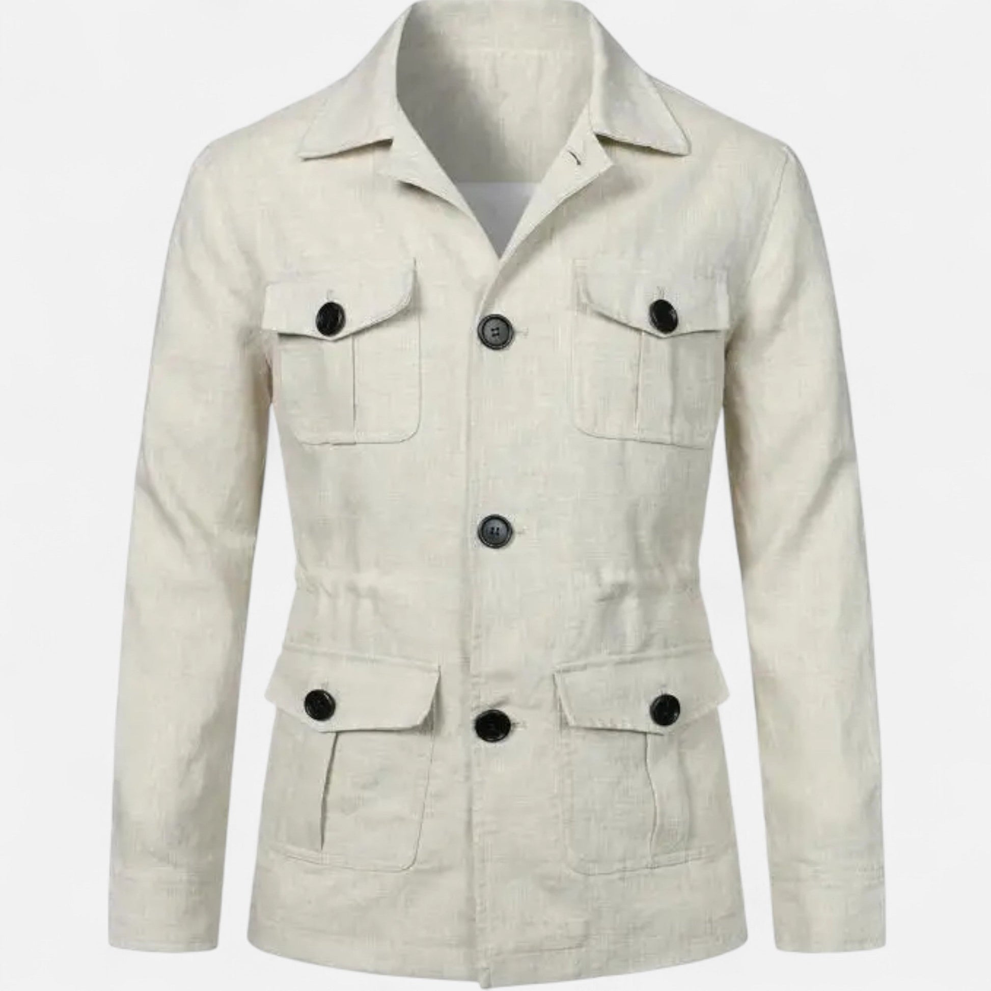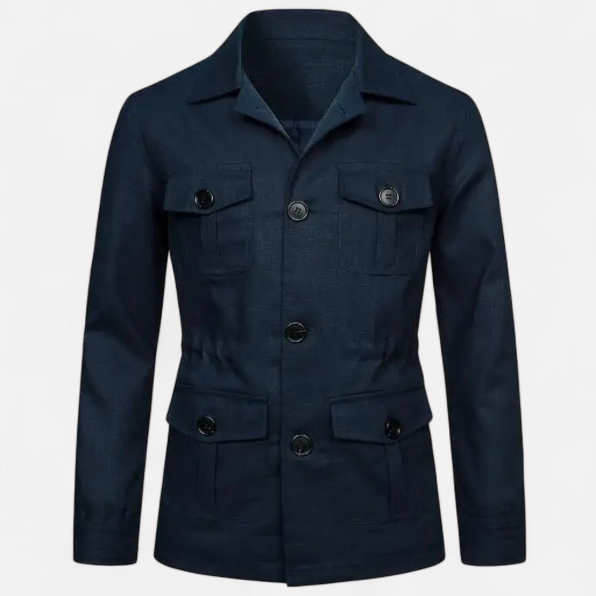 Crafted from a premium cotton-blend fabric, this jacket features multiple flap pockets, a structured collar, and a front zip closure for a clean, utilitarian look. Its midweight design provides warmth while maintaining breathability for transitional weather.