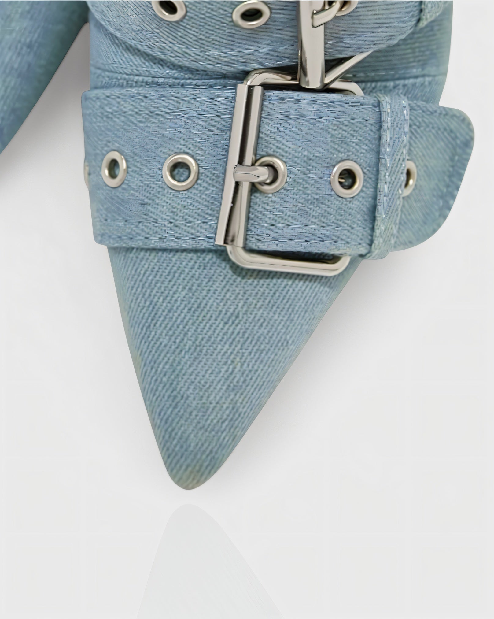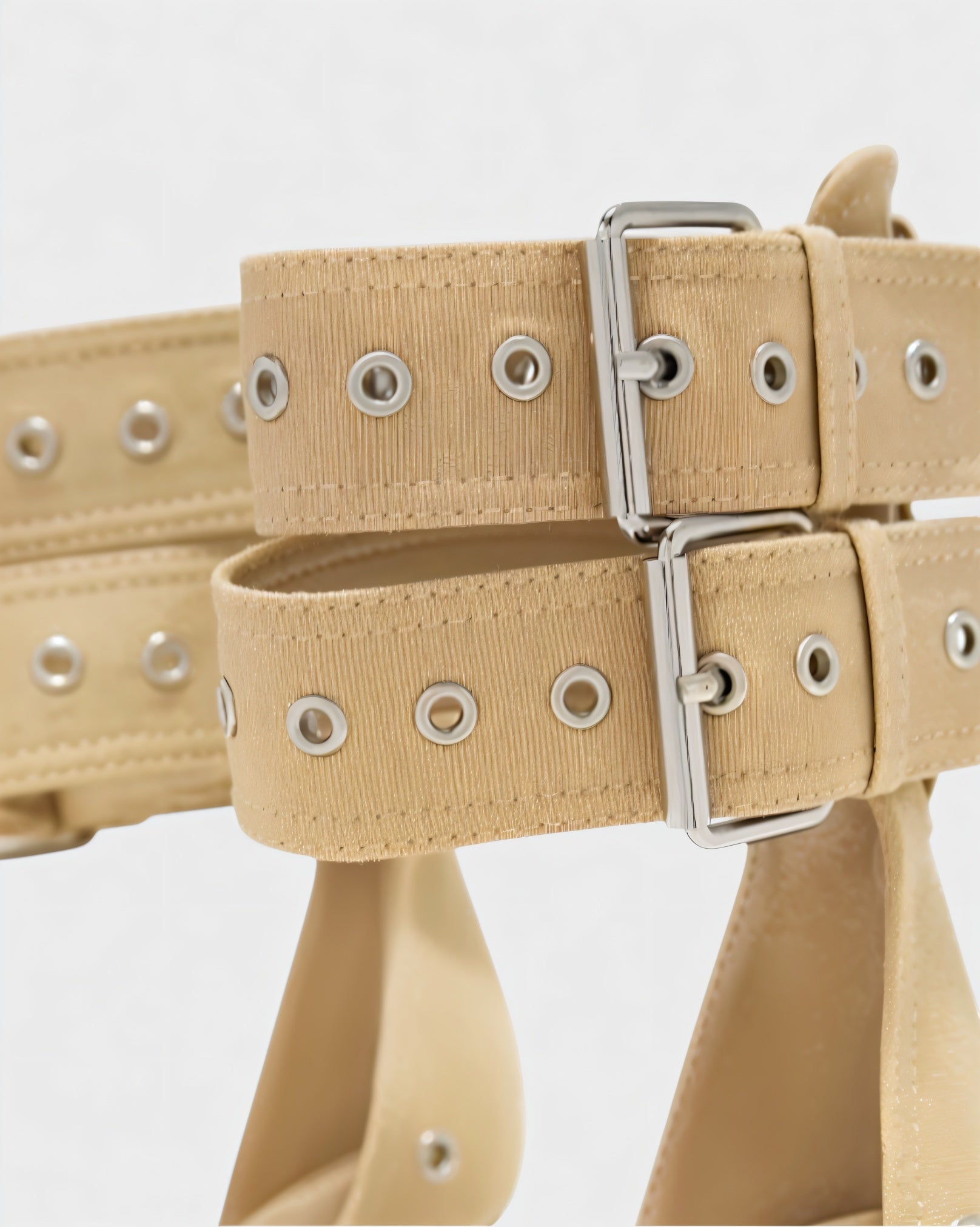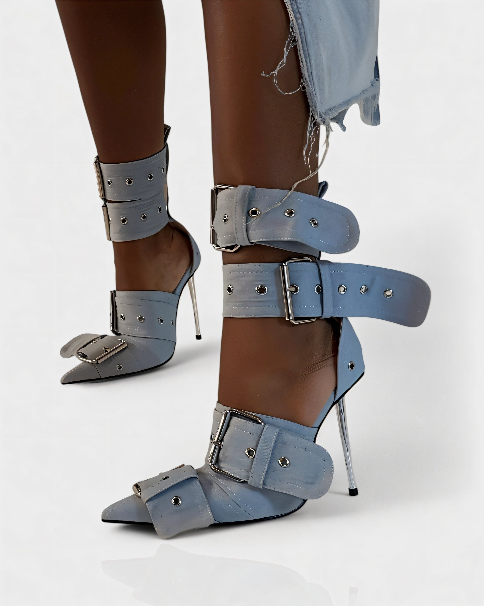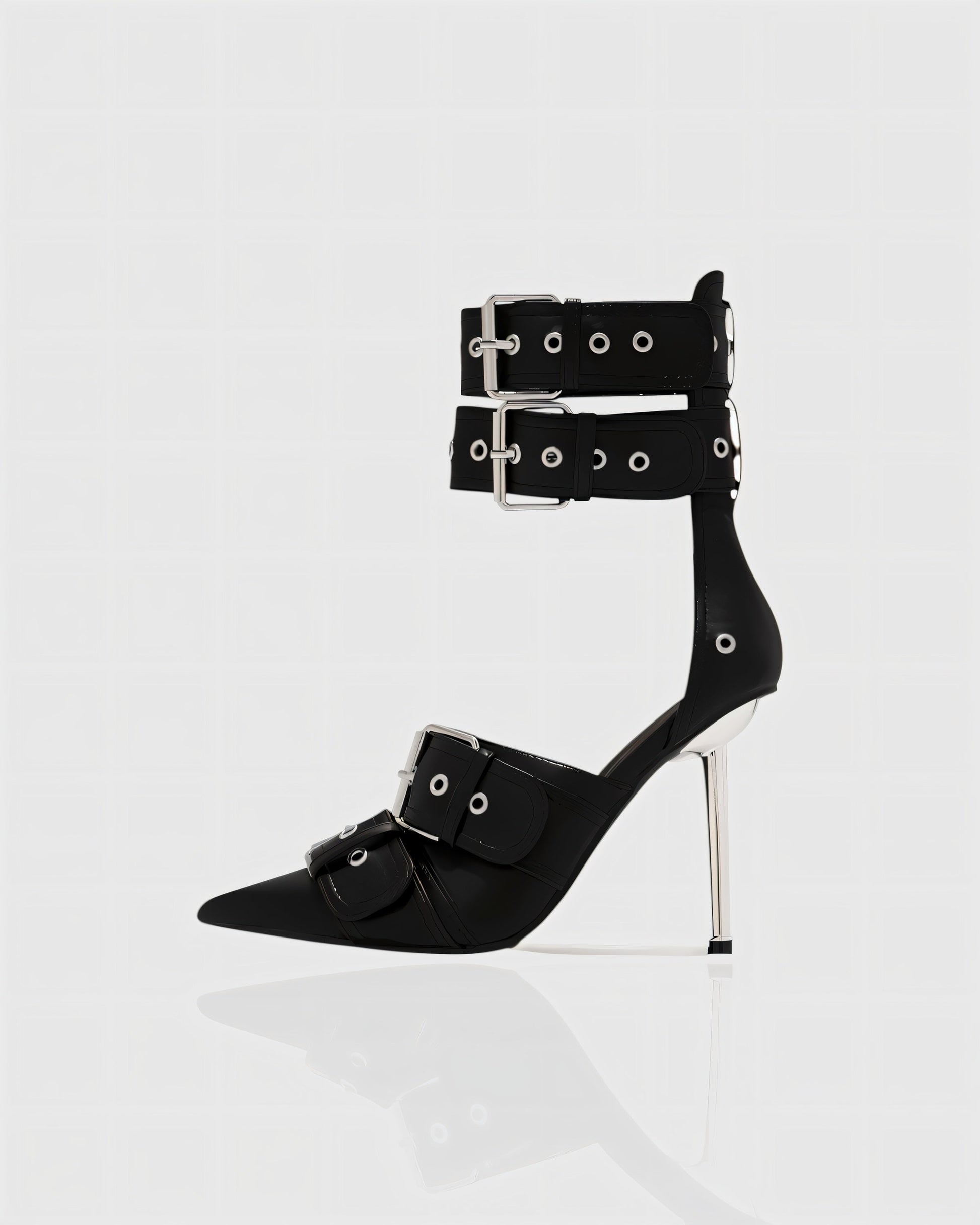 The Marilyn heels feature a bold, fashion-forward design with oversized buckle straps wrapping the ankle and vamp. Silver-tone hardware and grommet detailing elevate the structured silhouette, while the sharply pointed toe and sleek stiletto heel add a commanding edge. A true statement shoe with high-impact appeal.