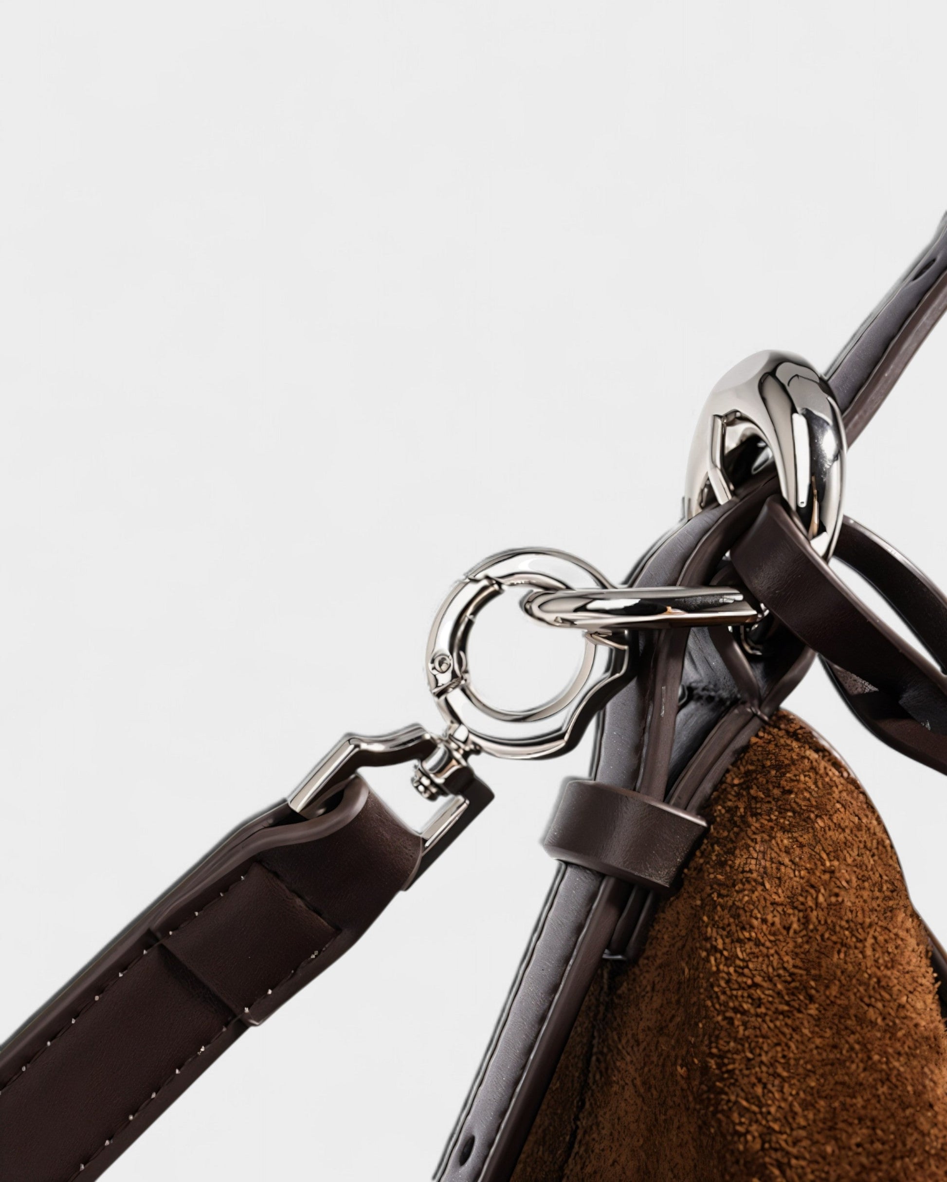 The Mavina Bag brings modern structure to a soft, slouchy suede body. Framed with sleek leather paneling and finished with a bold top handle and a turn lock closure, it’s a versatile tote that blends casual texture with a refined edge.