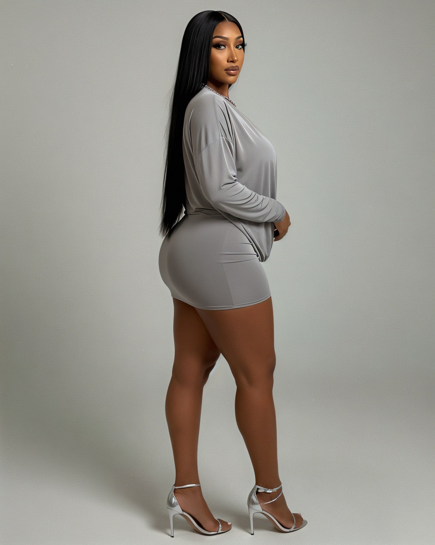 Serve sleek sophistication in the Mona Dress, designed with fluid draping and a curve-skimming finish. The plunging neckline adds daring contrast to the long sleeves, while the mini length keeps the silhouette bold and modern. Effortlessly chic, it’s a statement piece that balances elegance with edge.
