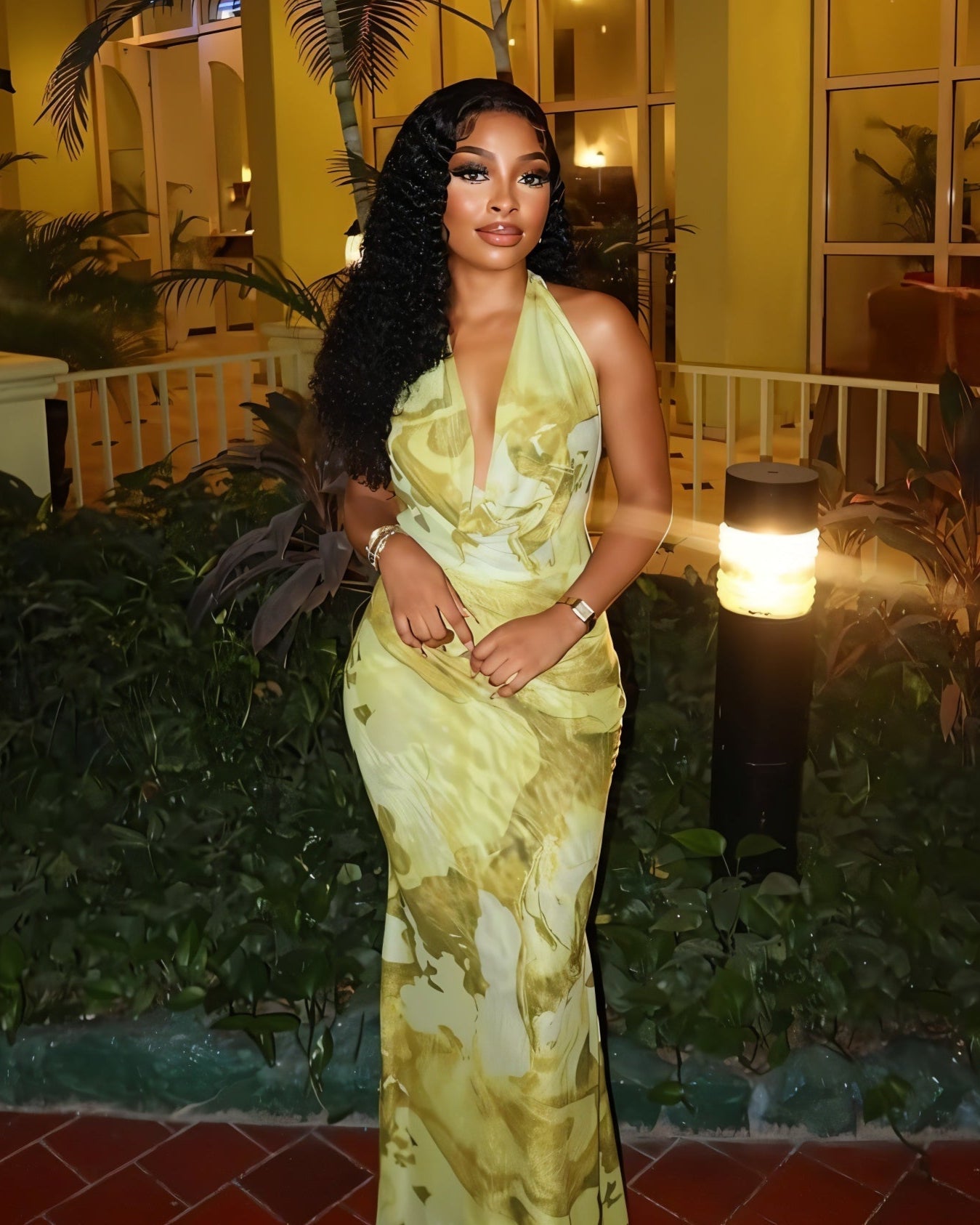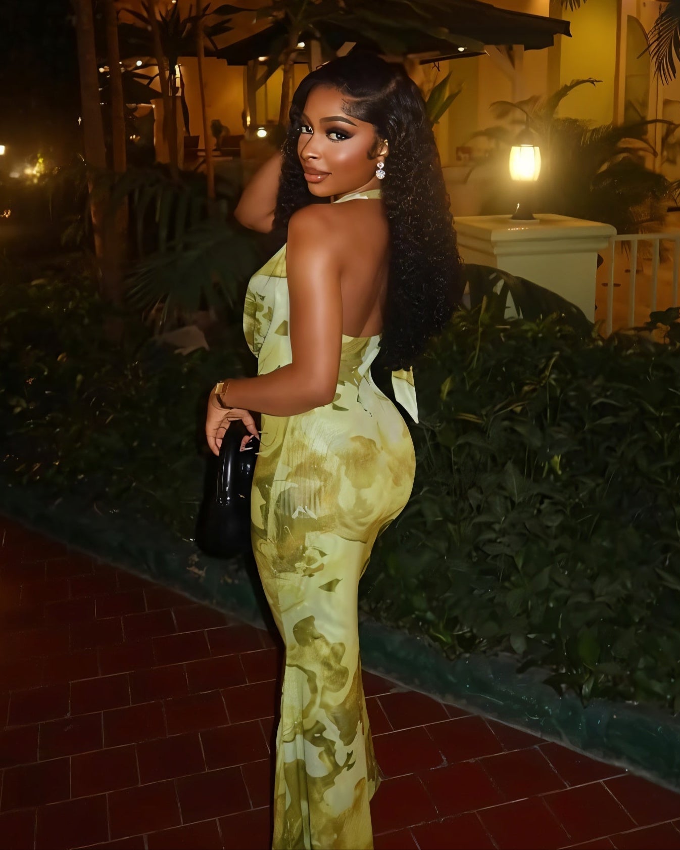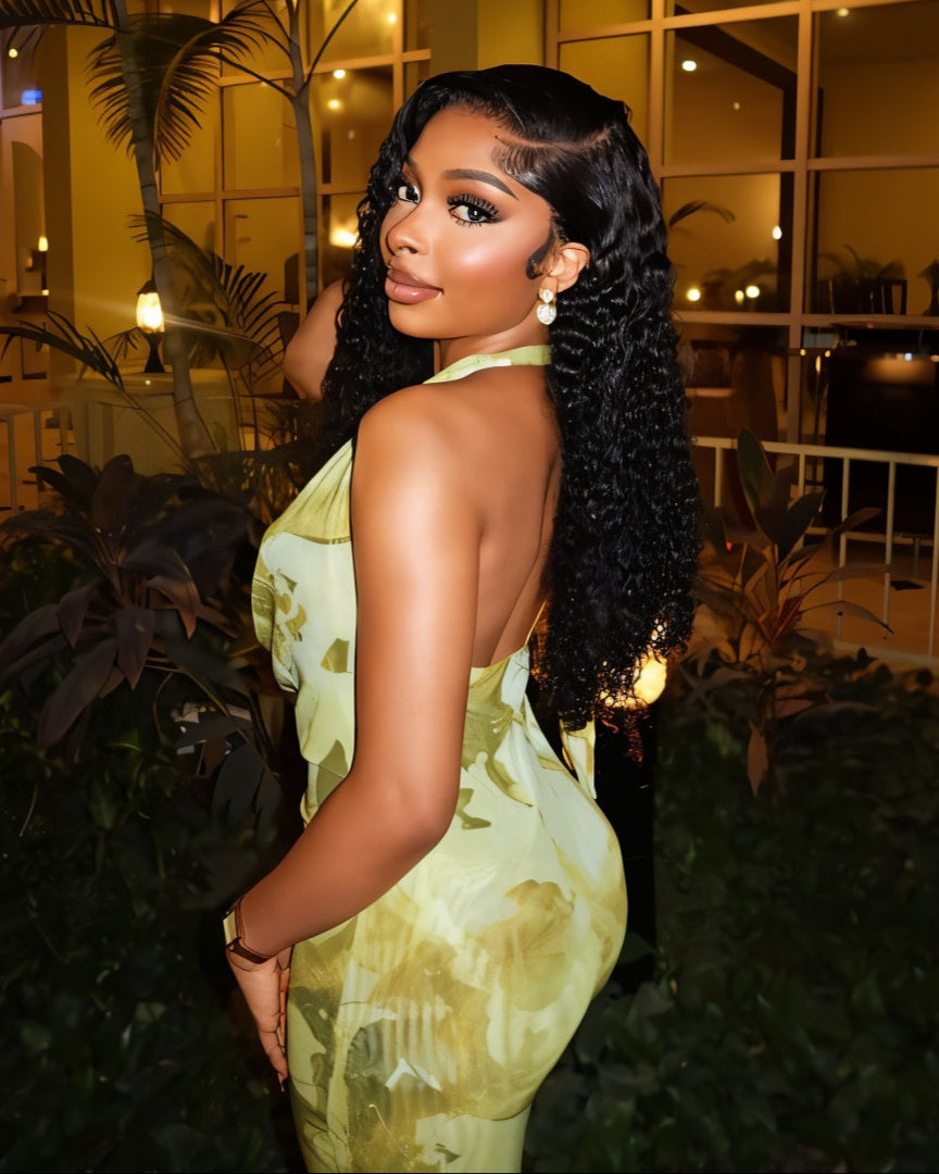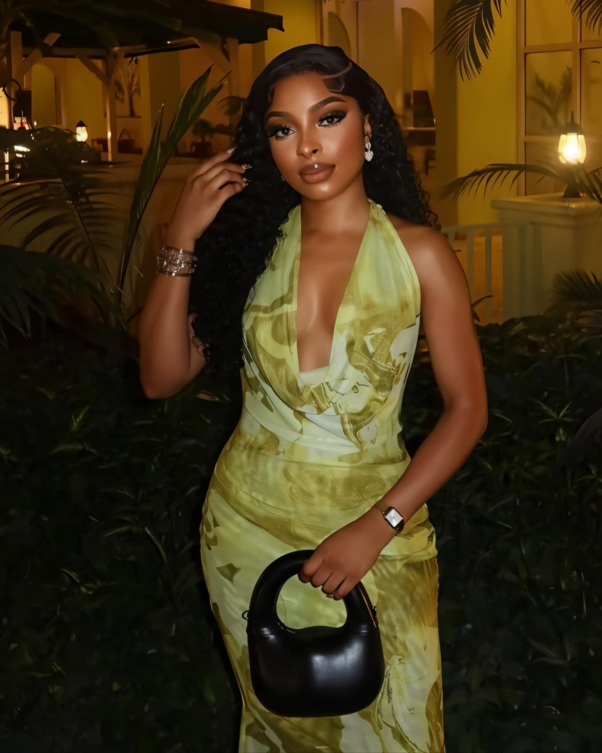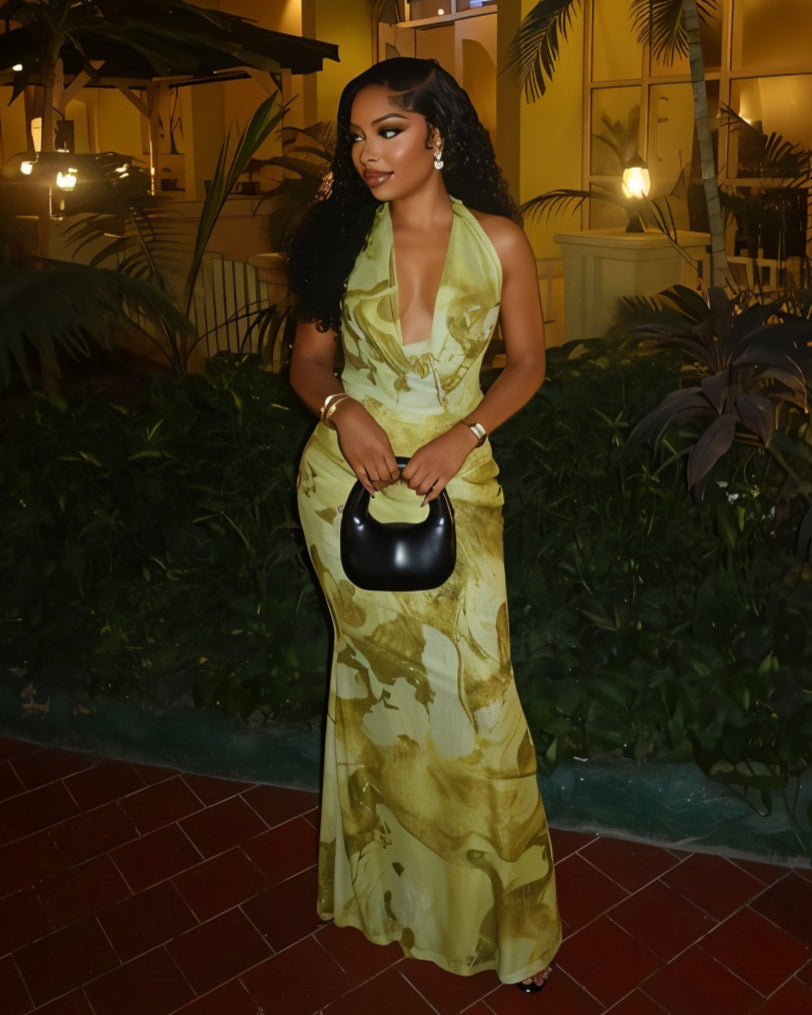 Step into goddess mode with Nuvia a statement maxi that drapes like a dream. Designed in a luxe olive marble print, this halter-neck dress hugs in all the right places, flowing into a graceful floor-length silhouette. The plunge neckline adds heat, while the soft color catches the light with every step.