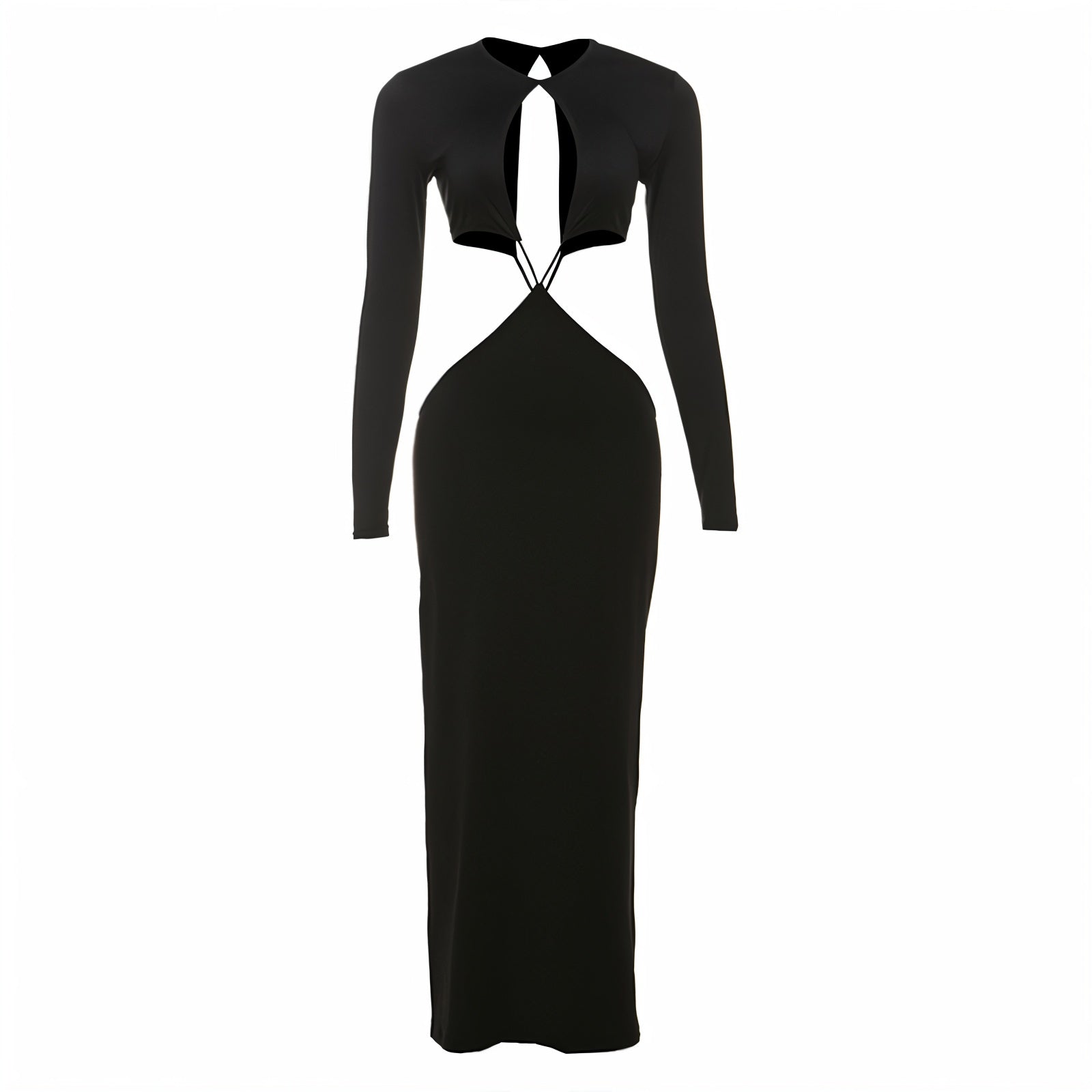The Parker Dress features a long sleeve and a full-length silhouette with daring cutouts across the chest, sides, and waist. A center bust opening and ultra-low hip cutout create a sculpted, high-impact look, while the stretchy fabric keeps everything sleek and body-hugging.