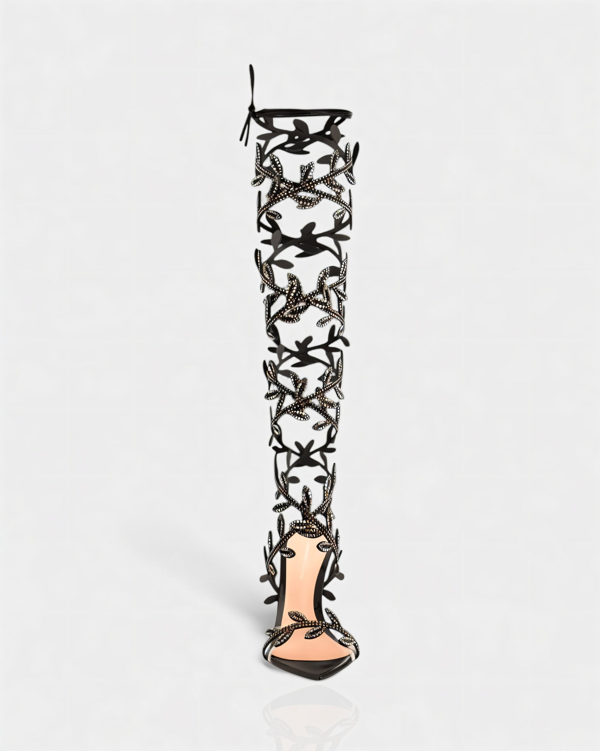 Turn heads in these enchanting high heels, featuring vine-like straps adorned with sparkling crystals that wrap elegantly up the leg. Finished with a sharp pointed toe and stiletto heel, this dramatic design makes an unforgettable statement.