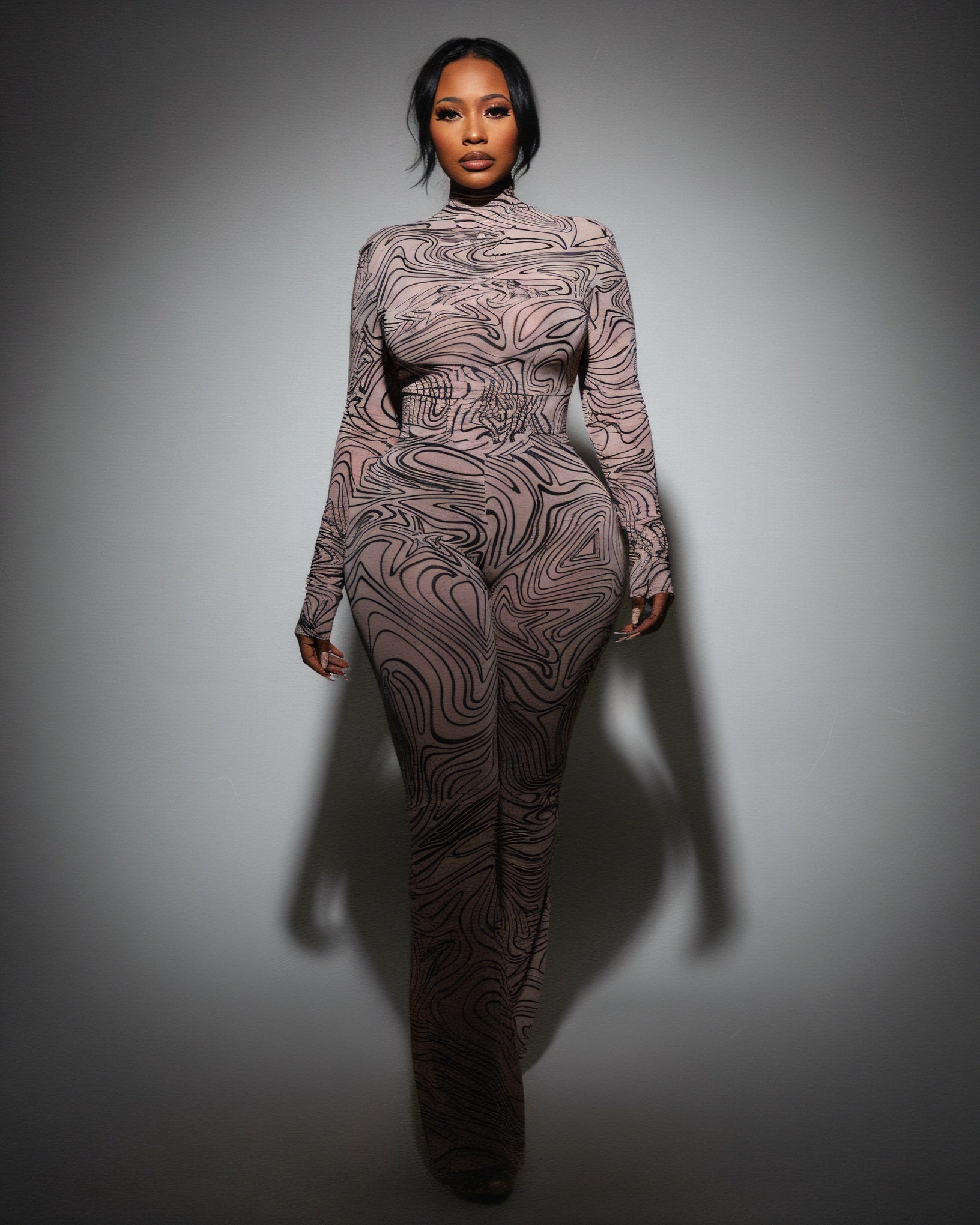 A statement two-piece that does the most. The sheer mesh top clings in all the right places, while the high-waisted flared pants move effortlessly. The bold zebra-like striped print adds a fierce edge, making this set impossible to ignore. Sleek, body-hugging, and made to steal the show.