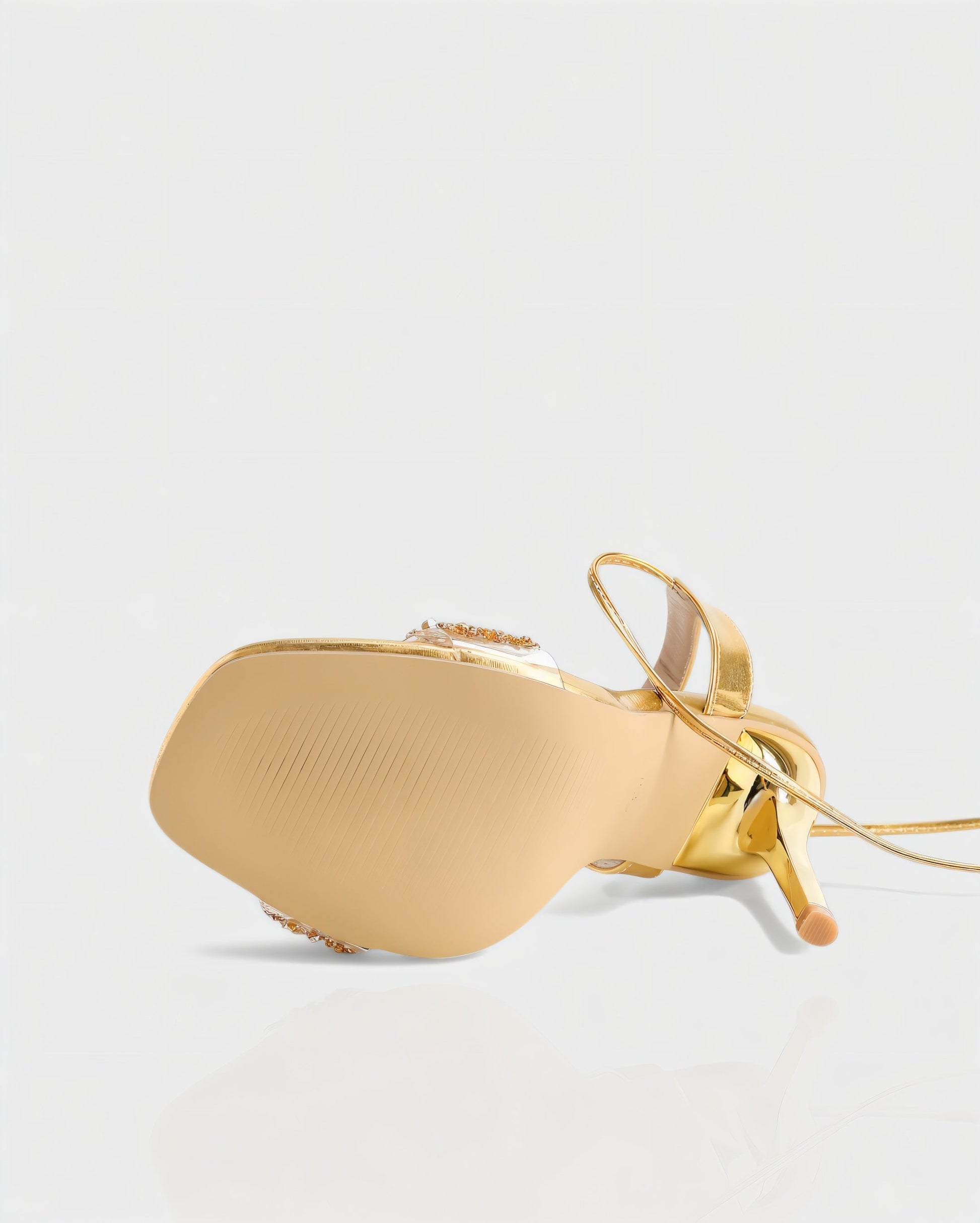 Golden glow, crystal shine. The Rona heels bring pure glam with a luxe metallic finish, sparkling crystal-encrusted toe strap, and sleek lace-up ties that climb the leg. Finished with a razor-sharp stiletto, these heels do all the talking no filter needed.