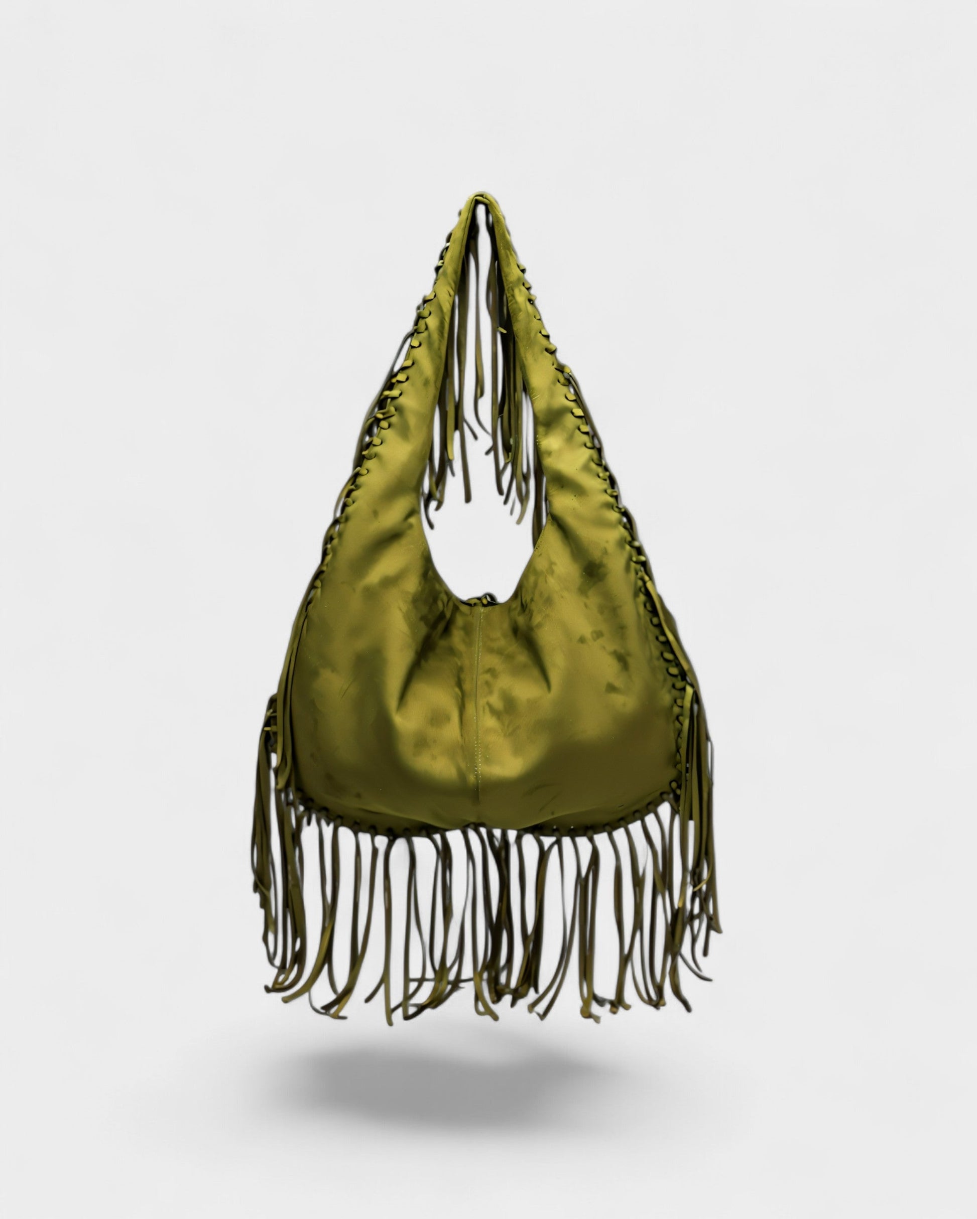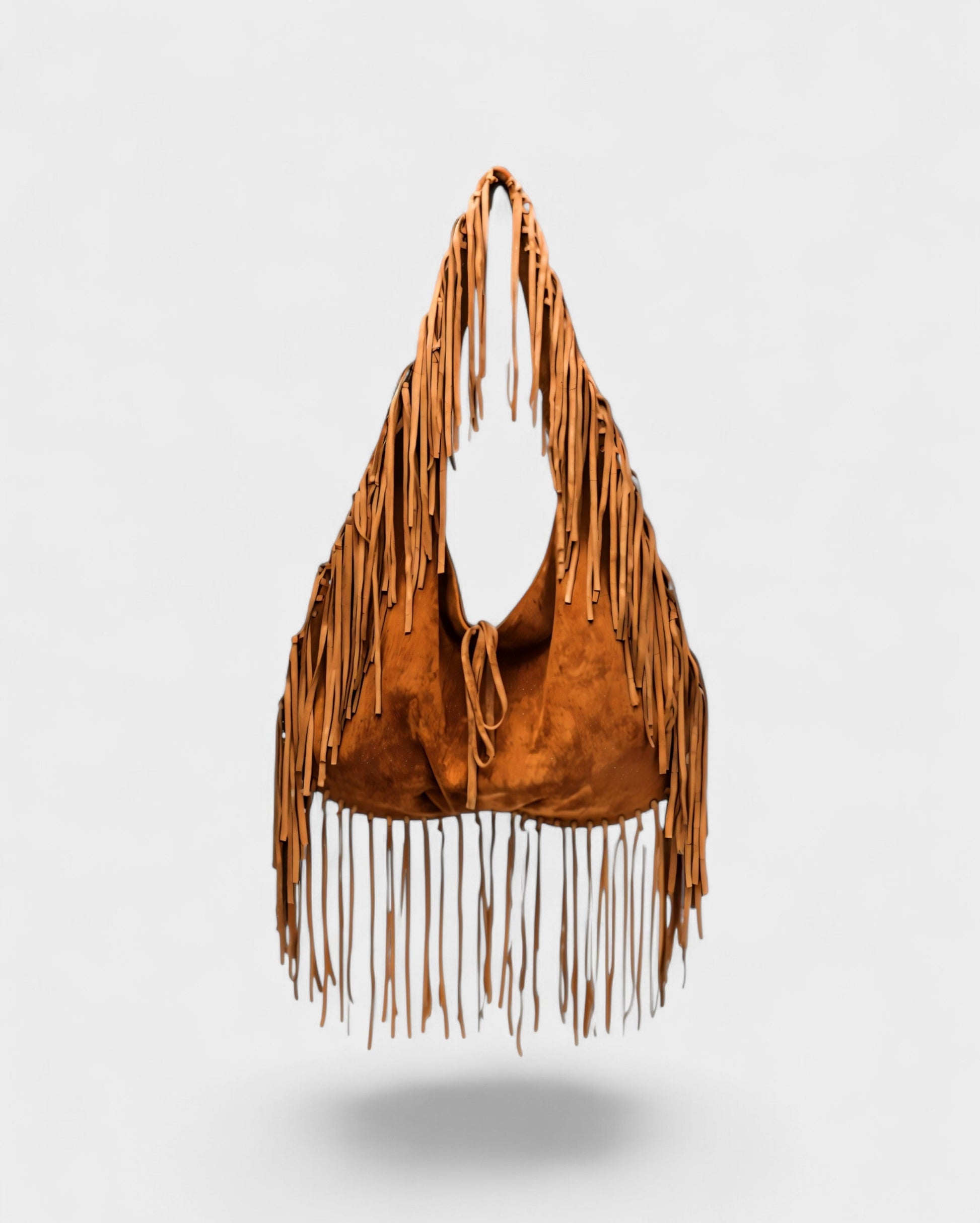 The Alvara bag is made from soft faux suede with a relaxed hobo silhouette, detailed with cascading fringe along the handle and hem. A lace-up design runs down the sides, adding structure and edge to its boho-inspired look. Finished with a knotted strap accent, this spacious bag brings texture and movement to any outfit.