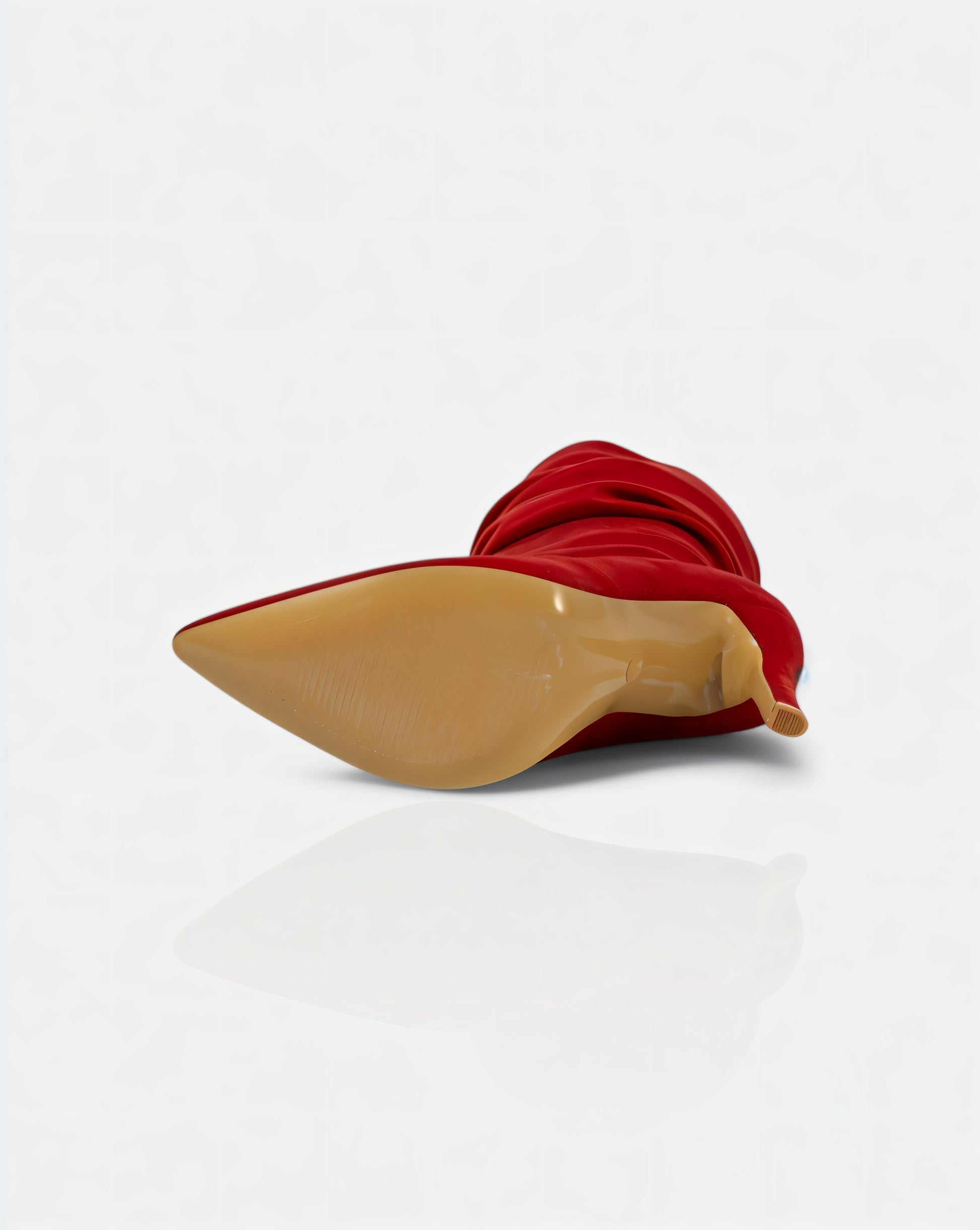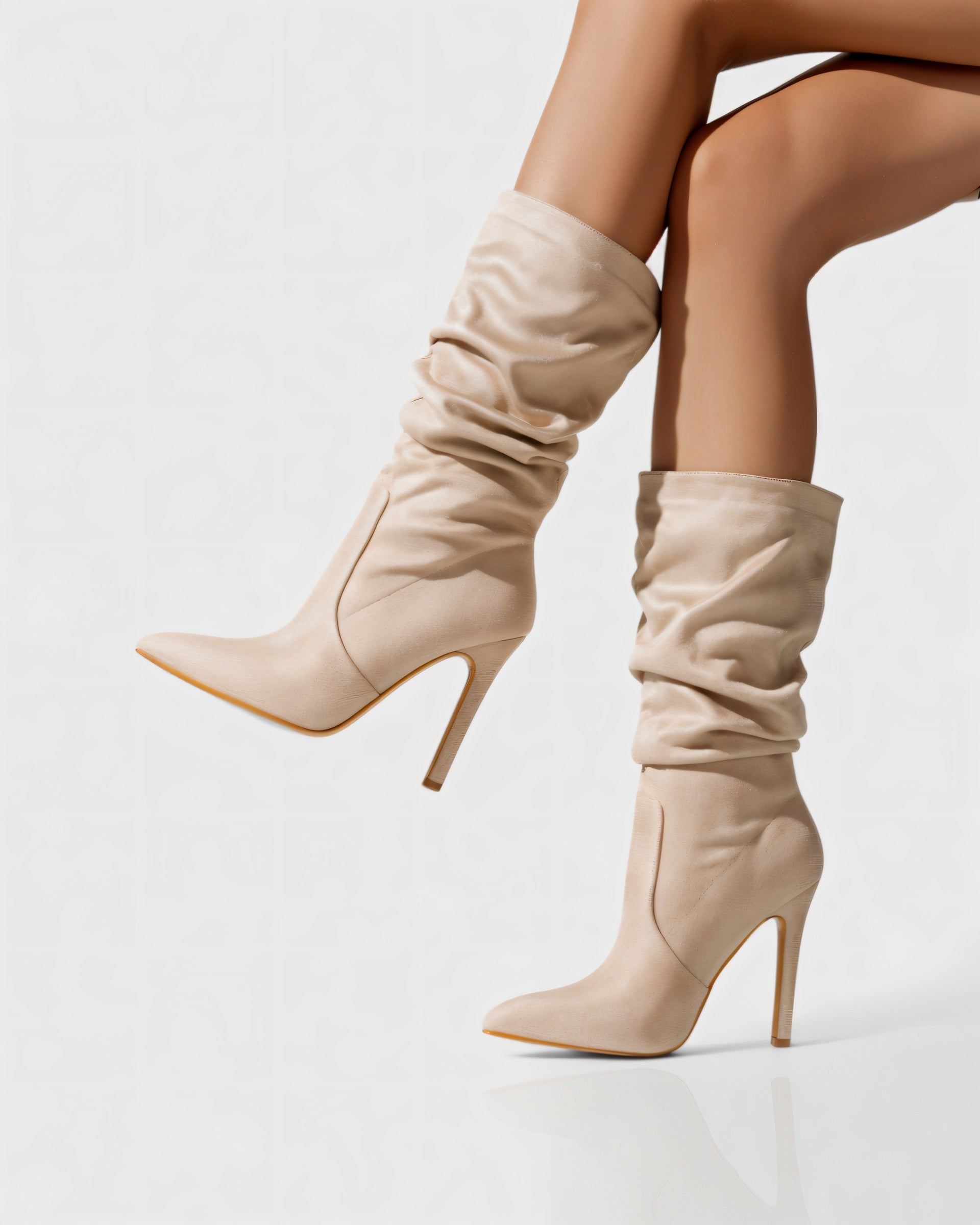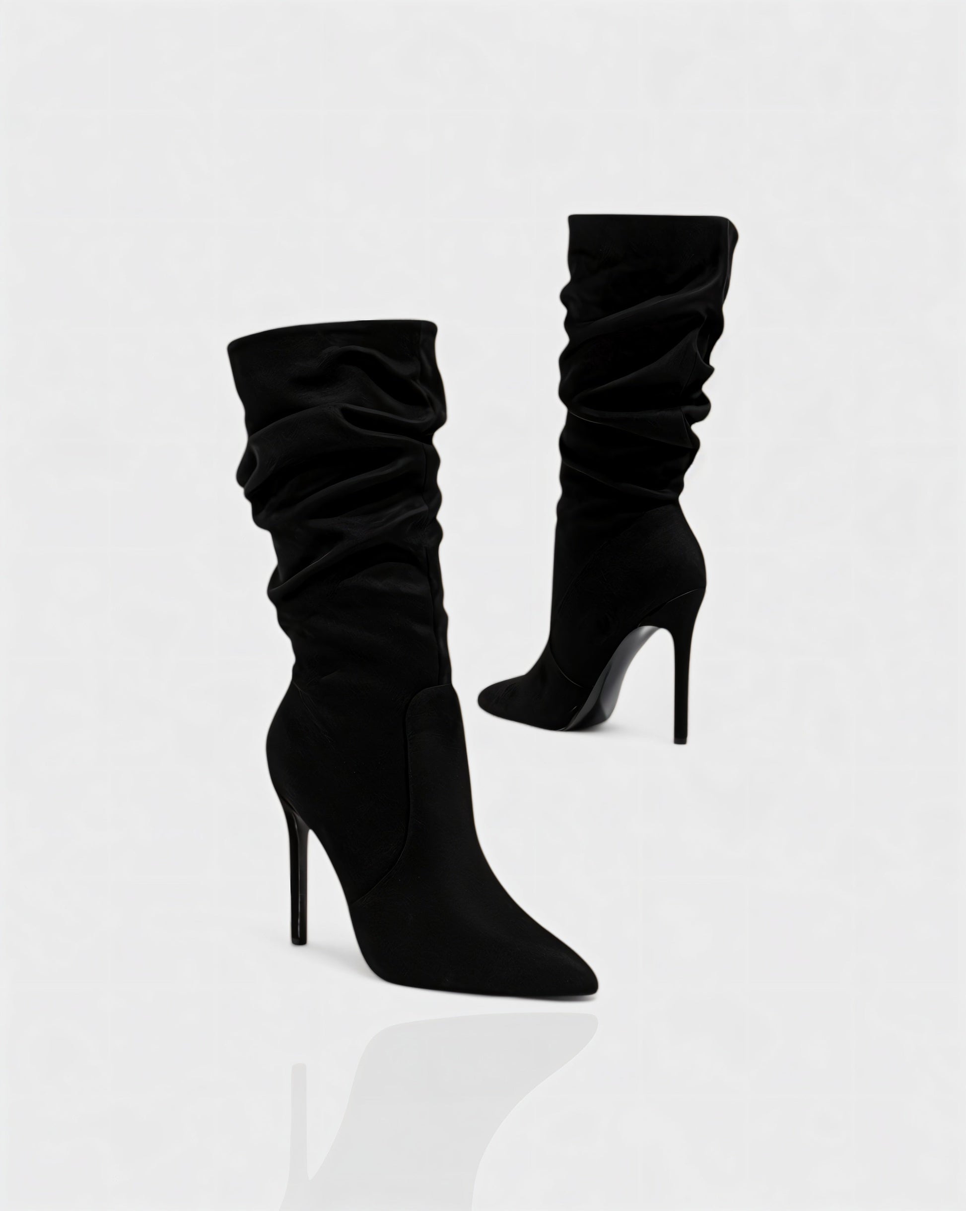 Make a striking entrance in these fierce stiletto boots, designed with a dramatic slouchy shaft that adds a relaxed yet sophisticated flair. The sharply pointed toe and stiletto heel create a powerful, leg-lengthening silhouette. Crafted from a soft, plush material, these boots offer a luxurious feel and a head-turning look.