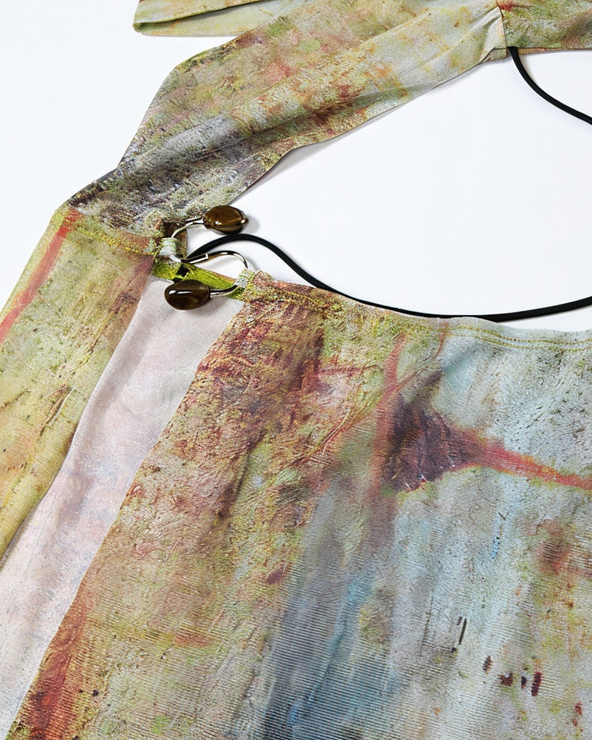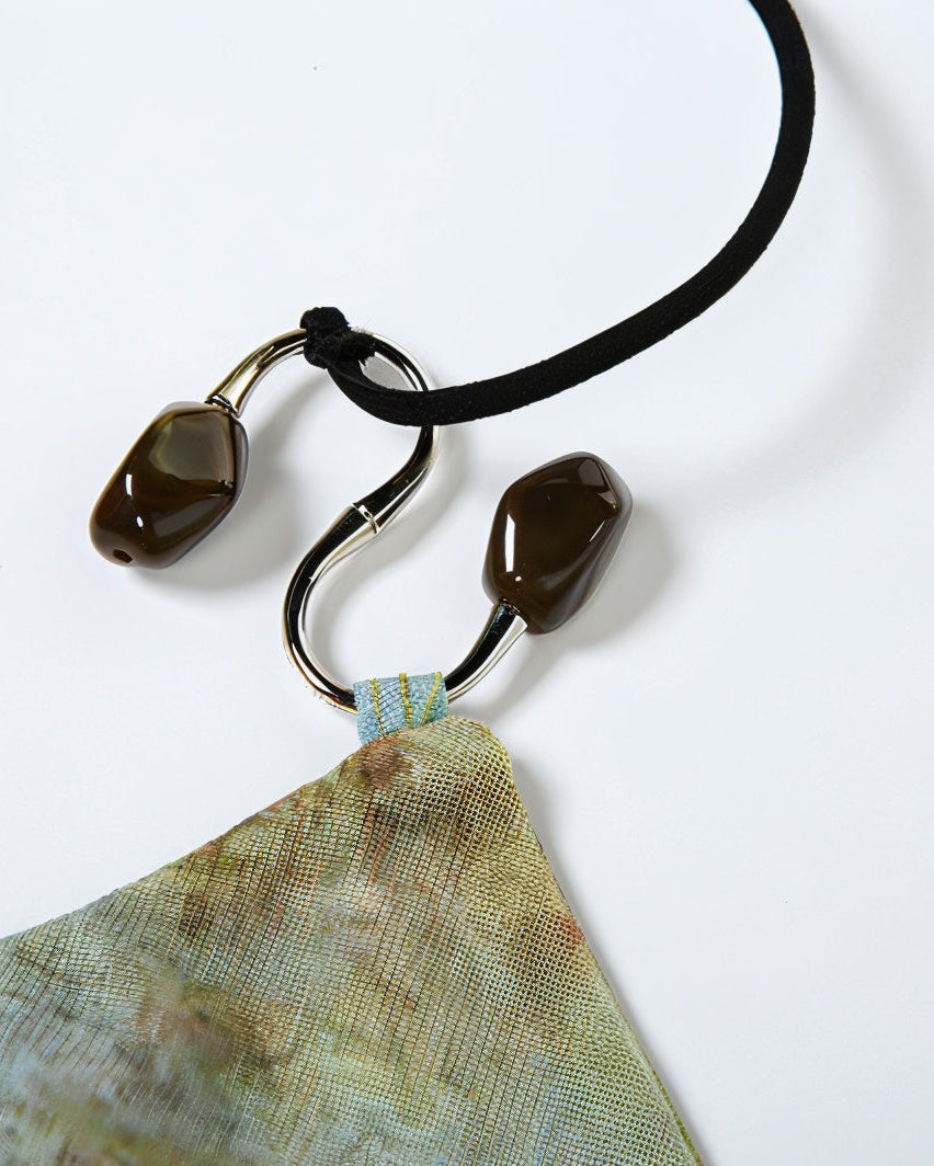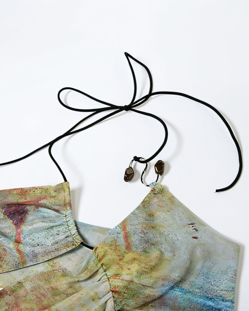 The Piper dress features a green earthy print with marbled metal trims at the neckline and hip strap. Its asymmetric wrap fit includes a thigh-high split, low-waist skirt, and adjustable elasticated tie straps. This dress is perfect for layering over swimwear.