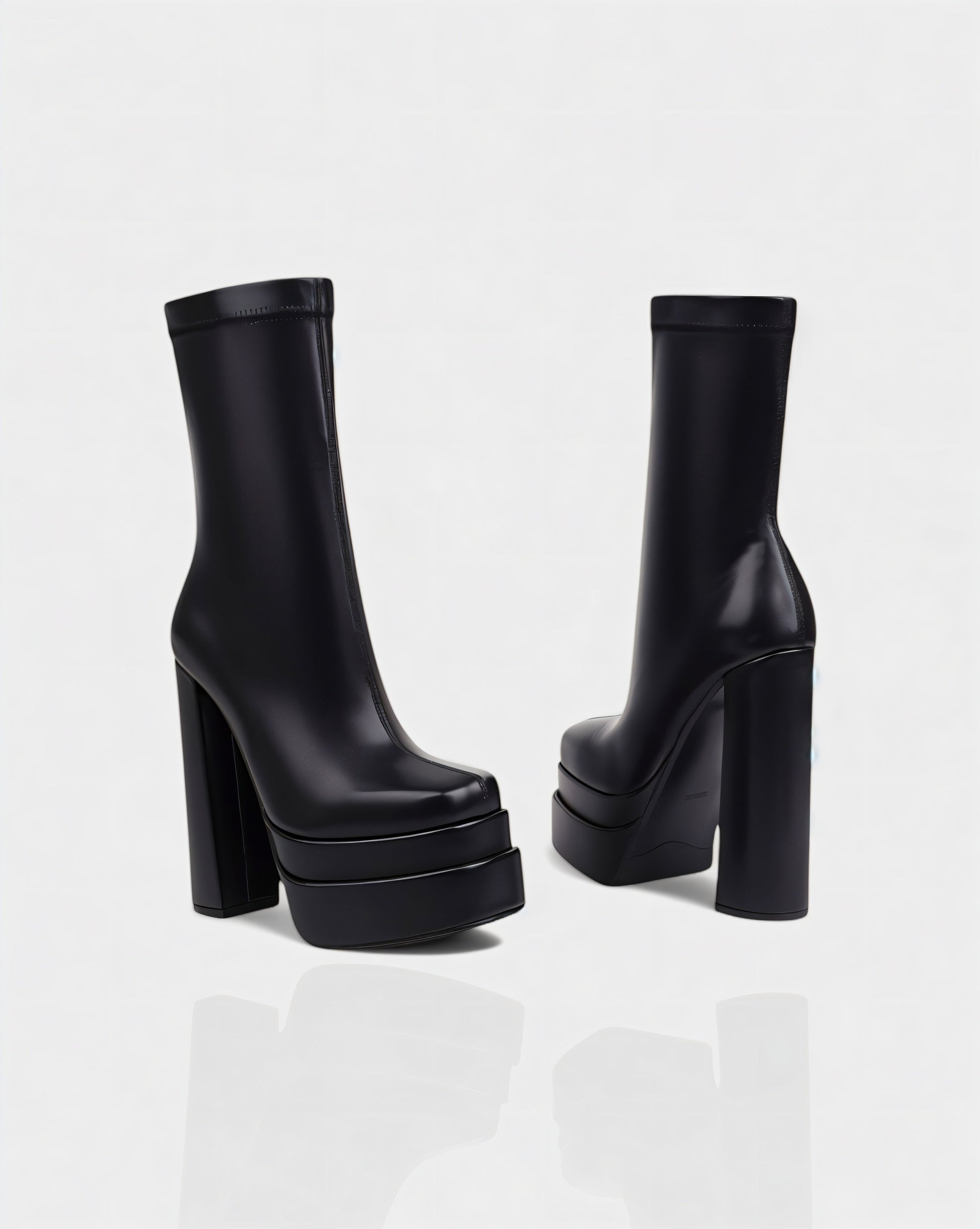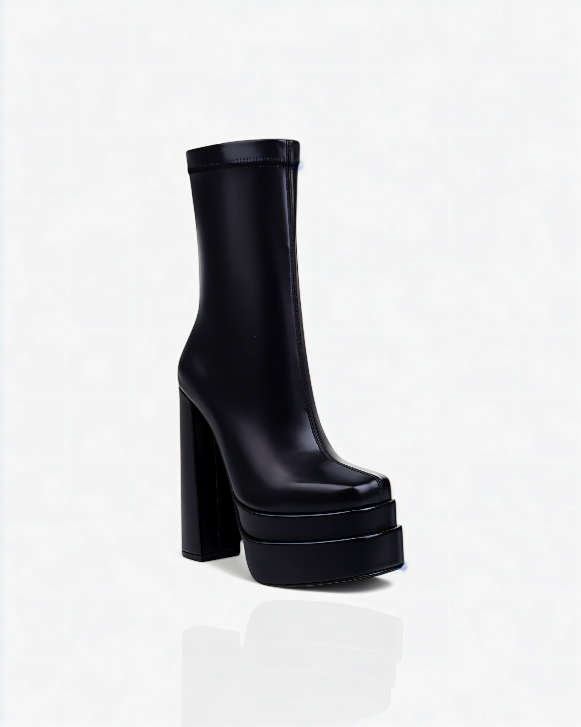 The Soreya Boots serve a bold attitude with sleek minimalism. Crafted in smooth faux leather, they feature a fitted ankle shaft with inner side zipper for ease, stacked platform sole, and a towering block heel. Clean, sharp, and unapologetically powerful.