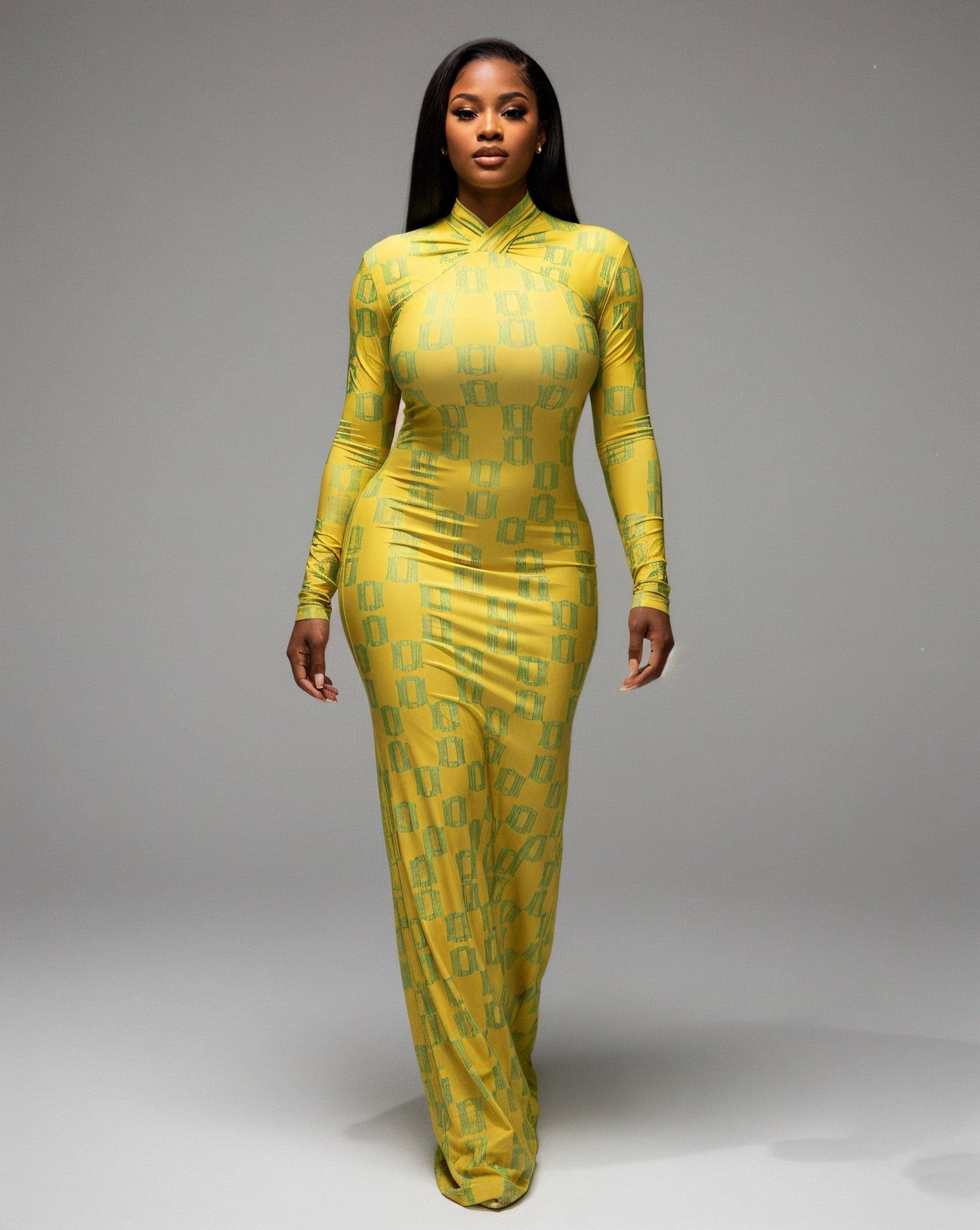 Turn heads in the Vian Maxi Dress a second-skin stunner that hugs your curves with effortless stretch. Featuring a sleek mock neckline, long sleeves, and allover geometric print, this body-hugging silhouette brings bold energy with zero compromise on comfort. Finished with a clean hem and subtle flare, it’s made to move with you.