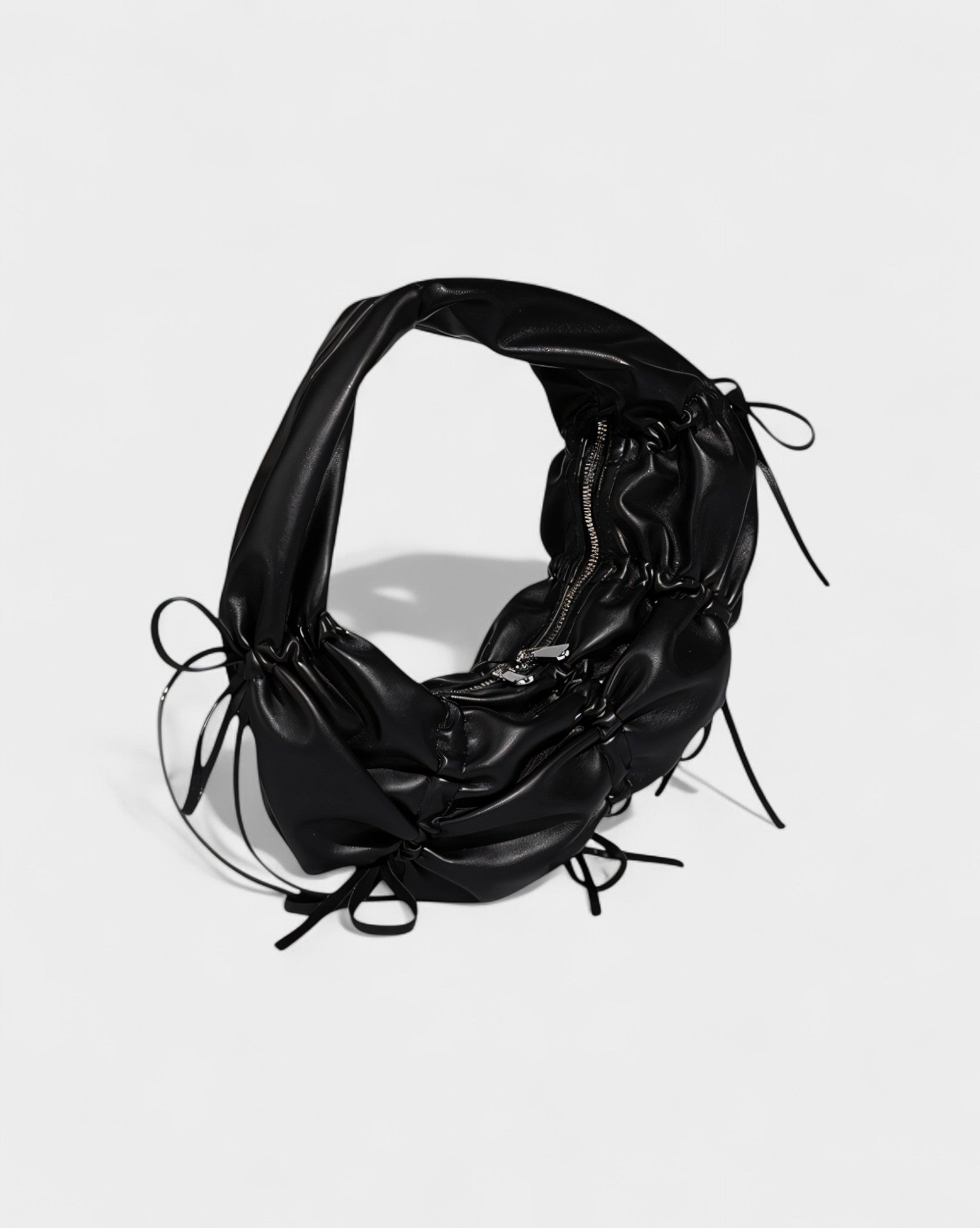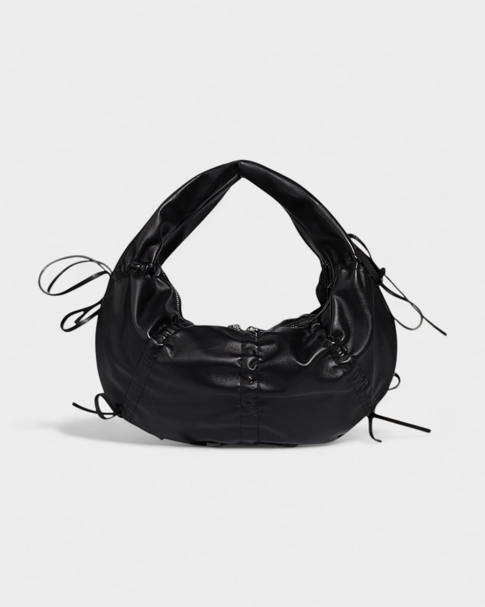Playful meets polished in the Yona Bag, designed with soft ruching and delicate bow-tie details along the sides. Its sculpted hobo silhouette adds modern edge, while the supple finish and gathered texture bring a touch of effortless femininity.